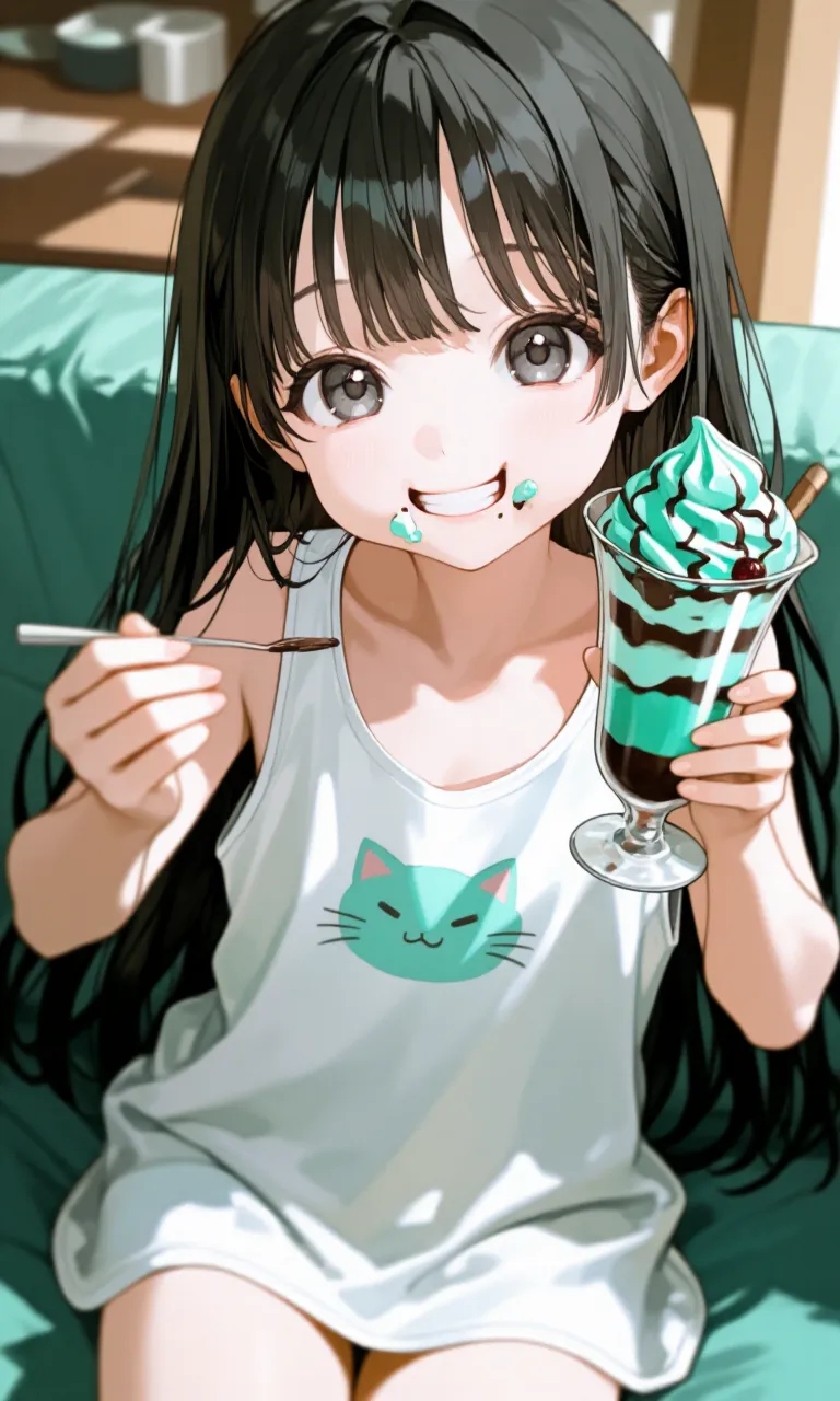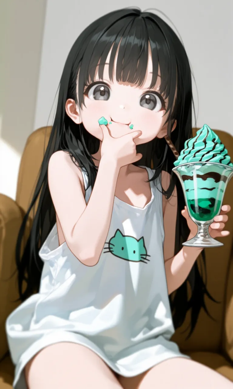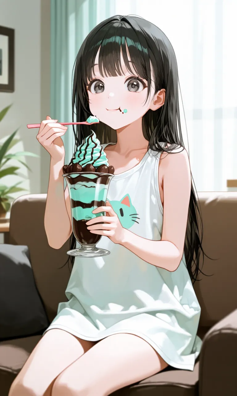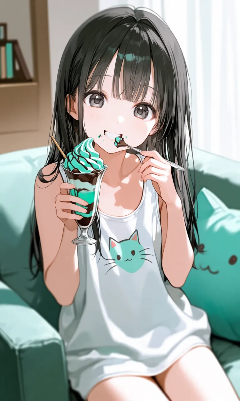 An illustration of a black-haired girl relaxing on a sofa in a room, eating mint ice cream. It has a relaxed atmosphere.