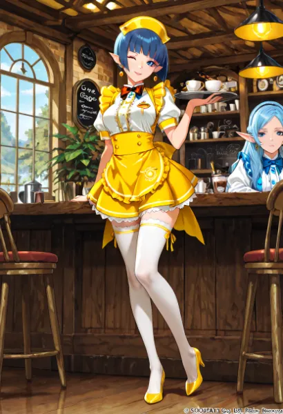 In a quaint cafe nestled in the snowy mountains, a blue-haired elf girl stands by the window. Dressed in a pink uniform, she holds a shoe in one hand while gazing at the silvery world outside. Perhaps she's waiting for adventurers she met on her journey. The warm aroma of coffee fills the cozy interior, adding a gentle touch to her quiet daily life. The impending encounter might weave a new chapter in her adventure.