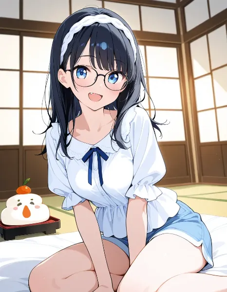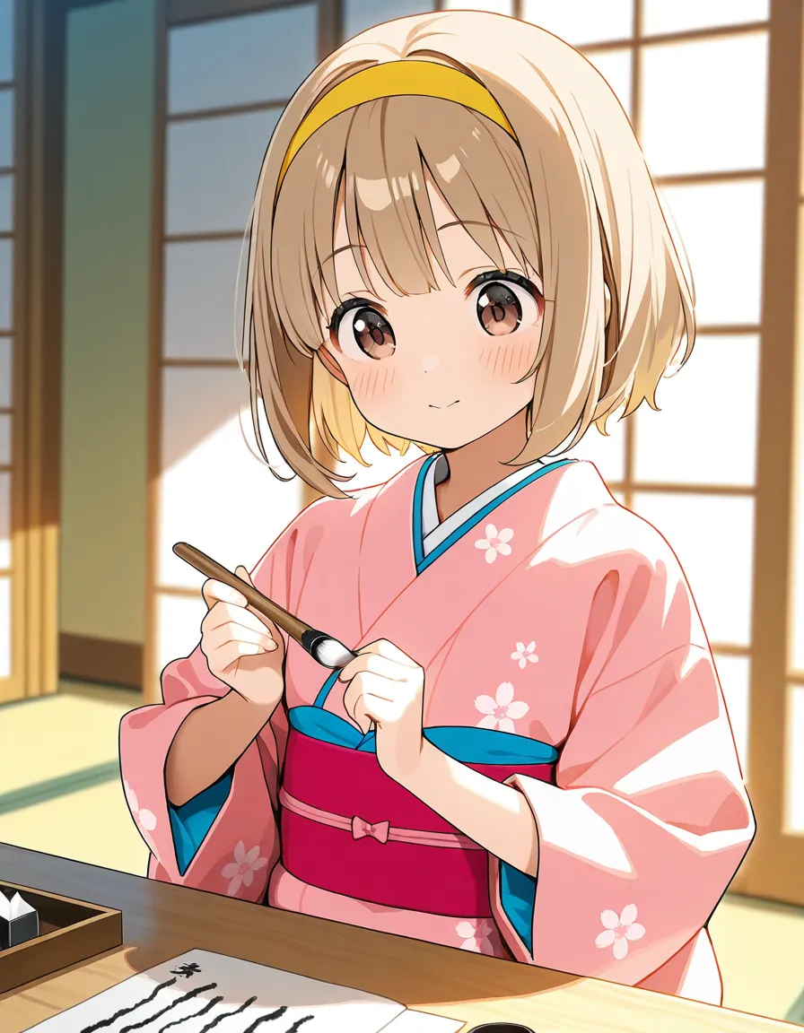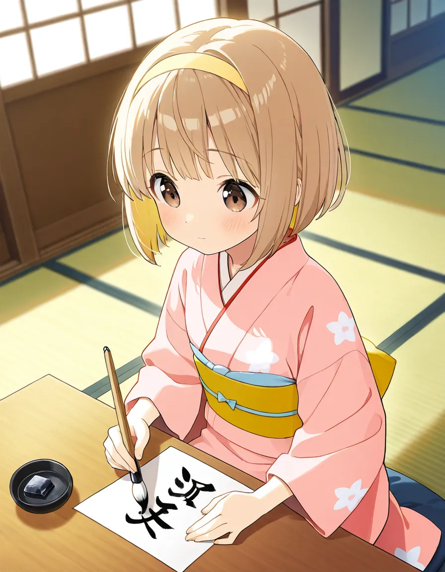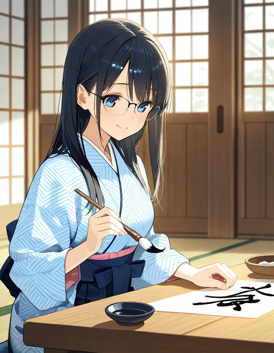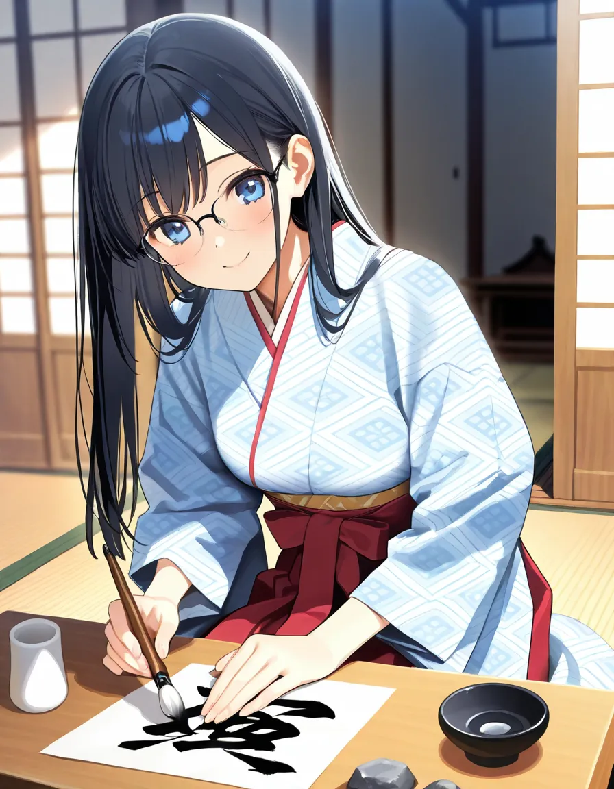 parameters: ((Masterpiece)), ((top quality)), (very detailed), ((kawaii)), cute, (lovely), animated style illustration, (A serene Japanese Shrine:1.5), indoor, (solo), 1girl, cute girl, (beautiful blue eyes), (beautiful black hair), (long hair), (glasses:1.2), slim, slender, medium breast, (beautiful breast), (happy smile:1.2), wearing an elegant kimono, (practicing Japanese calligraphy (kakizome) with a brush:1.3), sitting at a low table inside a traditional tatami room, Soft morning light coming through shoji windows, ink stone and Washi paper on the desk, calm and focused expression, delicate hands holding the brush, long flowing hair, peaceful atmosphere, detailed kimono patterns, traditional Japanese interior, soft lighting, depth of field, cinematic composition.