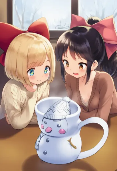 parameters: 2girls,loli,anime style,indoor,sticker shop,colorful display,product shelves,excited atmosphere,holding items,(snowman mug:1.3),winter themed mugs,exchanging mugs,playful interaction,first girl (blonde hair:1.2),(short hair:1.1),(bob hair:1.1),(hair bow:1.4),(red bow:1.3),blue eyes,sparkling eyes,wide smile,cheerful expression,small breasts,casual winter clothing,sweater,second girl (black hair:1.2),long hair,ponytail,brown eyes,laughing expression,joyful face,medium breasts,cardigan,both girls standing,facing each other,arms extended,hands holding mugs,showing mugs to each other,animated gestures,full body visible,knee-length skirt,leggings,boots,shop interior background,bright lighting,cute decorations,friendly mood,(comical atmosphere:1.2),dynamic pose,upper body leaning slightly forward,feet shoulder-width apart,(masterpiece:1.3),(best quality:1.3),(very aesthetic:1.2),(absurdres:1.2),