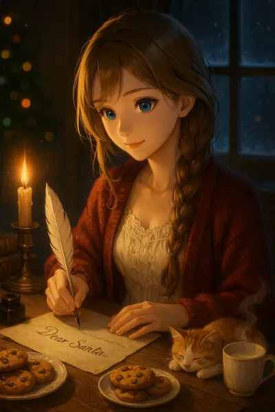 In a room bathed in soft morning light, the girl sits quietly, holding her breath. Beside her, a curious cat reaches out to a red-ribboned present. 'Shh, be quiet,' her finger presses to her lips, creating a moment of shared secrecy. Could this be a surprise for the family, or a hidden wish in the girl's heart? The cat's eyes sparkle, hinting at the beginning of an unfolding story.