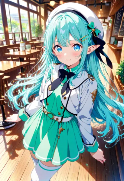 In an old European-style town, a blue-haired elf girl crouches down, searching for something. Wearing a beret and school uniform, she might be looking for a lost little bird. With her hand on the cobblestone alley, her curious eyes scan the surroundings. In this quiet corner of daily life, her small adventure quietly begins. Perhaps she'll discover a hidden treasure in that moment.