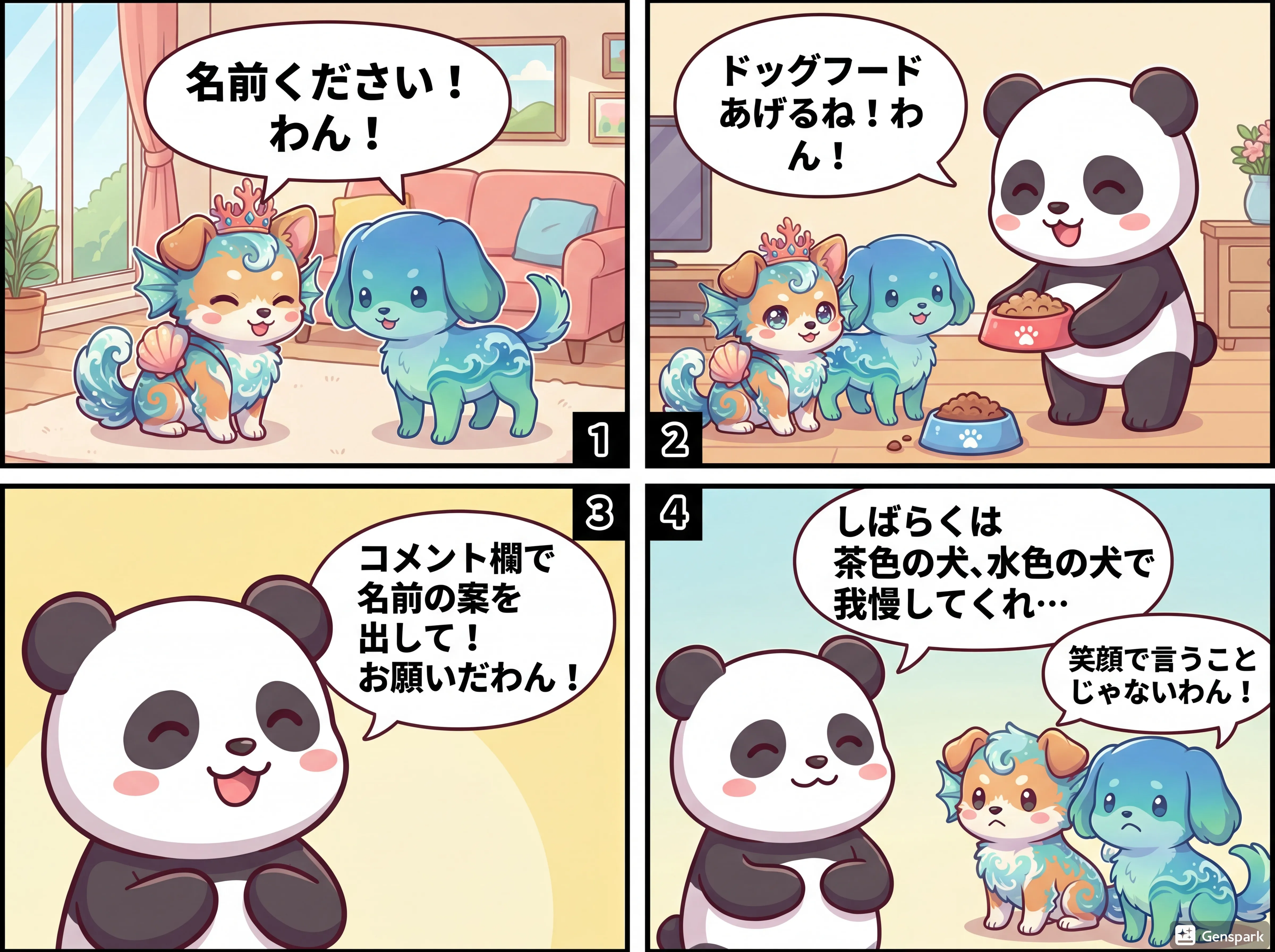 サンゴみたいな冠被ってる方は,サンゴをさかさ読みでゴン,青い方はマーメイドからとってマメ,とか考えました