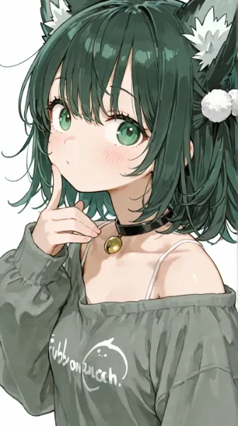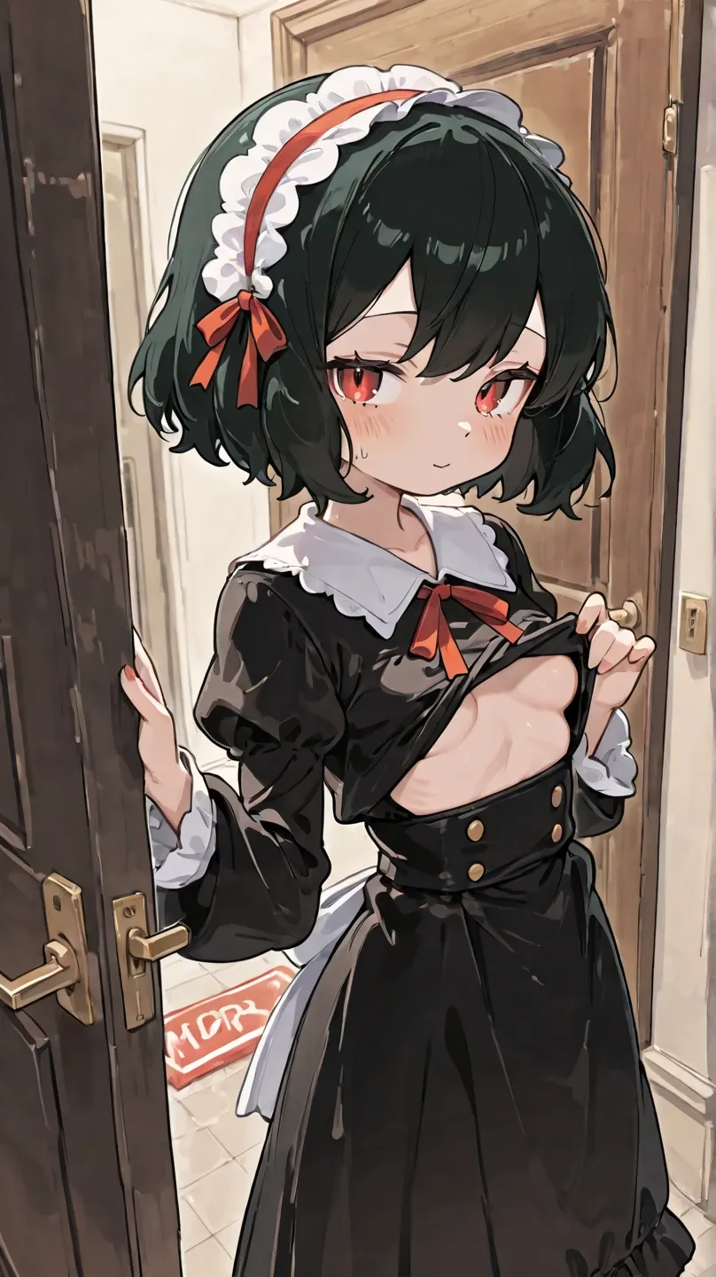 A cute illustration of a black-haired girl in a maid outfit holding a paper in front of a blackboard.