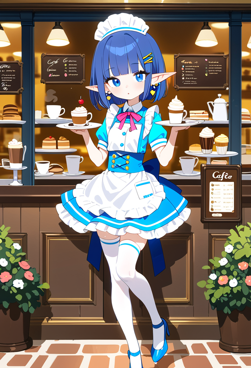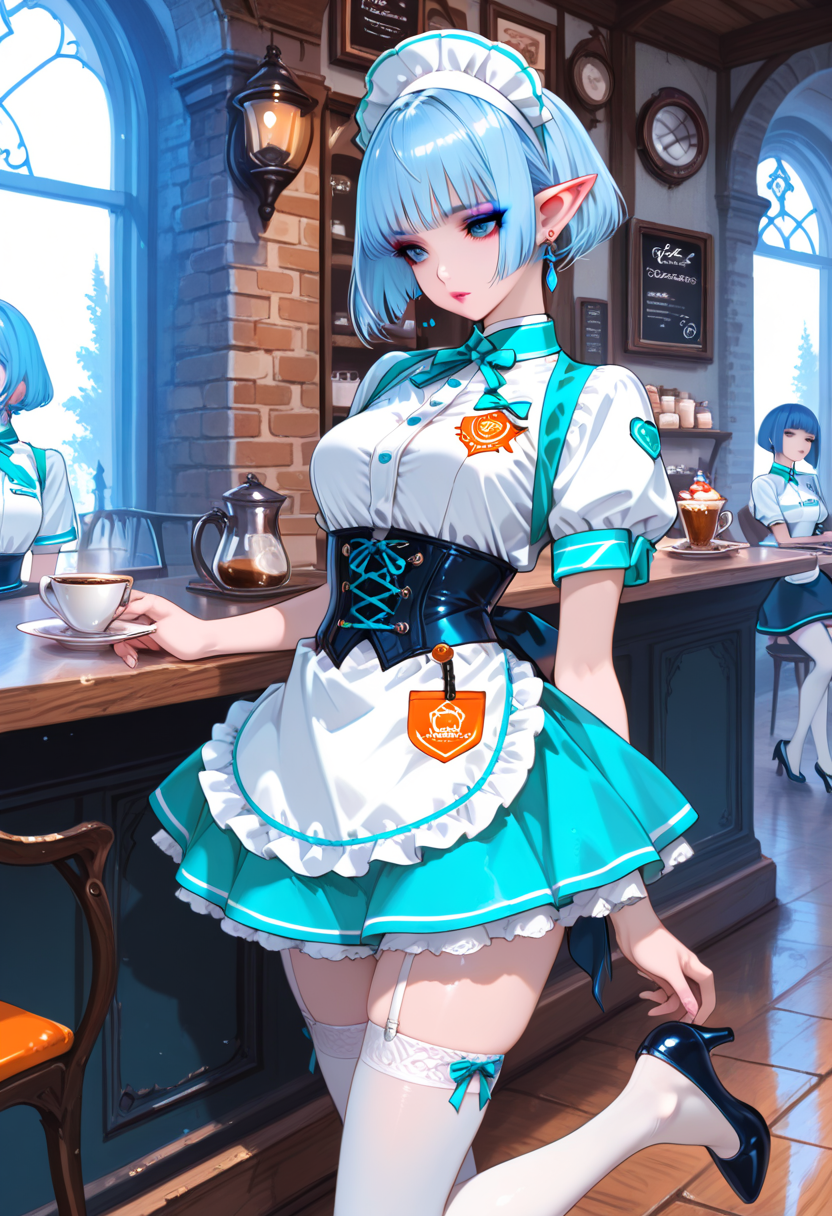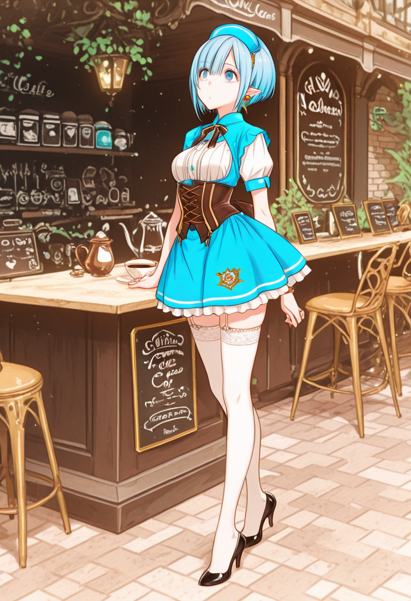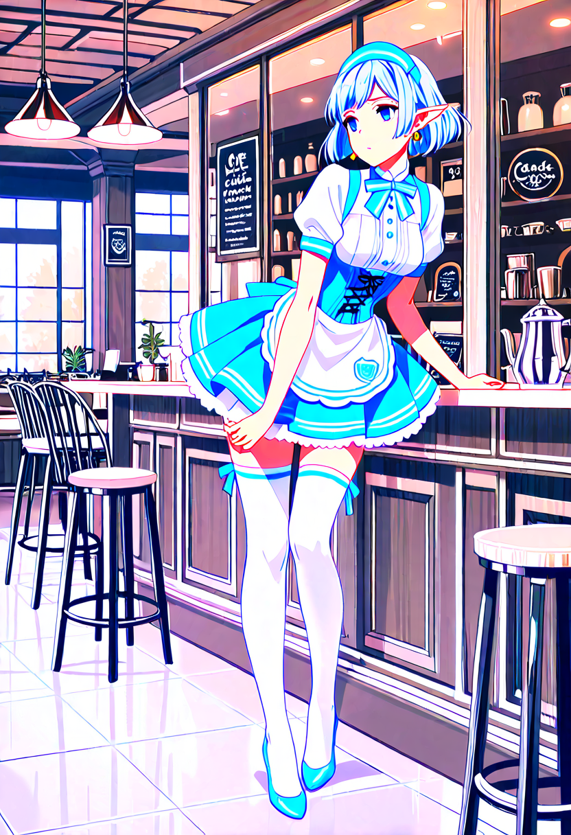 In a bustling fantasy cafe, the blue-haired elf maid, Lia, takes a moment to relax amid the aroma of freshly brewed coffee. Gazing at the snowy landscape outside, she reflects on the day's adventures. As regular adventurers drop by, what secret stories will she weave in this cozy spot? Sweet treats and warm tea invoke the magic of everyday life.