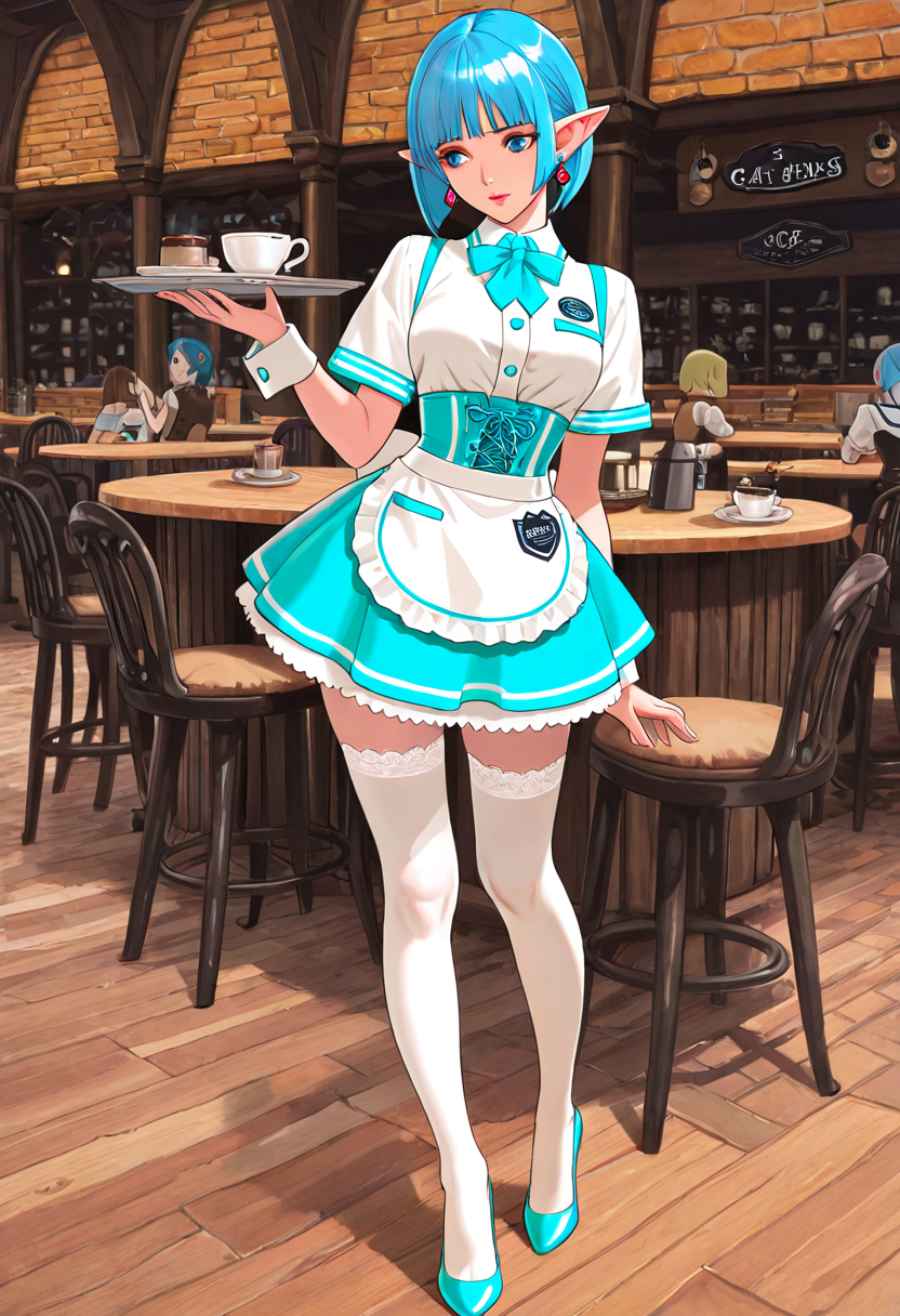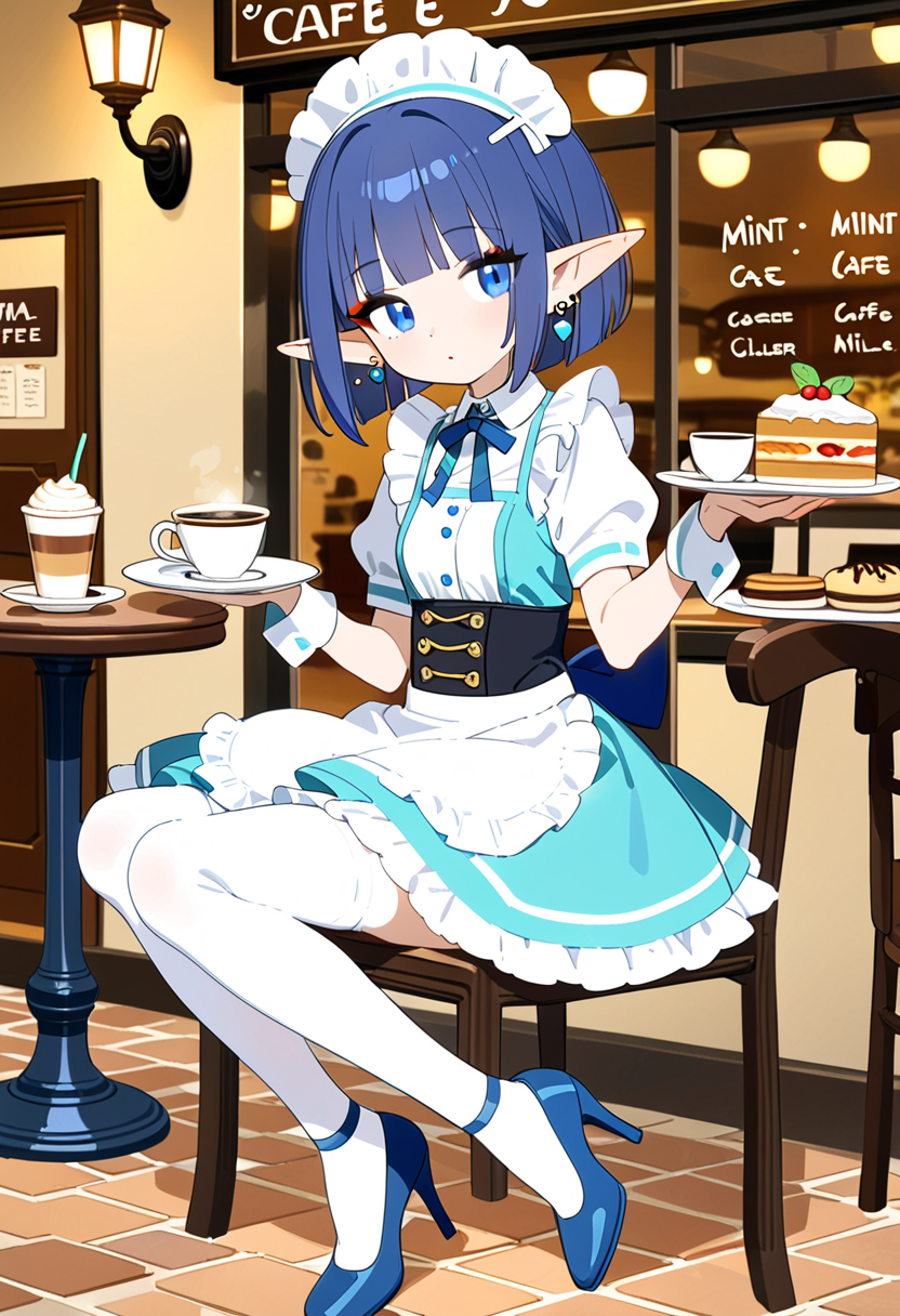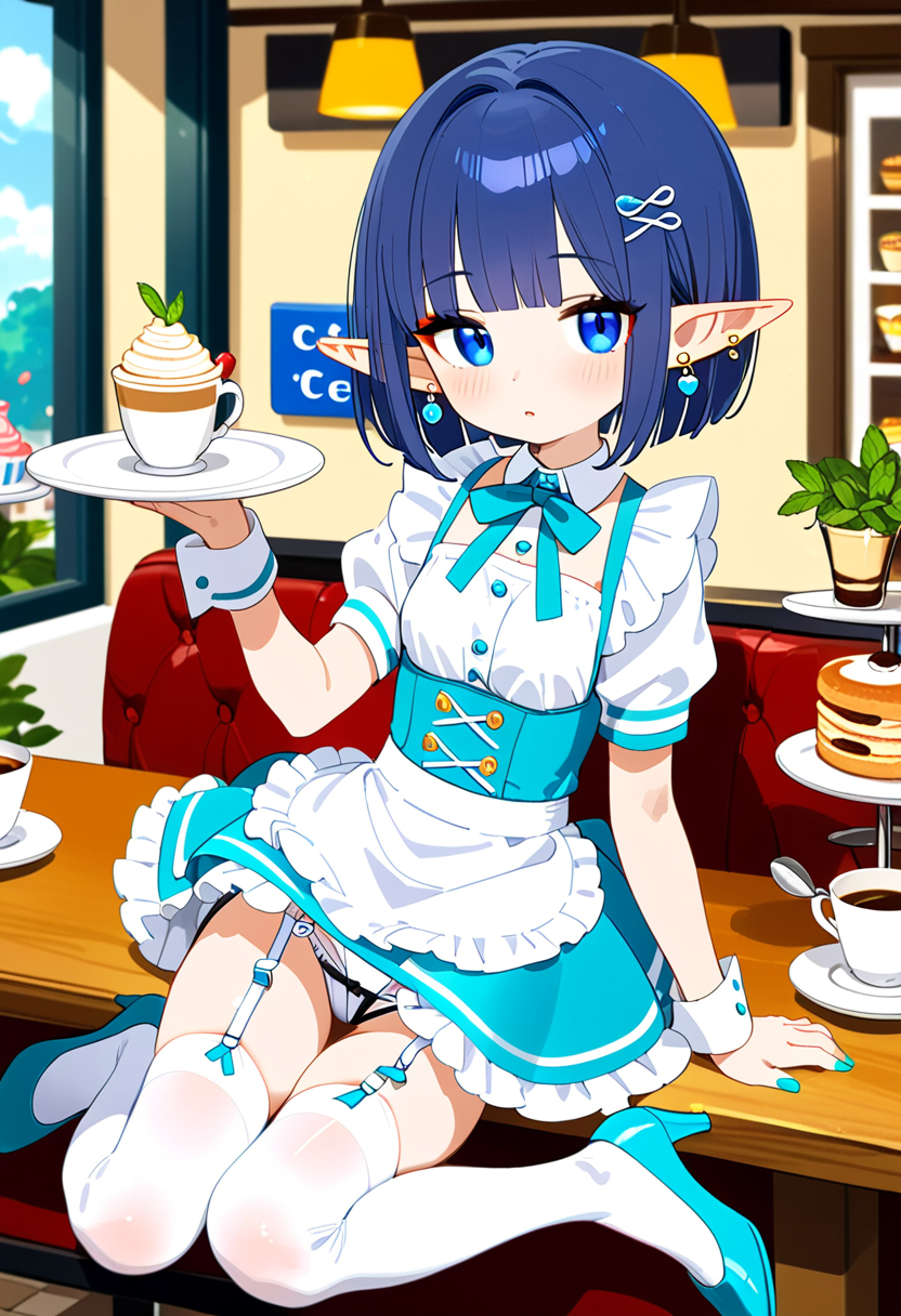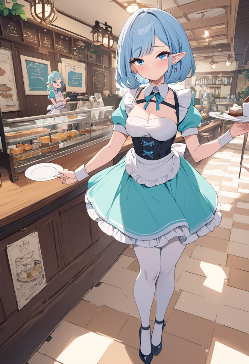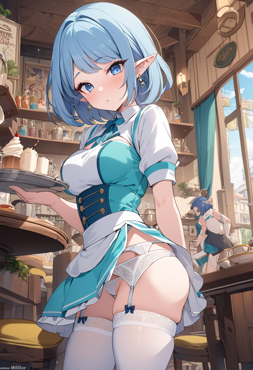 In a bustling fantasy cafe, the blue-haired elf maid, Lia, takes a moment to relax amid the aroma of freshly brewed coffee. Gazing at the snowy landscape outside, she reflects on the day's adventures. As regular adventurers drop by, what secret stories will she weave in this cozy spot? Sweet treats and warm tea invoke the magic of everyday life.