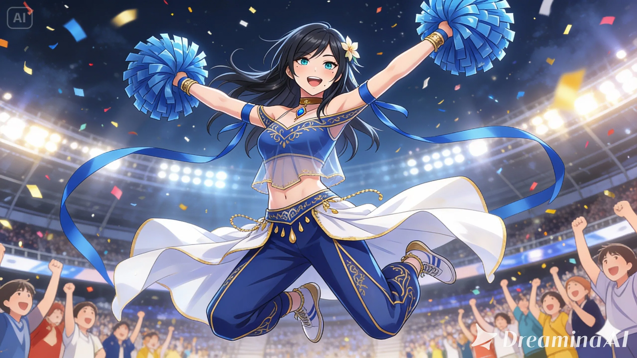 In a bustling stadium, a black-haired girl leaps high in her blue outfit, pom-poms in hand. She's a popular idol cheerleader celebrating her team's victory. Confetti swirls amid the roaring crowd. Her smile reflects overcoming tough practices. Could this jump signal the start of a new adventure? Under the shining lights, a dreamy night's tale unfolds.