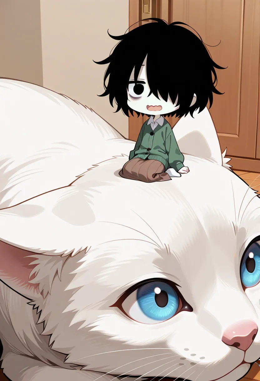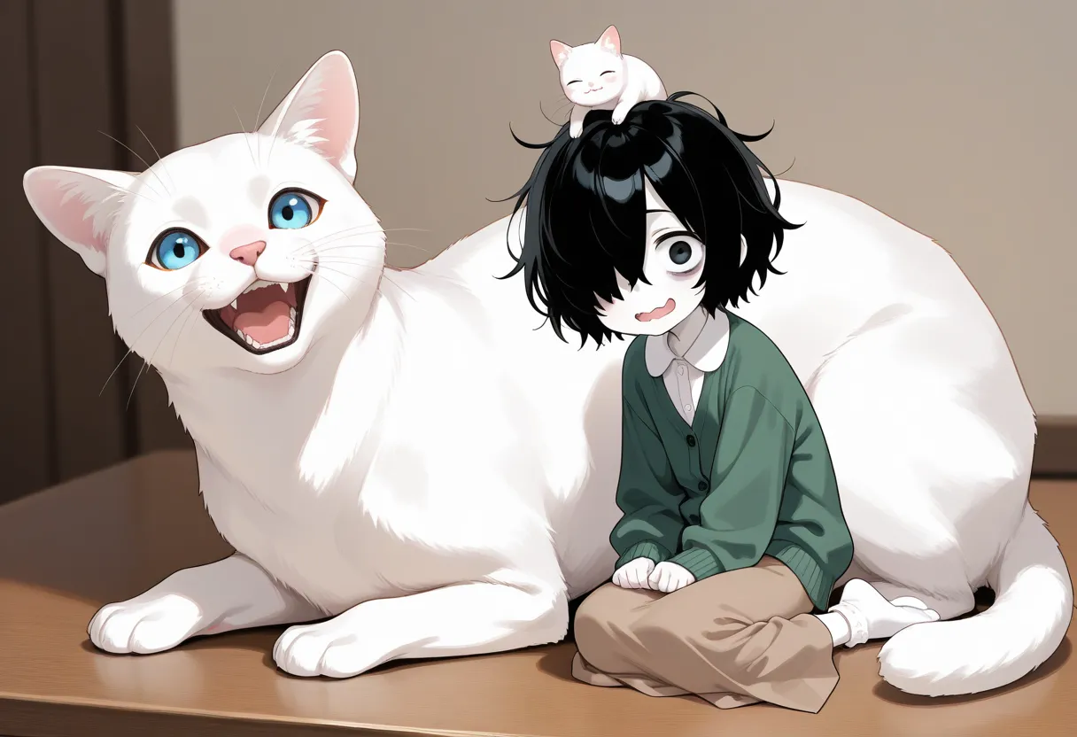 (oversized animal, surreal:1.4), blue eyes white cat, laughing,