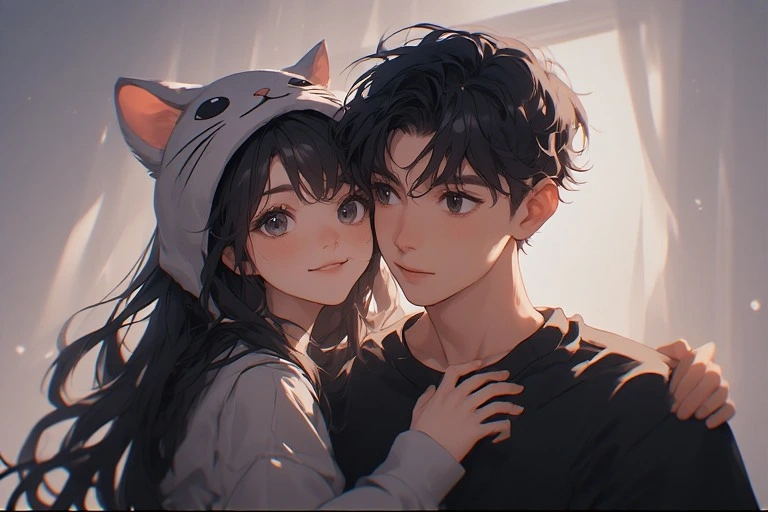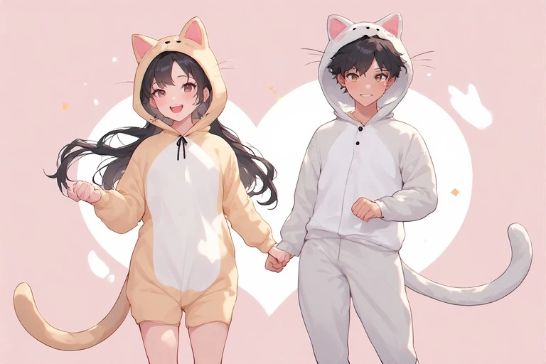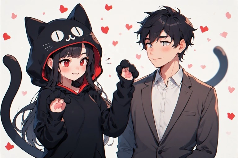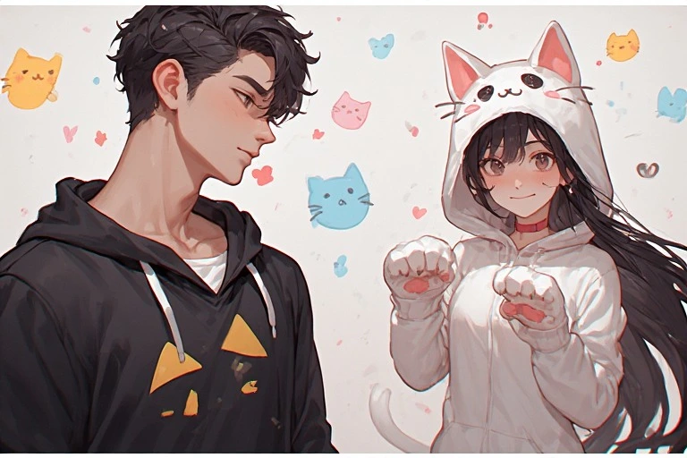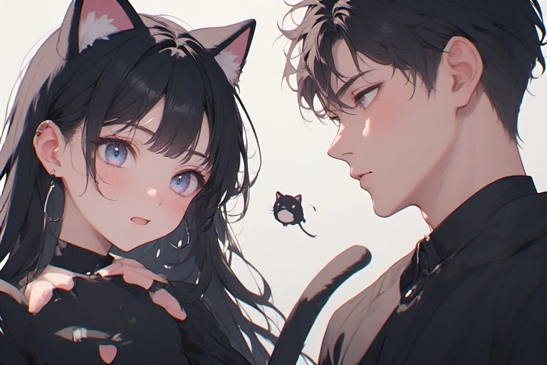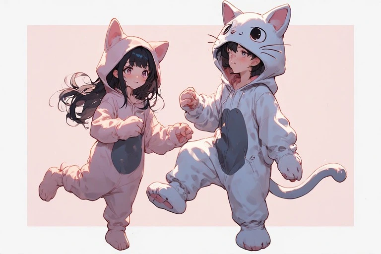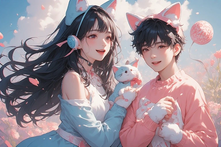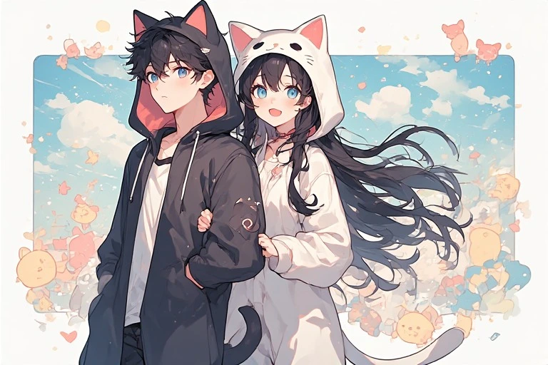 In a magical forest, the white cat and black cat twin sisters meet. Amid swirling flower petals, they hold hands and start a secret playtime. The white cat girl smiles gently, while the black cat girl explores with curious eyes. Soon, forest spirits gather, unfolding a dreamlike day. What wondrous events will their bond bring? Let your imagination dive into their story.