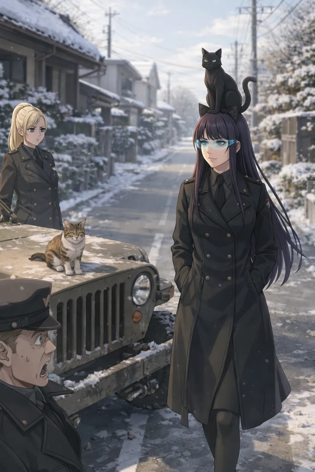 黒猫は、少佐の頭の上で堂々と座り、