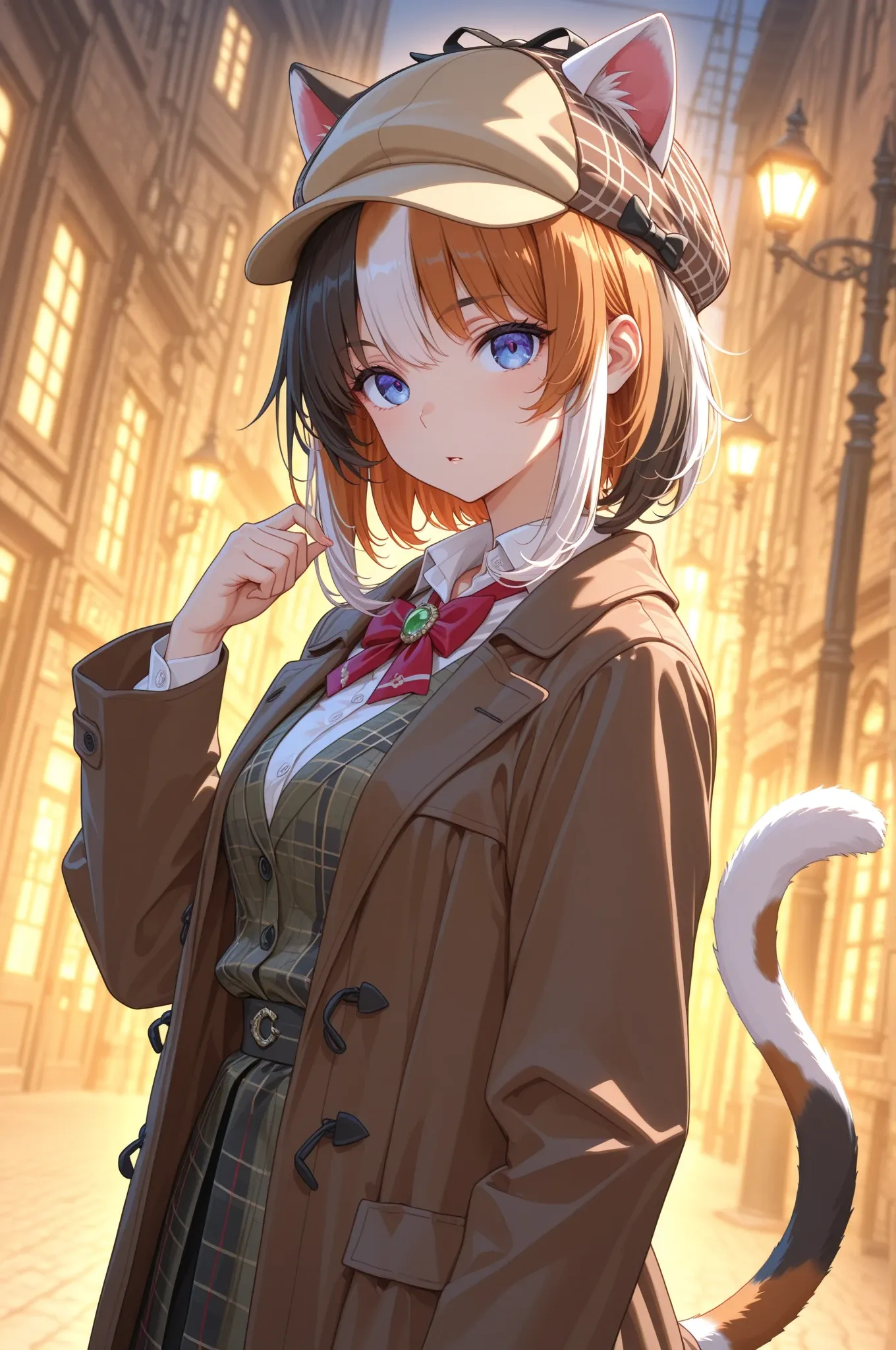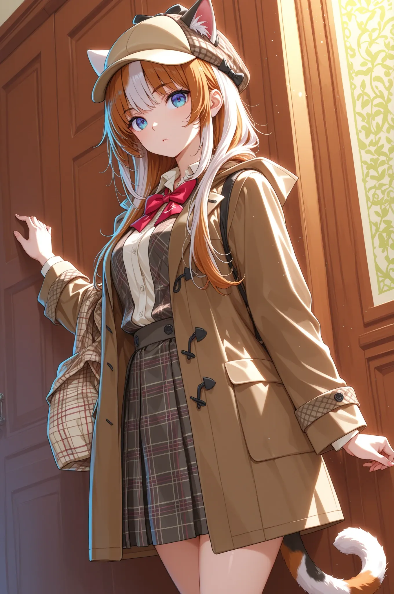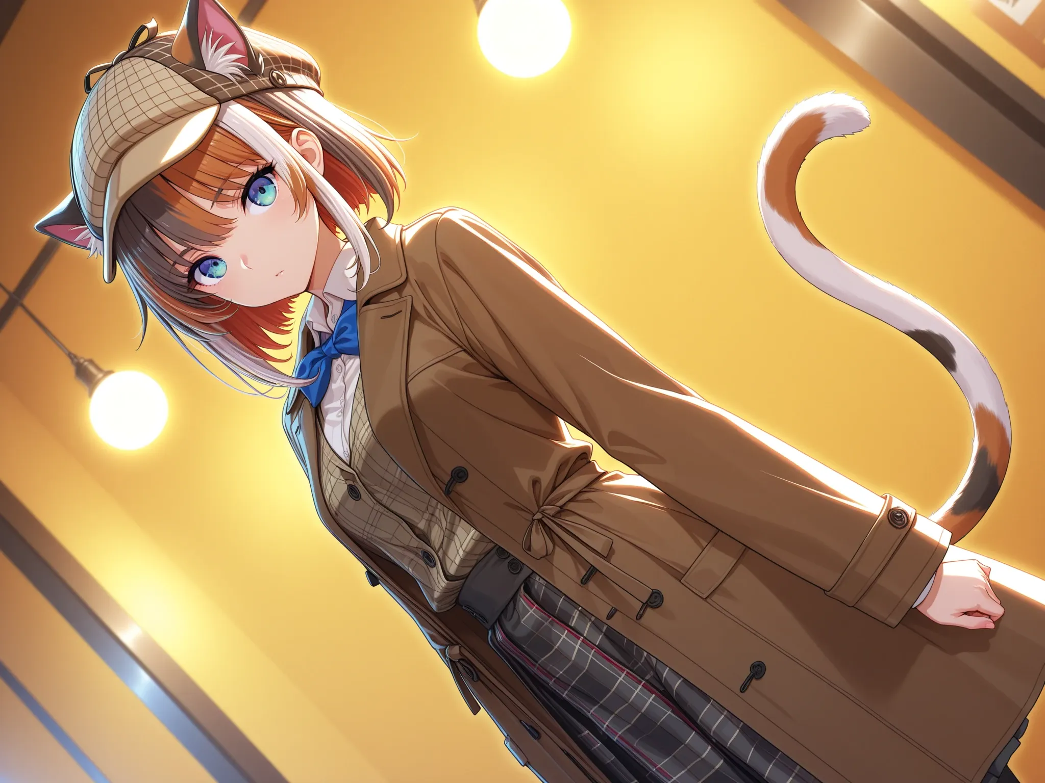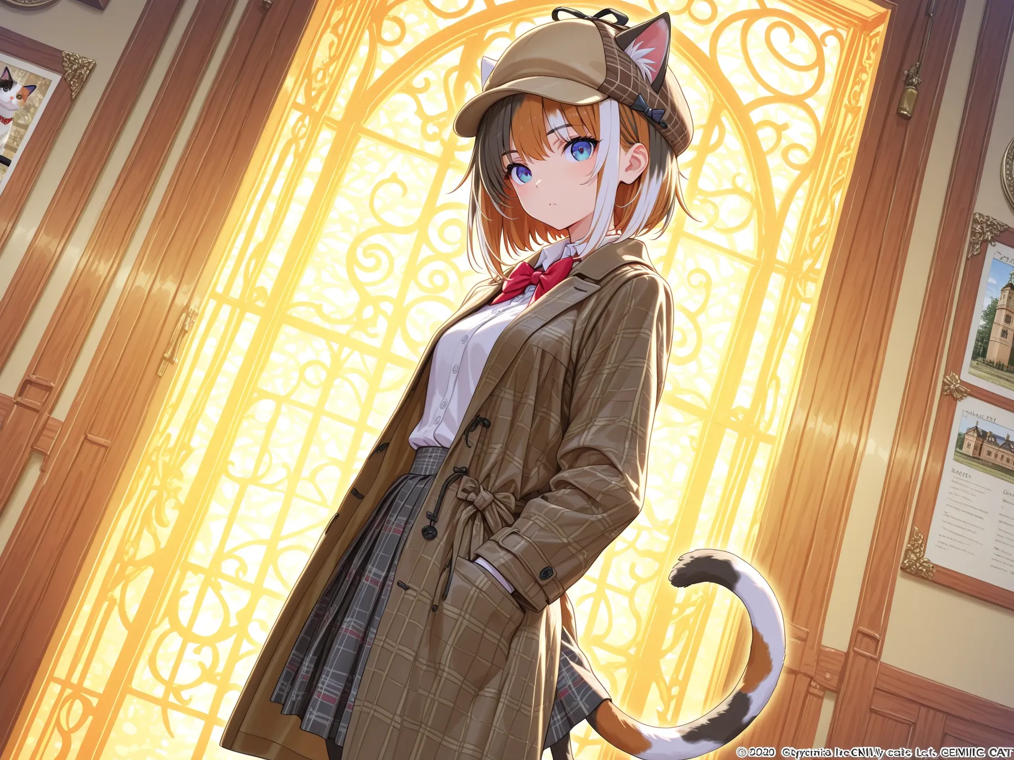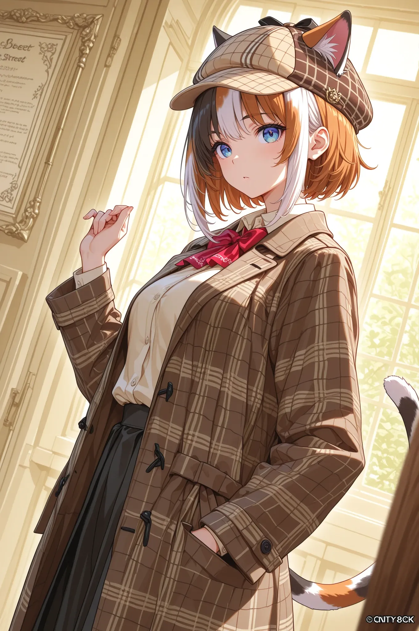 In the bare forest bathed in morning sunlight, a cat-eared girl detective takes on a mysterious case. With her trench coat fluttering and sharp blue eyes scanning the surroundings, she pursues a lost treasure. Is this the start of an adventure, or an unexpected encounter? Her swaying tail tells of her curiosity. What secrets will be uncovered in the forest's silence?