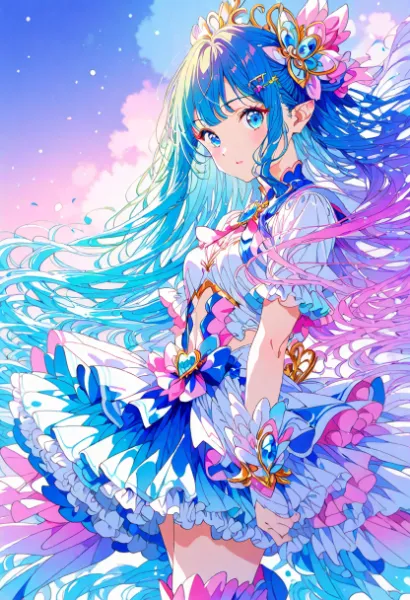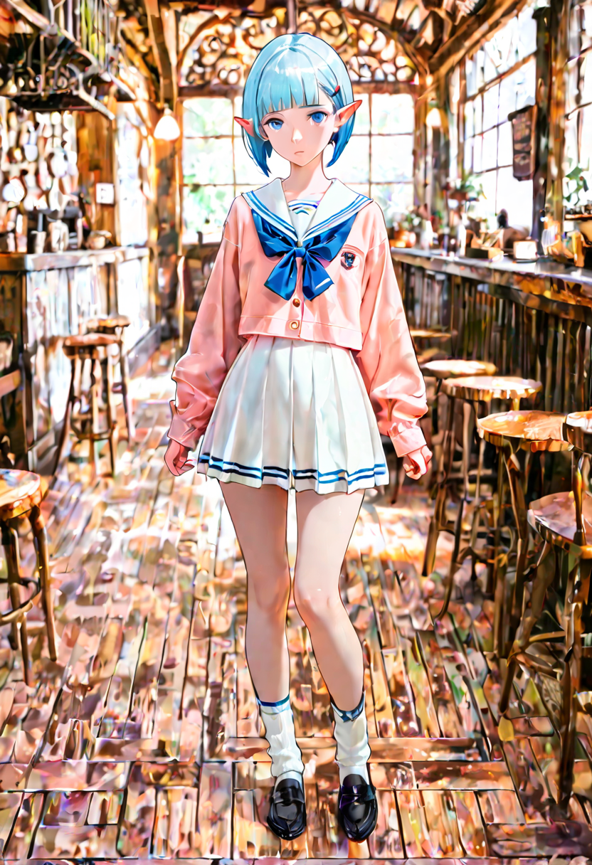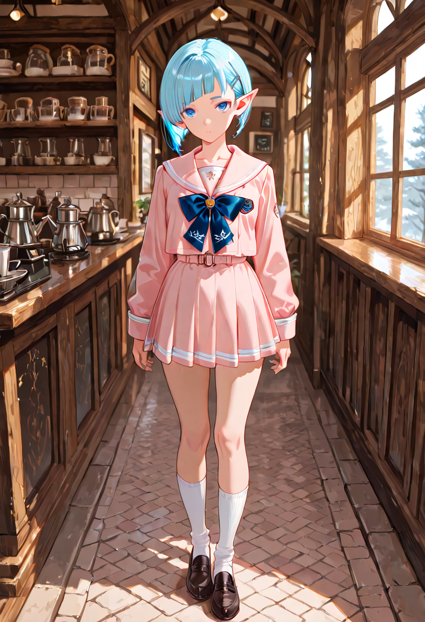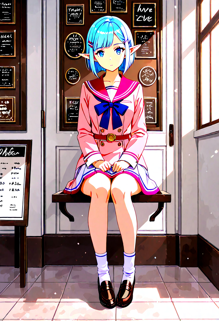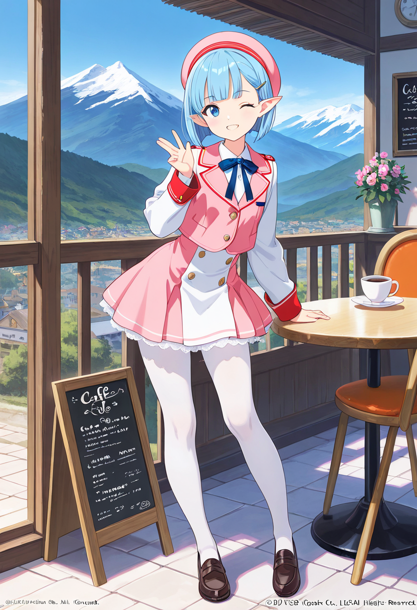 At the entrance of an old street corner cafe, a blue-haired elf girl sits with her chin in her hand. Dressed in her uniform, she's enveloped in the afternoon sunlight, seemingly dreaming of distant adventures. With flowers blooming around, is she waiting for someone, or is this the start of a secret story? In this peaceful everyday scene, a mysterious encounter hides, reflected in her large eyes. It invites the viewer to empathize and spread wings of imagination.