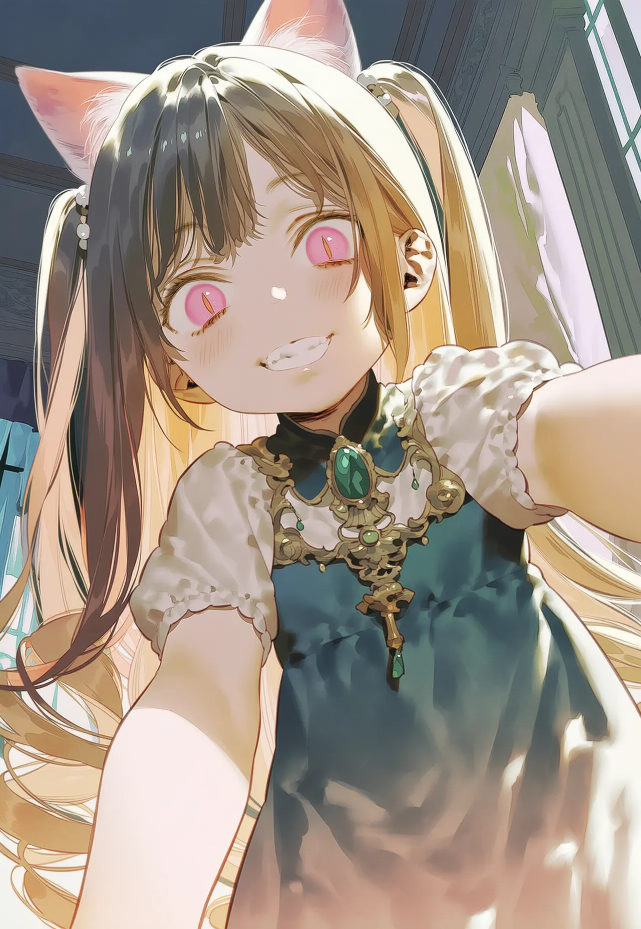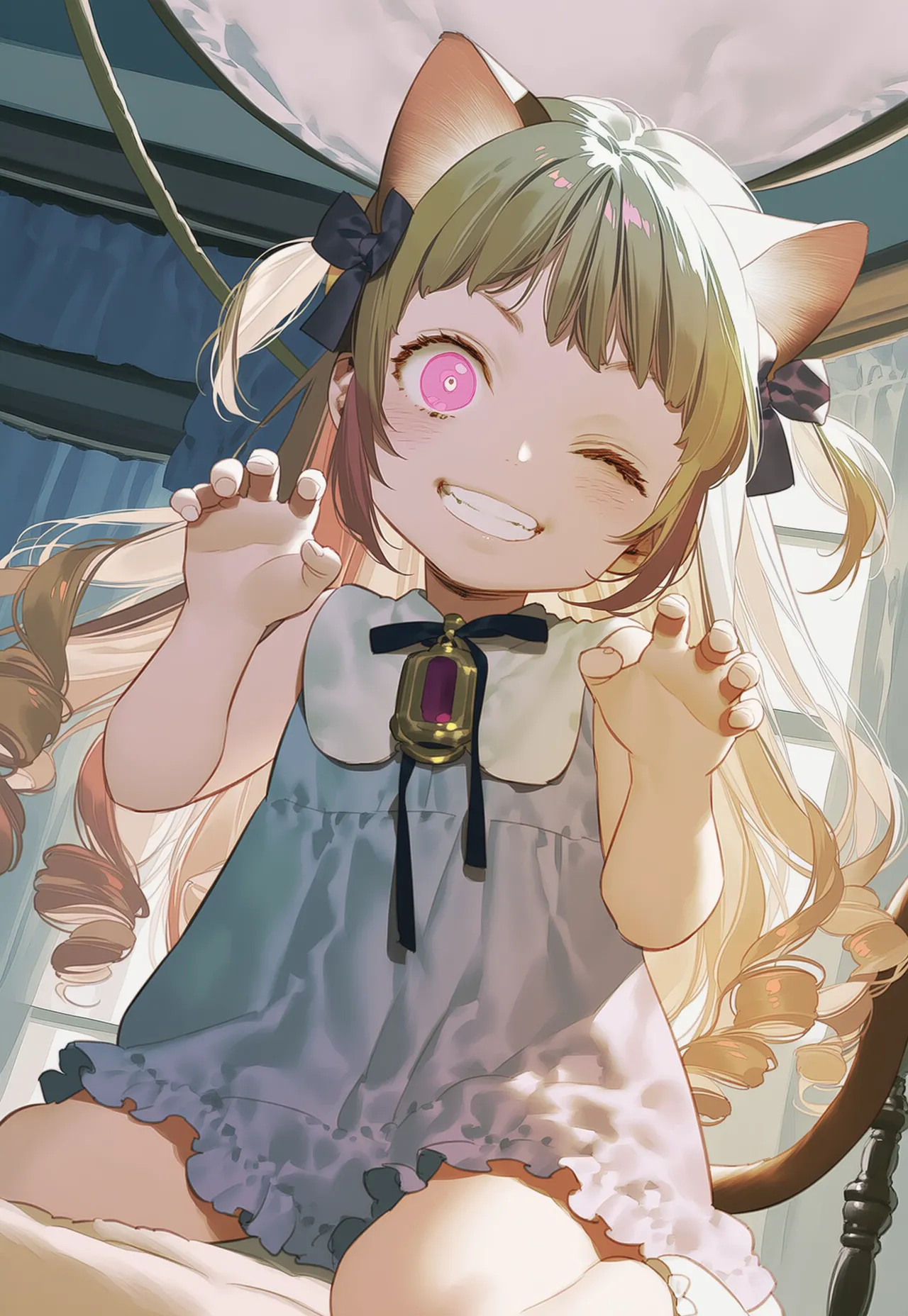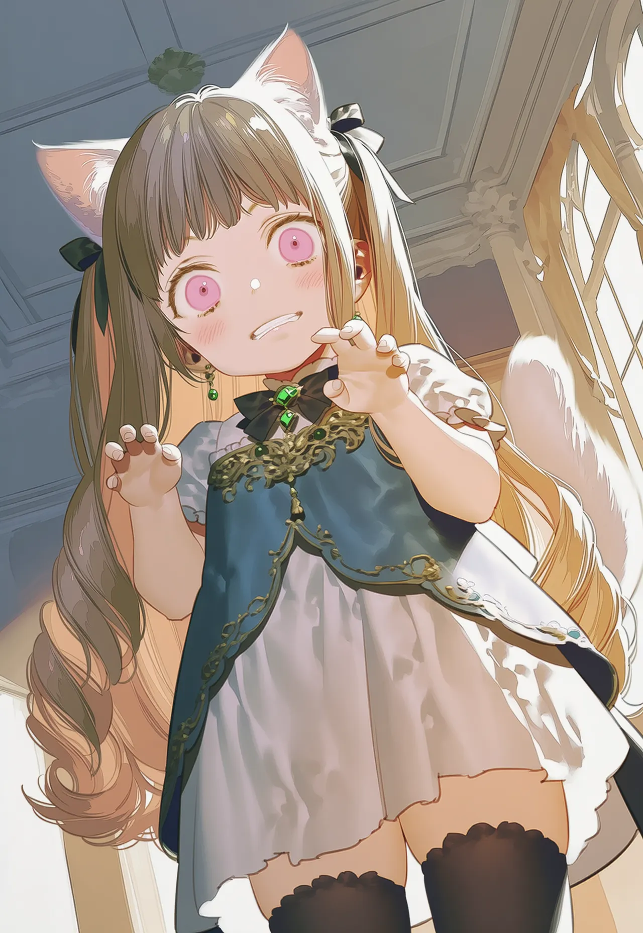 In a room bathed in morning sunlight, a cat-eared girl gleams with excitement, claws extended. She's a resident of an old mansion, starting her whimsical play every dawn. What mischief will she unleash today? Adorned in a gem-encrusted dress, her curious expression hints at a tiny adventure. Her secret daily life stirs the viewer's imagination.