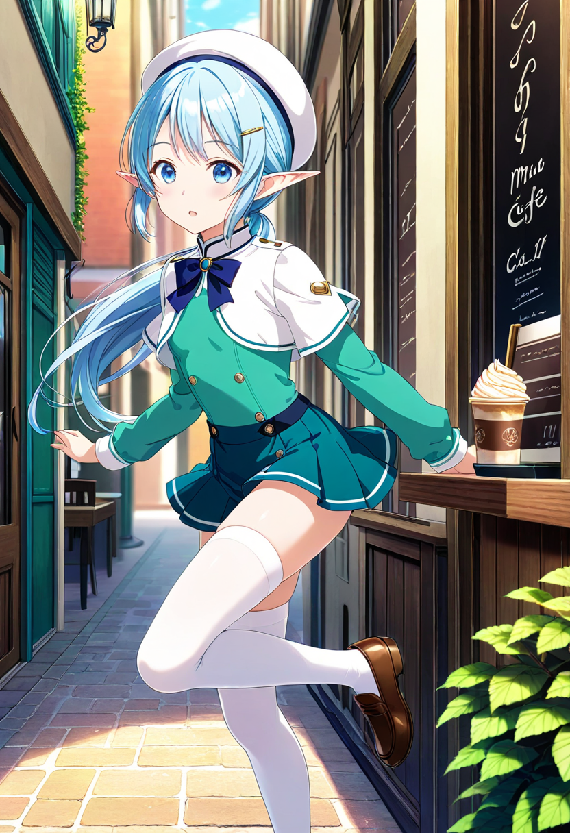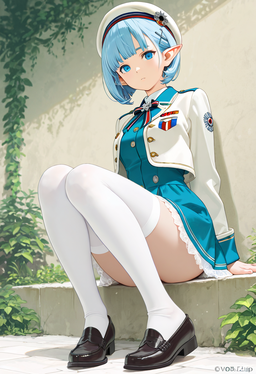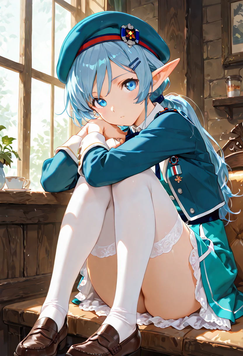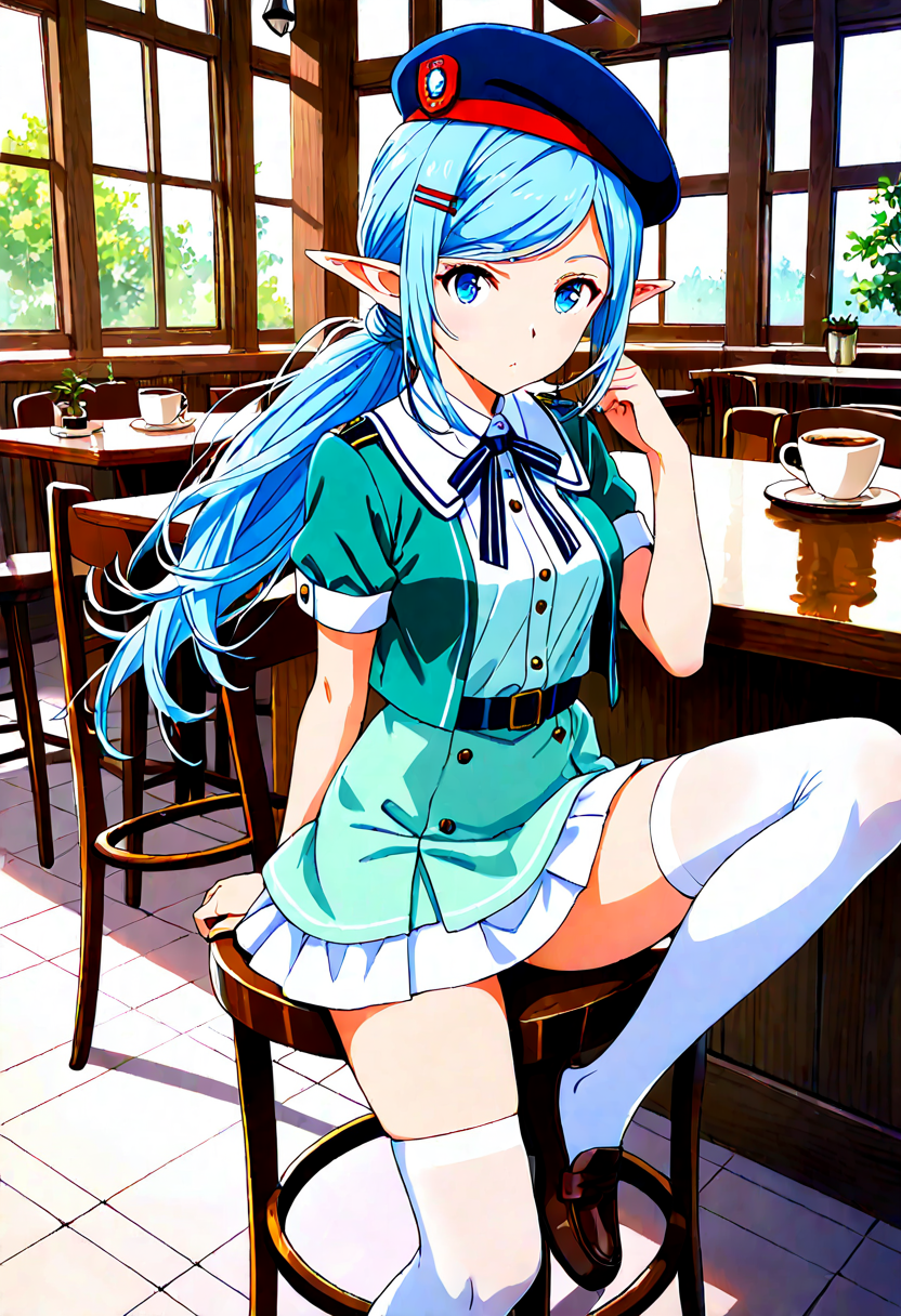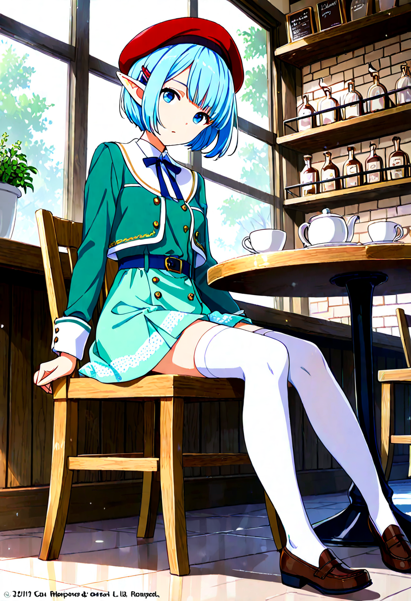 Luna, the blue-haired elf girl studying at a magical academy, sits on a bench during break, tilting her beret and gazing into the distance. Her eyes reflect memories of her forest homeland. The wind rustles her skirt, offering a brief escape from daily hustle. Could this be the prelude to her next adventure? Her soft sigh signals the start of a new story.