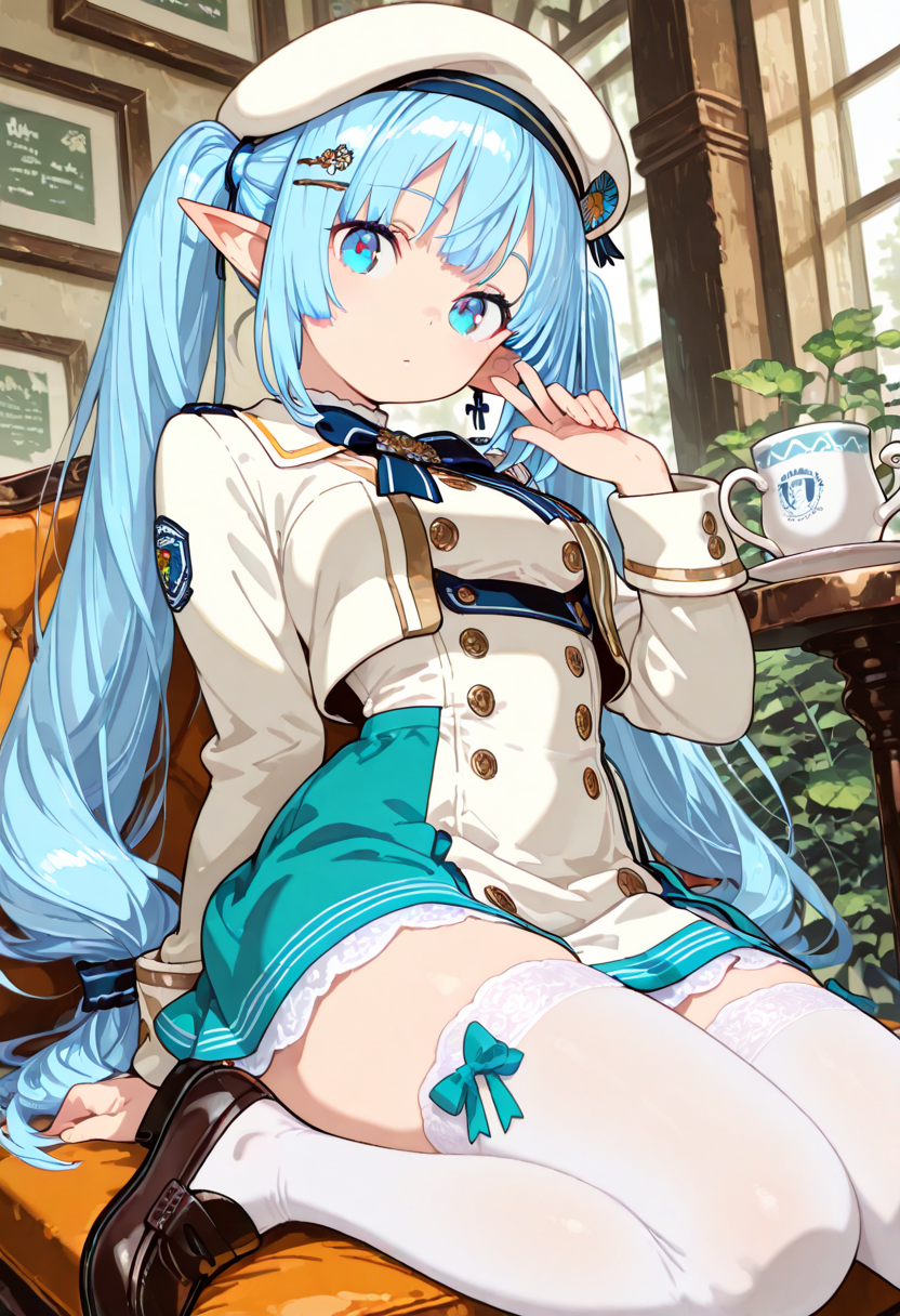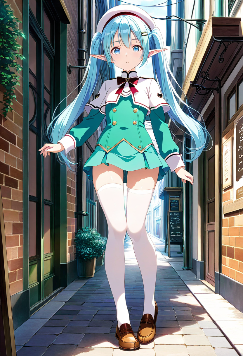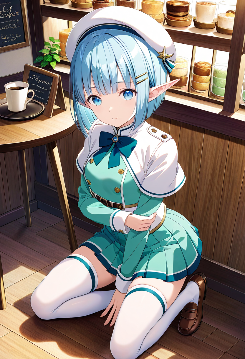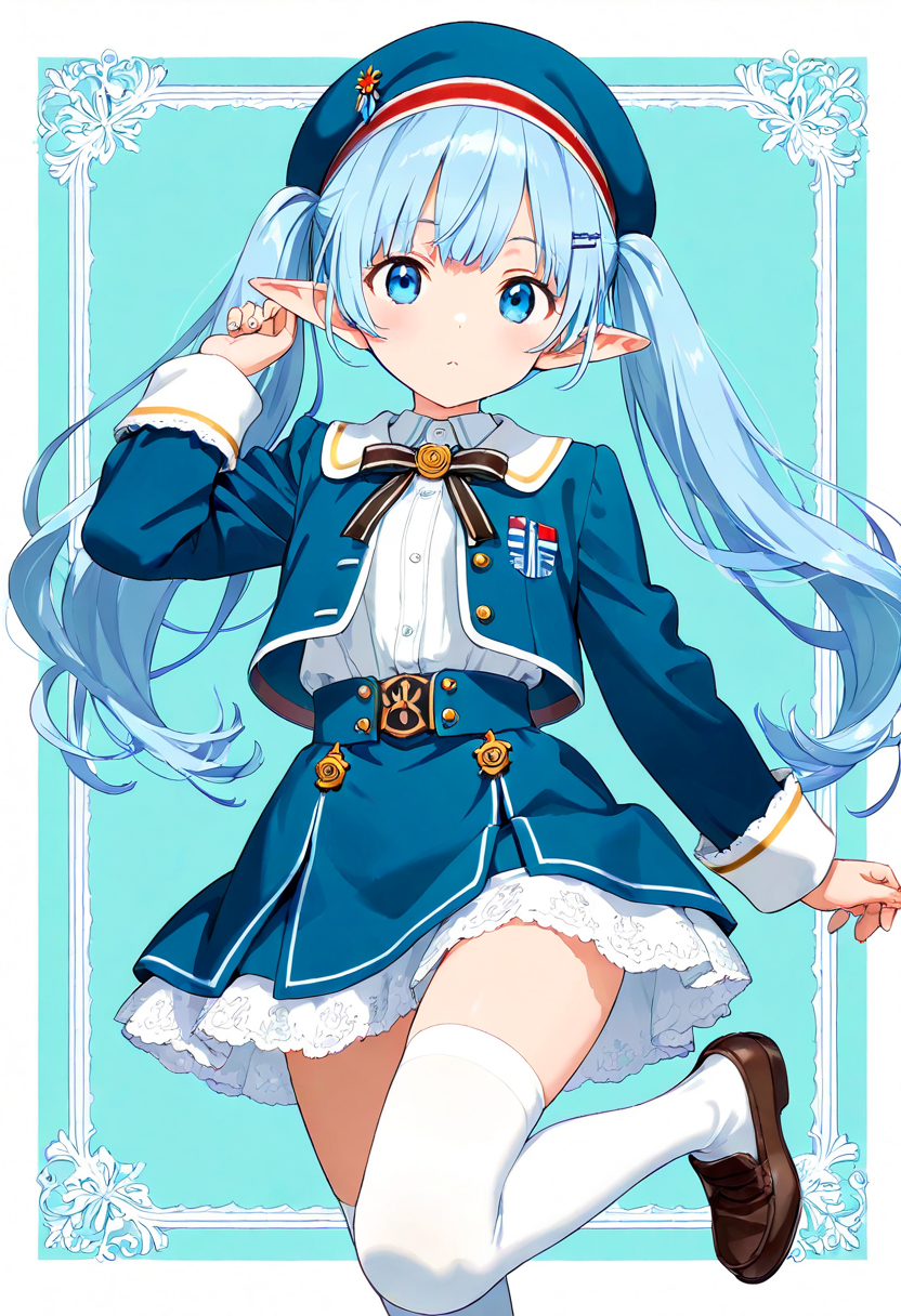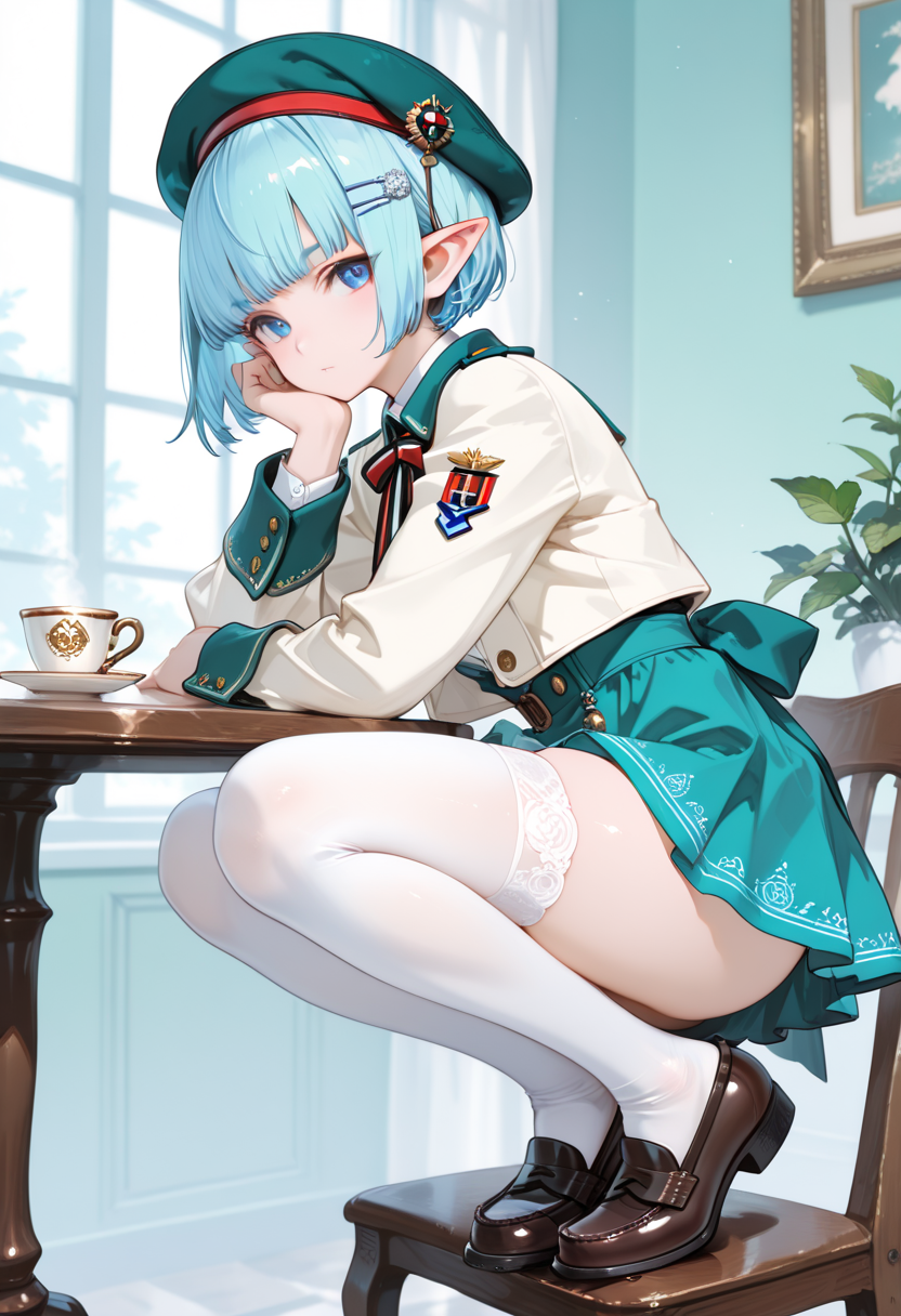 Luna, the blue-haired elf girl studying at a magical academy, sits on a bench during break, tilting her beret and gazing into the distance. Her eyes reflect memories of her forest homeland. The wind rustles her skirt, offering a brief escape from daily hustle. Could this be the prelude to her next adventure? Her soft sigh signals the start of a new story.