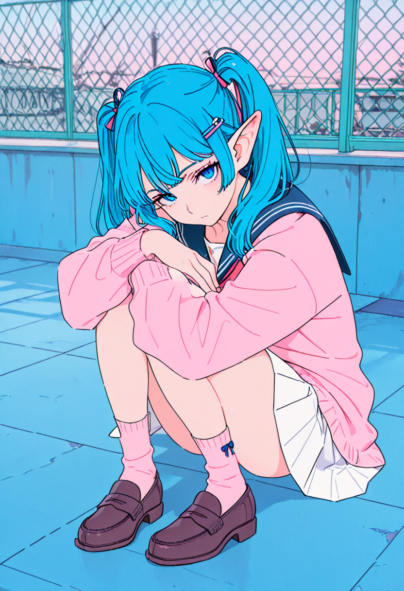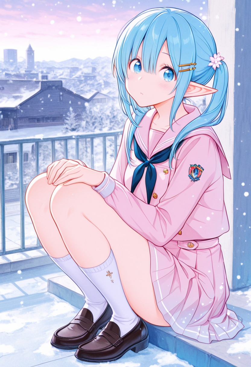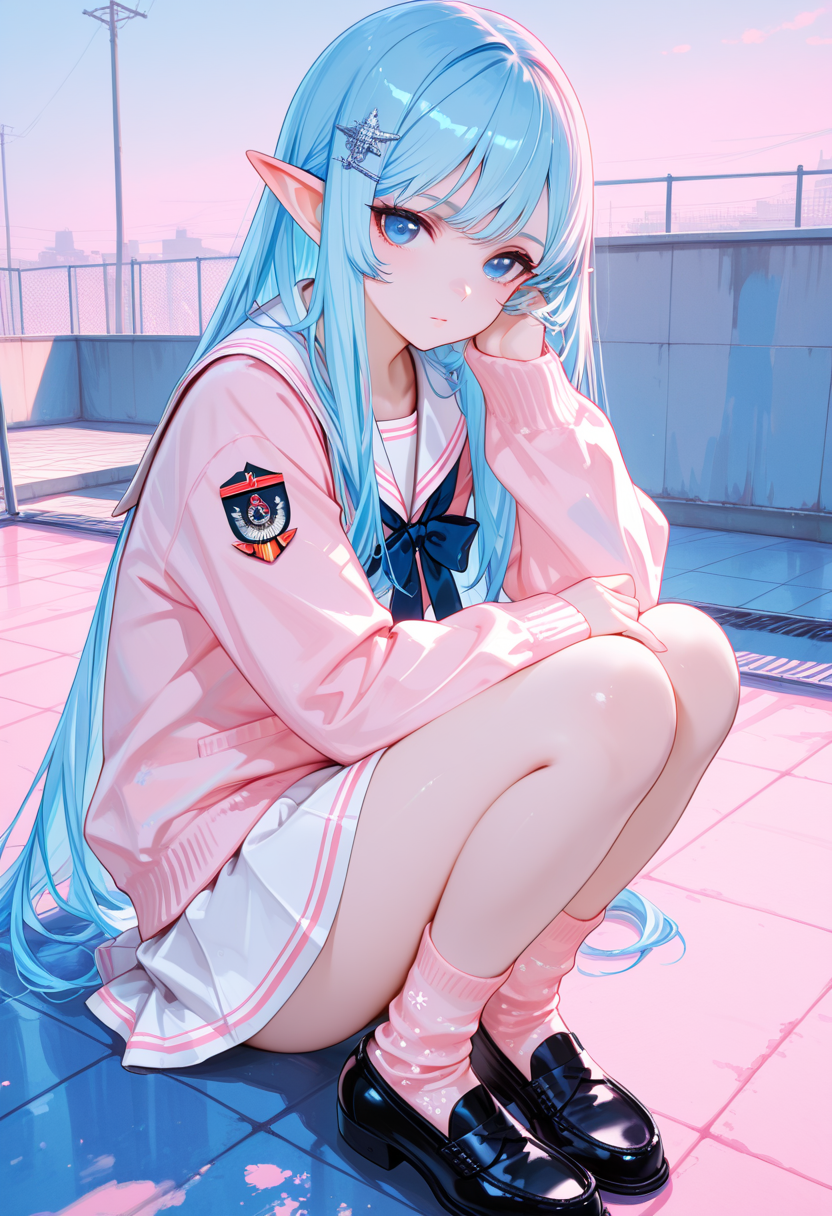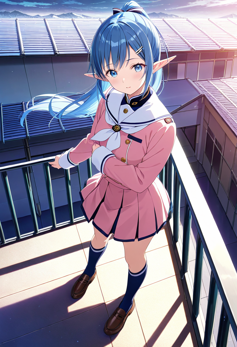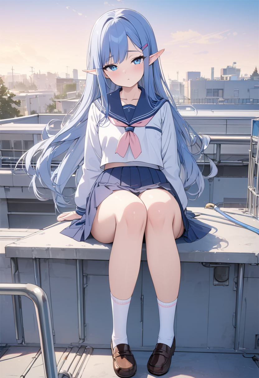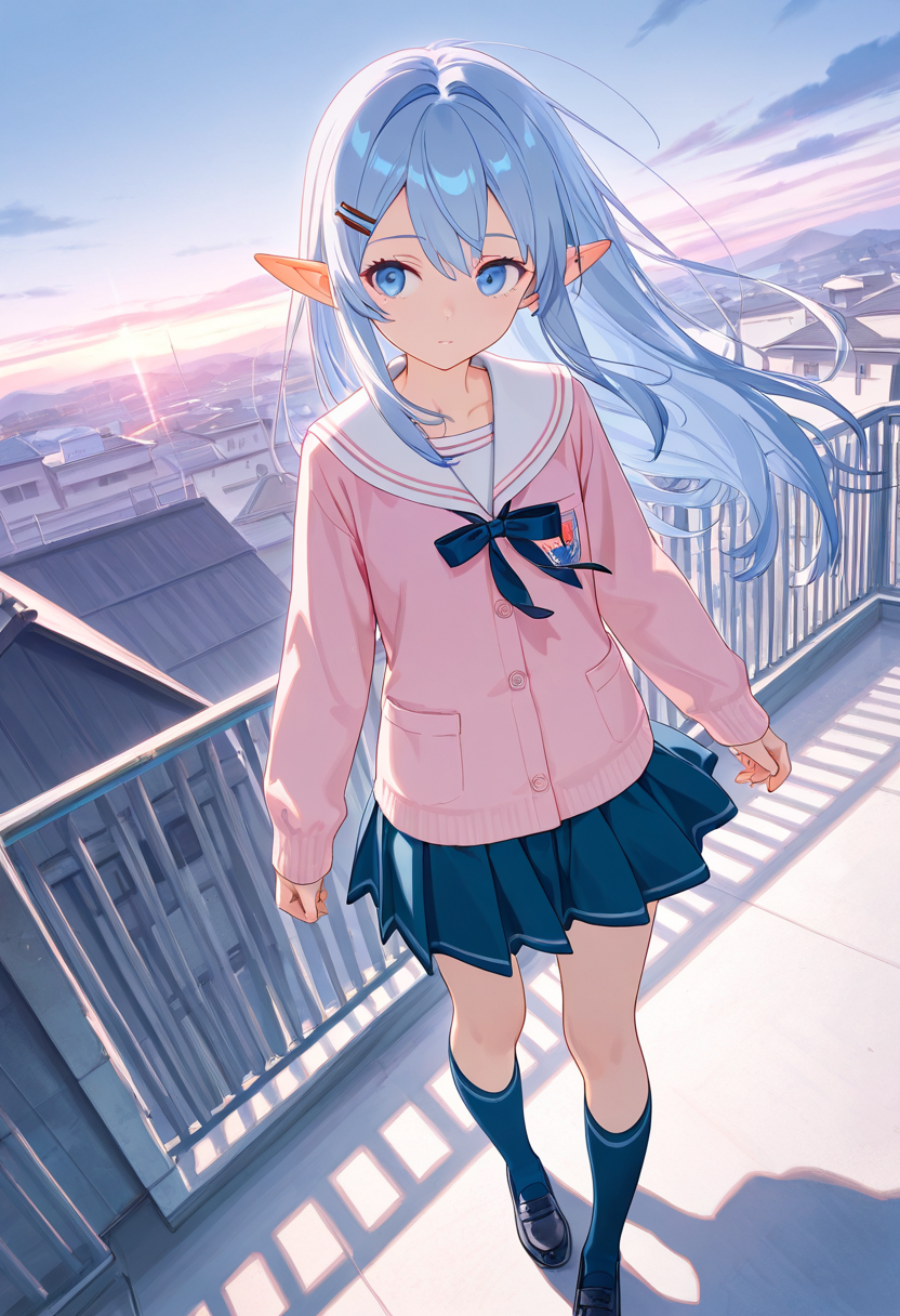 A blue-haired elf girl sits on the rooftop of an ancient city, gazing at the setting sun. She wandered from another world and recalls her promise with a human boy she met here. Dressed in a sailor uniform, her hair sways in the wind, whispering her poignant feelings. As the cityscape turns orange, her eyes hold the promise of adventure. Will the day of their promise arrive? This piece evokes a gentle fantasy in the reader's heart.