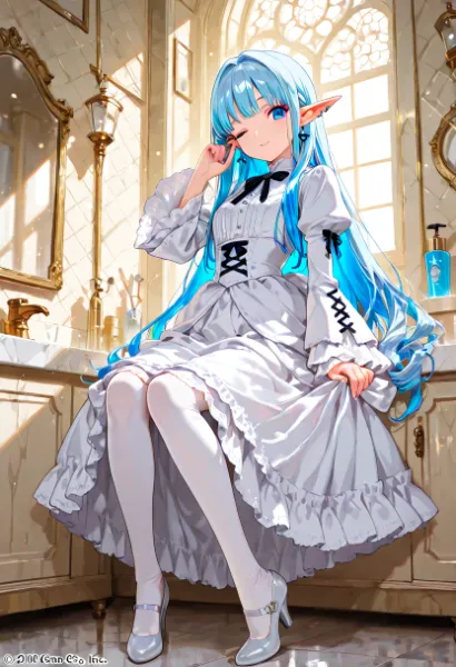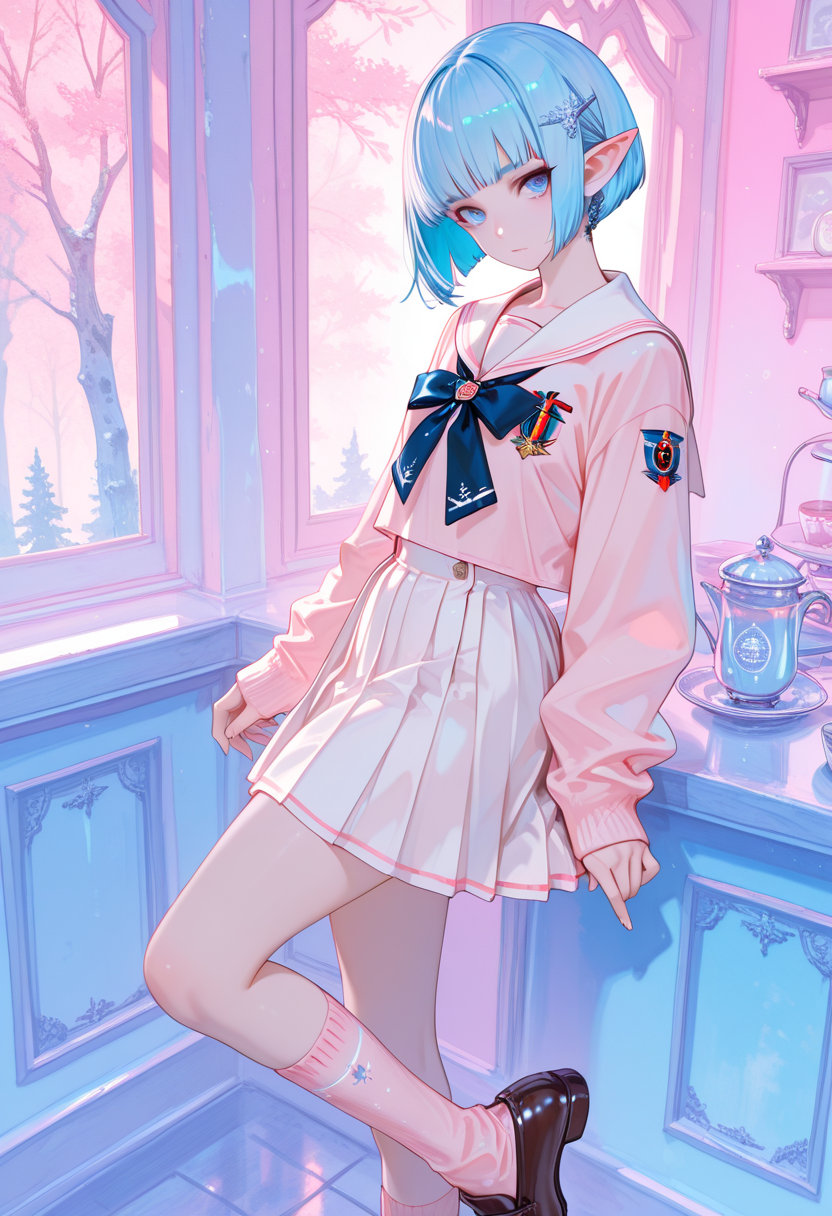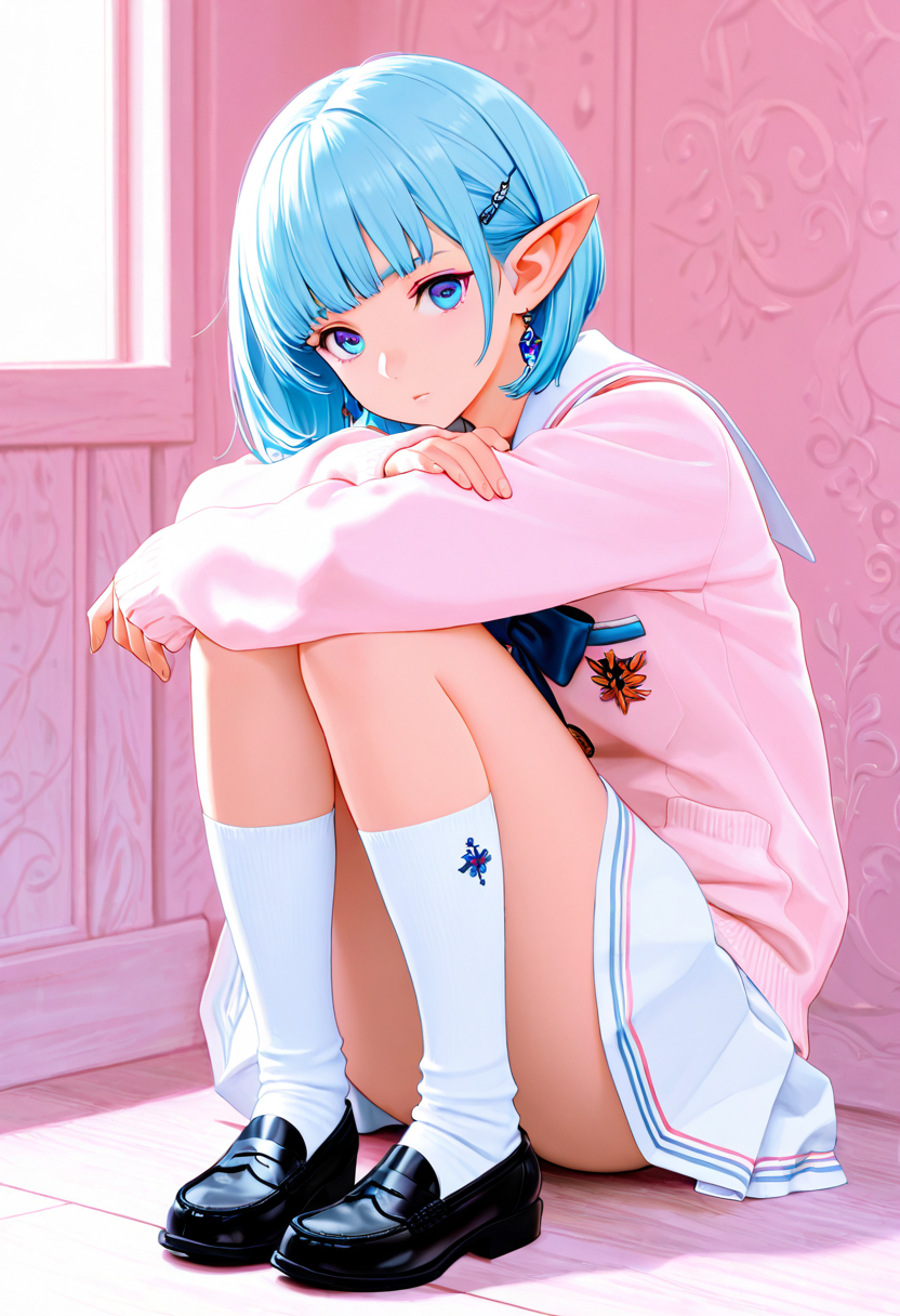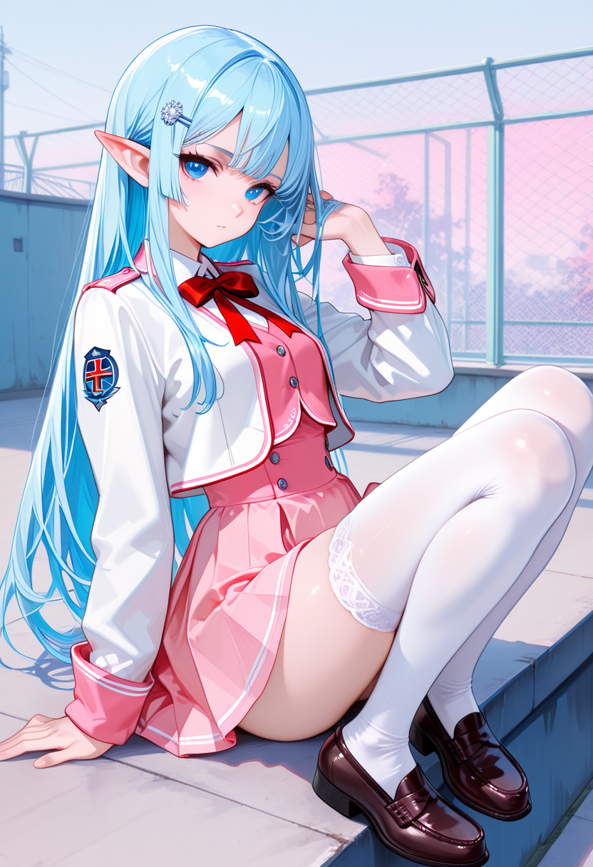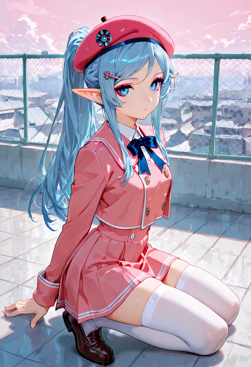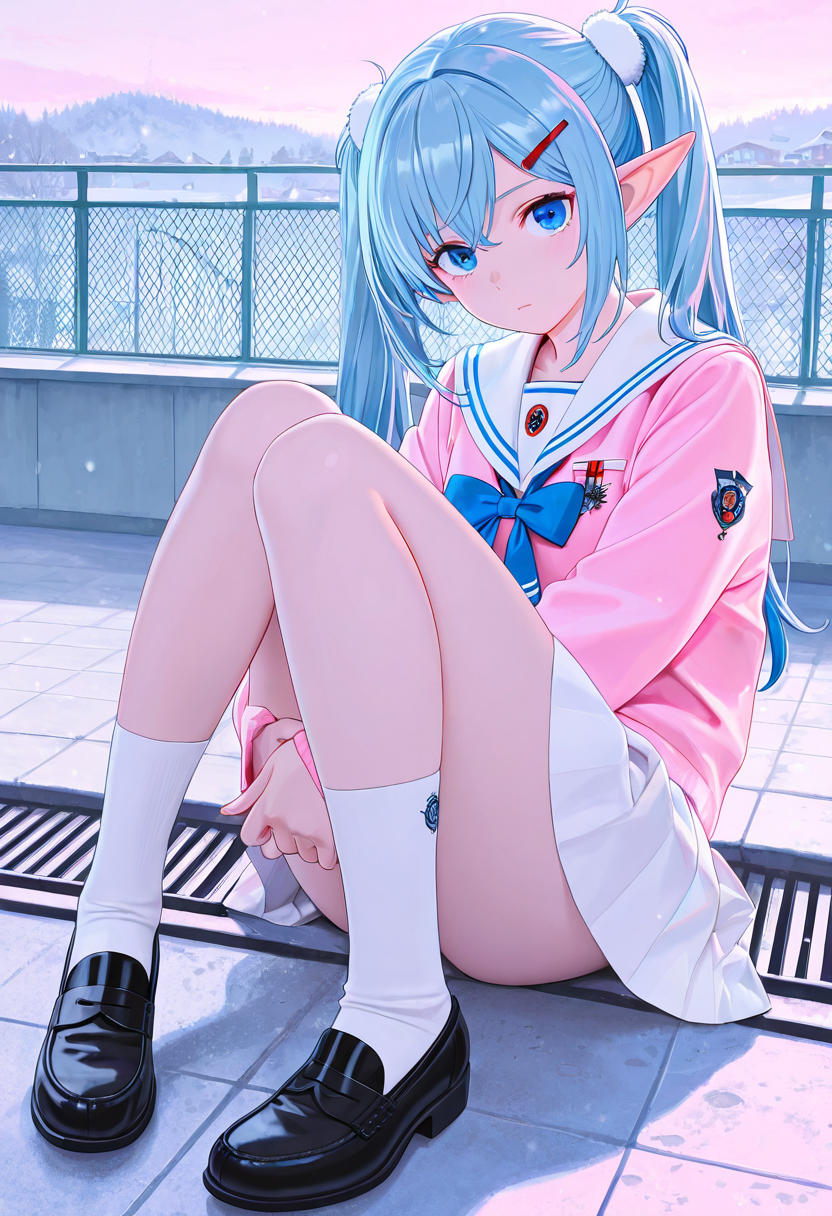 A blue-haired elf girl sits on the rooftop of an ancient city, gazing at the setting sun. She wandered from another world and recalls her promise with a human boy she met here. Dressed in a sailor uniform, her hair sways in the wind, whispering her poignant feelings. As the cityscape turns orange, her eyes hold the promise of adventure. Will the day of their promise arrive? This piece evokes a gentle fantasy in the reader's heart.