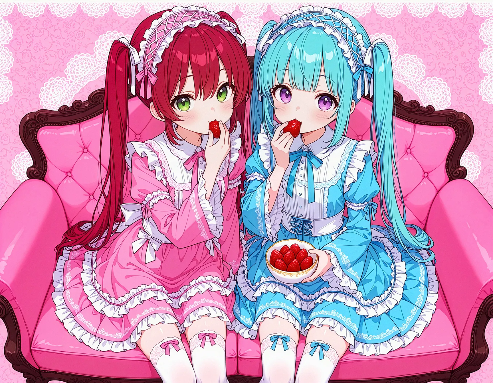 parameters: masterpiece, best quality, incredibly absurdres, very aesthetic, pink theme, yume kawaii, gothic lolita, colorful, 2girls, cute, kawaii, loli, eating strawberry, holding strawberry bowl, dress, frills, laces, ribbon, embroidery, hairband, white thighhighs, red hair, blue hair, twintails, green eyes, purple eyes, sitting on sofa, looking at viewer, lace background, doily, lace border, from above