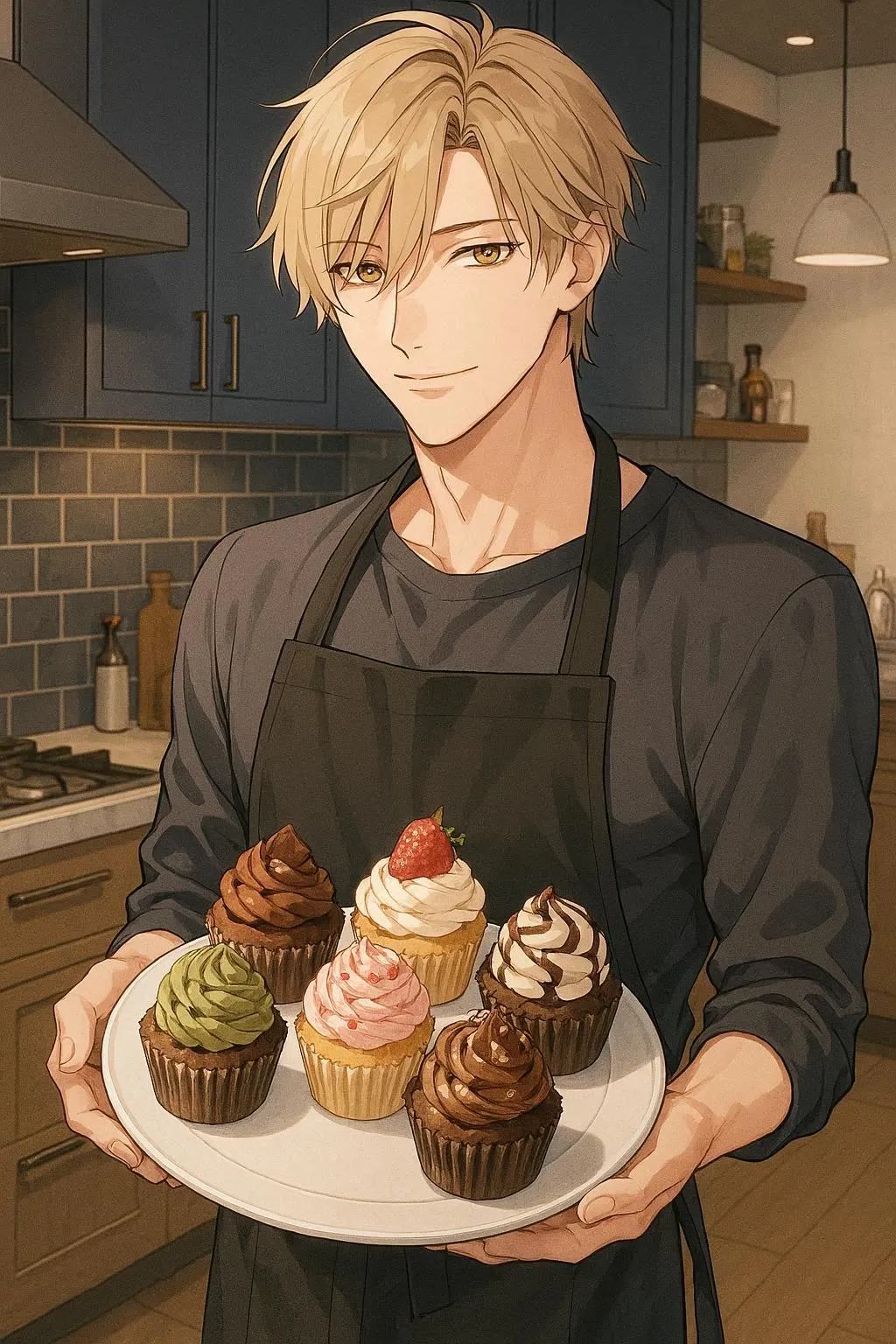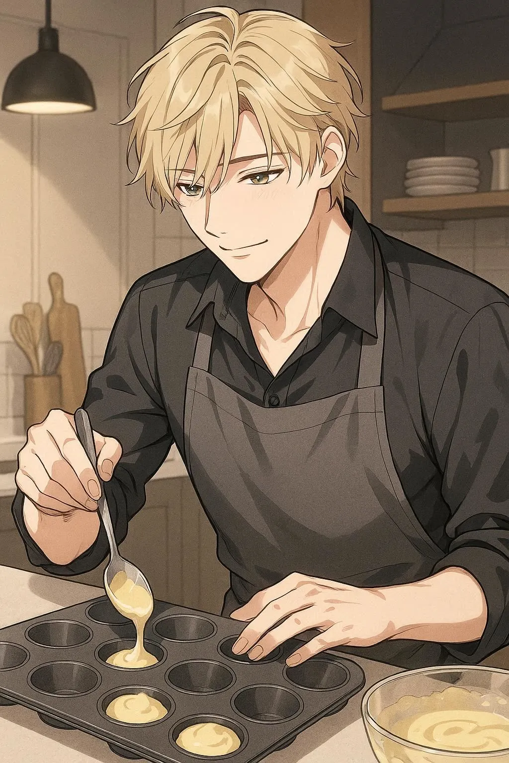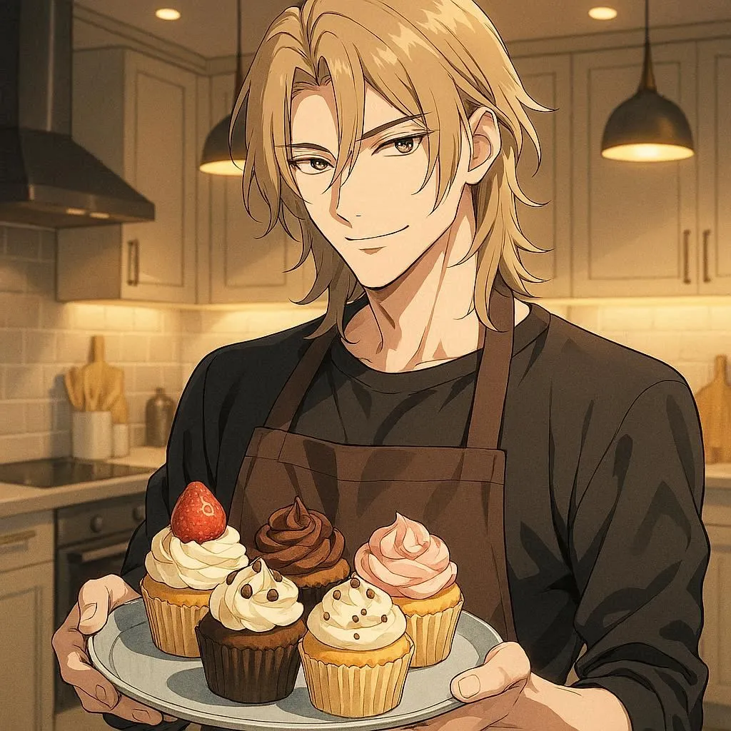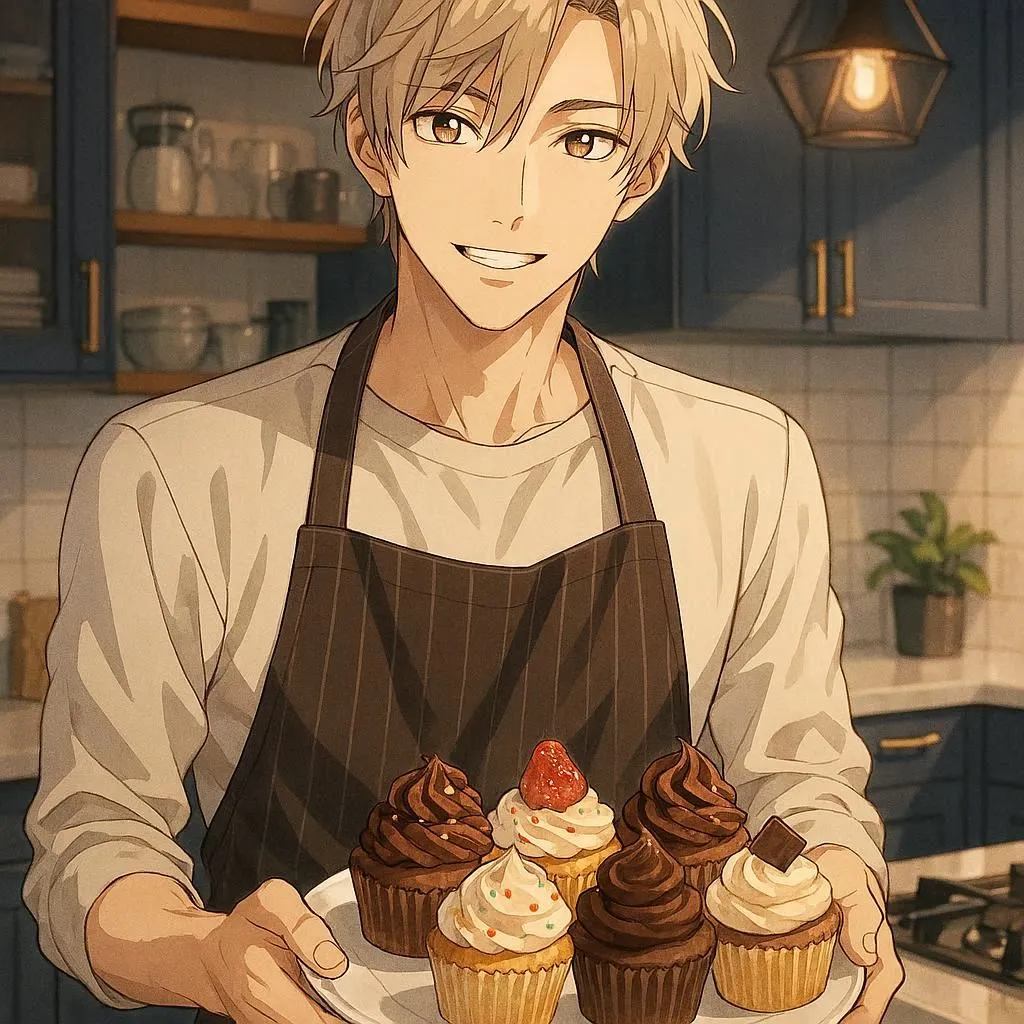 "I'll bake a special treat just for you," he murmurs with a gentle smile while pouring batter. In his apron, this cool and kind young man fills the homey kitchen with sweet aromas in his daily routine.