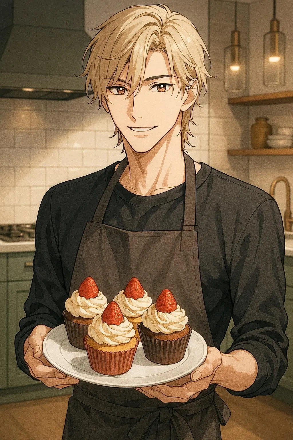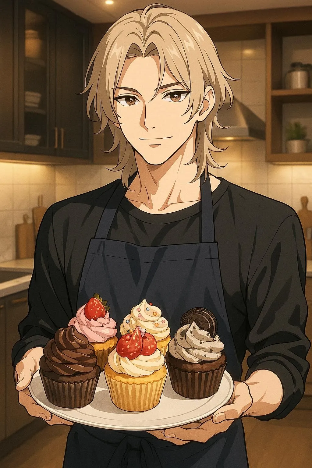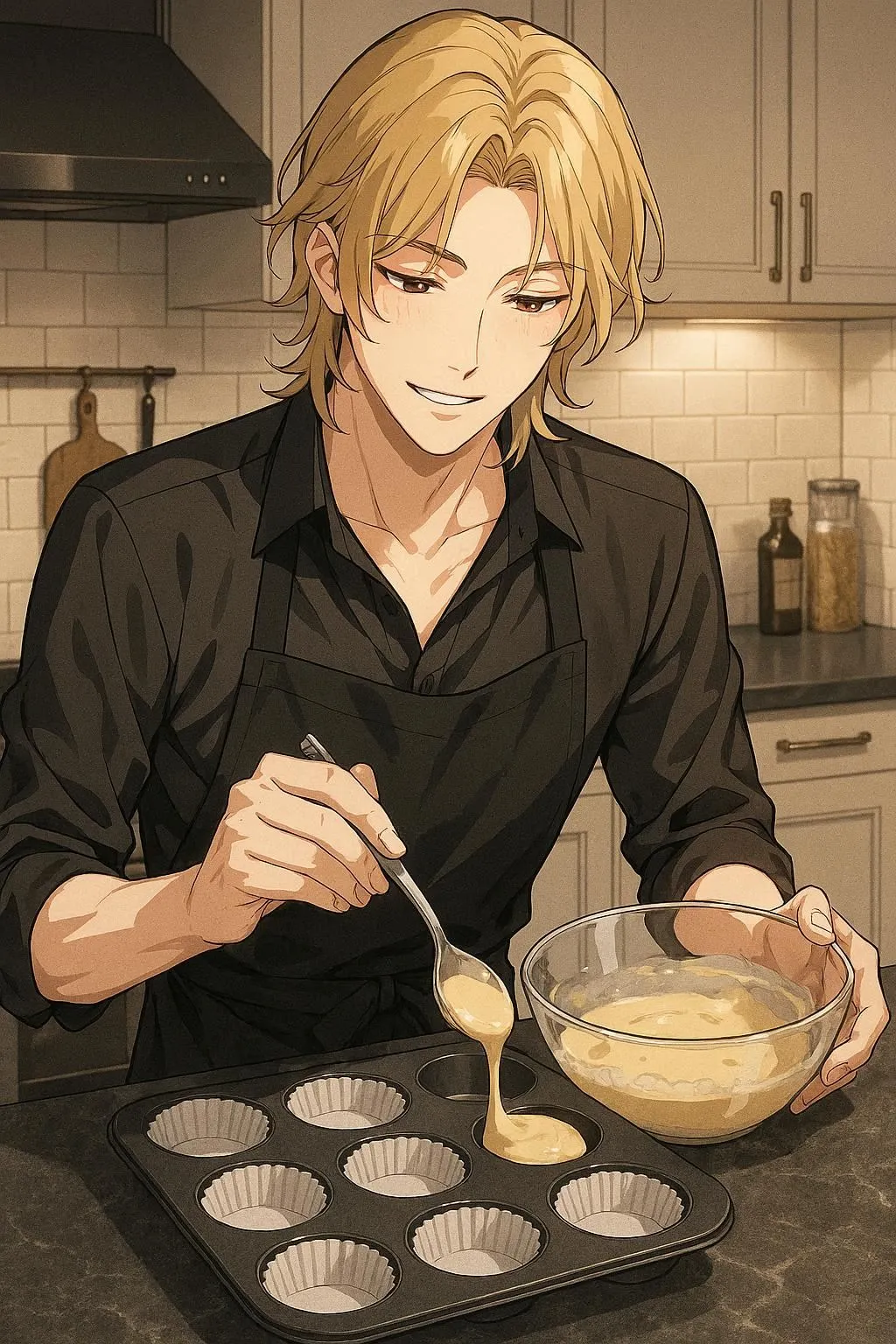 "I'll bake a special treat just for you," he murmurs with a gentle smile while pouring batter. In his apron, this cool and kind young man fills the homey kitchen with sweet aromas in his daily routine.