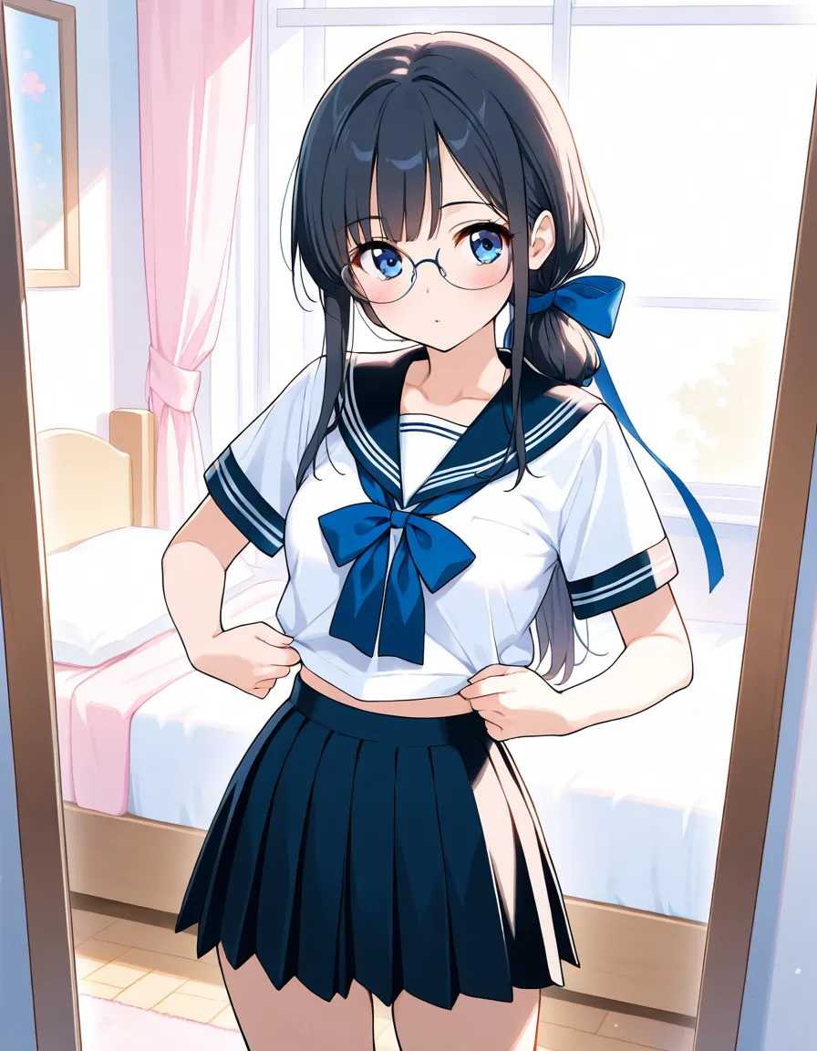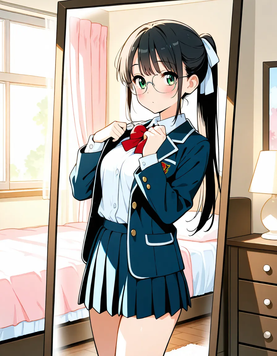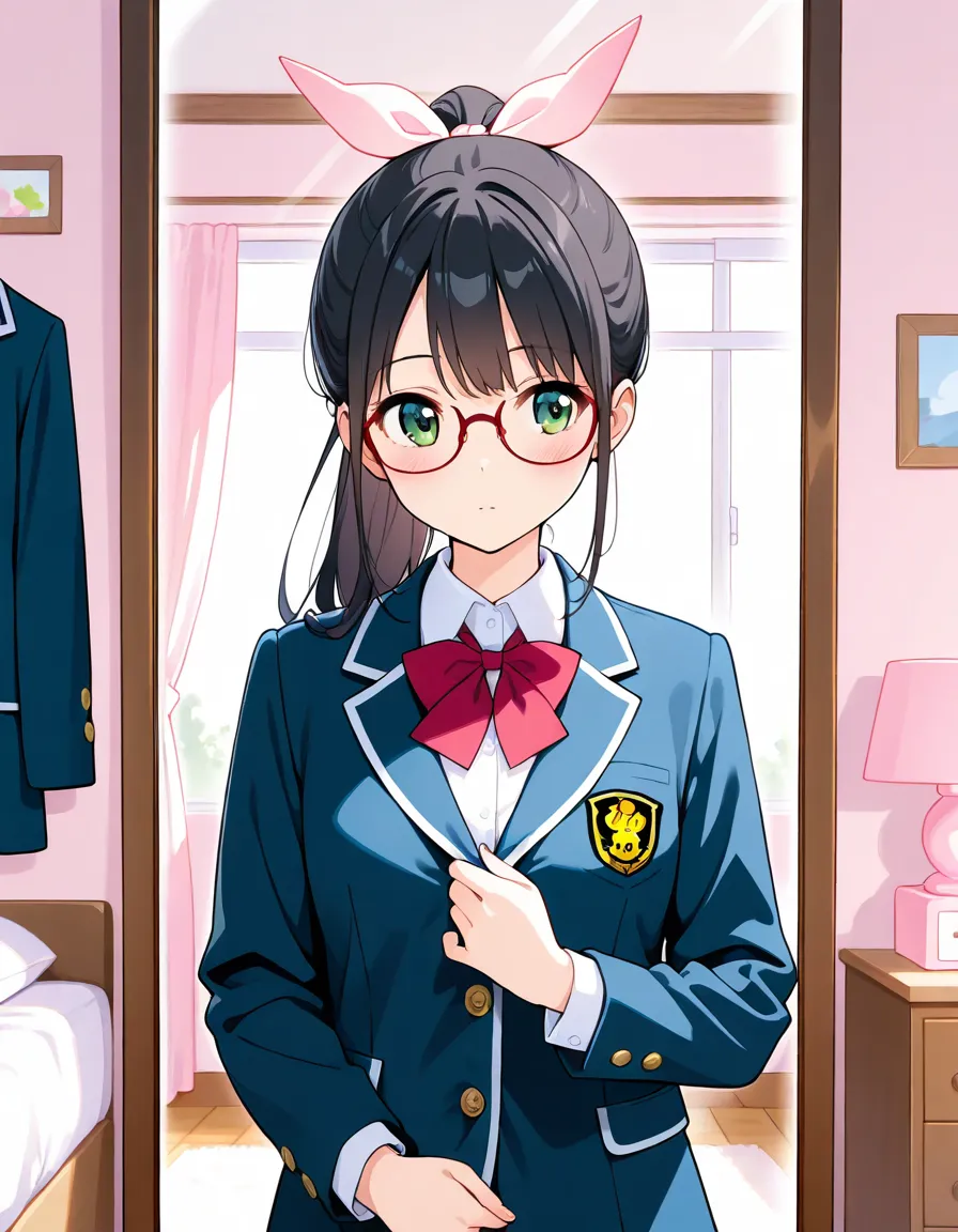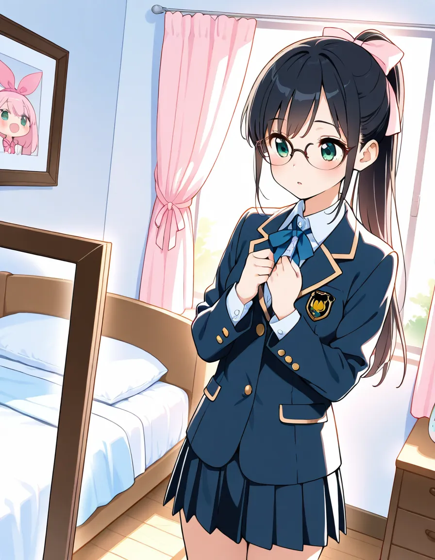 parameters: ((masterpiece)), ((best quality)), (ultra-detailed), ((kawaii)), cute, (lovely), animated style illustration, (morning bedroom:1.5), 1girl, cute girl, solo, (detailed face), (beautiful green eyes), (beautiful black hair), (Straight long hair:1.3), (ponytail), (ponytail tied with a big ribbon:1.3), slim, slender, medium breast, (glasses), wearing school uniform, blazer style uniform, white shirt, (ribbon tie), neat appearance, morning routine, getting ready in her bedroom, standing in front of mirror, adjusting uniform, soft morning sunlight through window, bright and fresh atmosphere, clean bedroom, tidy room, natural lighting, pastel colors, soft shading.