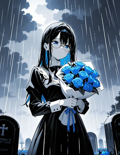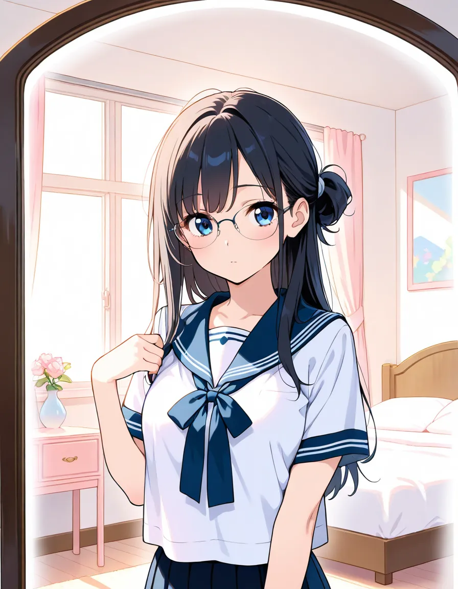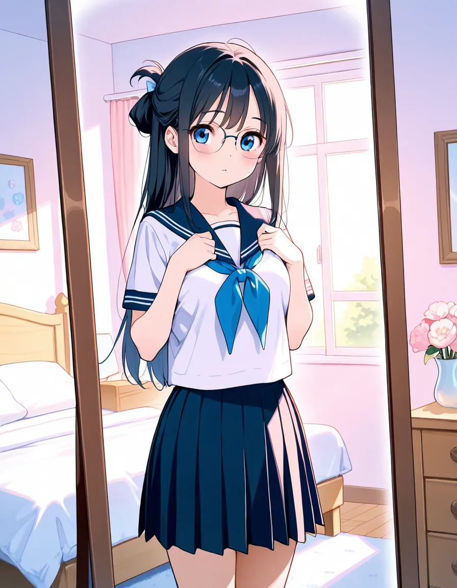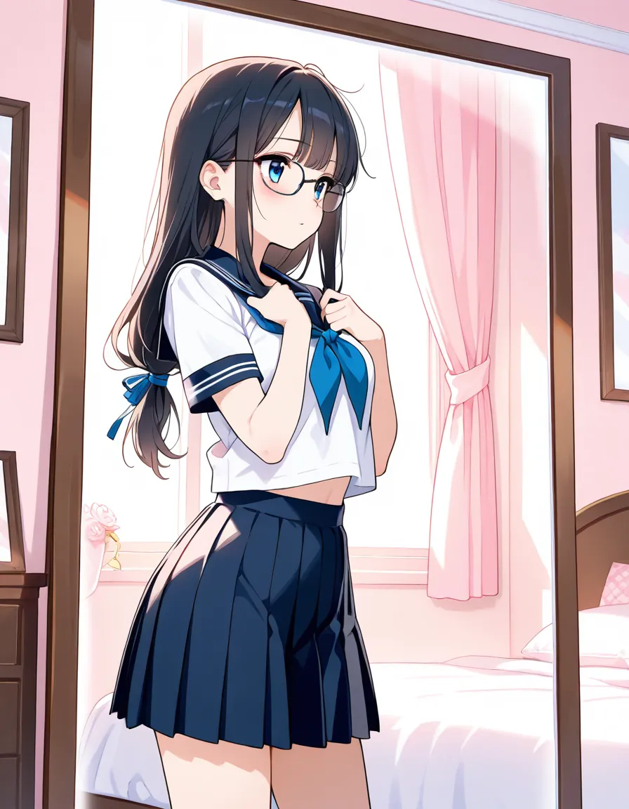 parameters: ((masterpiece)), ((best quality)), (ultra-detailed), ((kawaii)), cute, (lovely), animated style illustration, (morning bedroom:1.5), 1girl, cute girl, solo, (detailed face), (beautiful green eyes), (beautiful black hair), (Straight long hair:1.3), (ponytail), (ponytail tied with a big ribbon:1.3), slim, slender, medium breast, (glasses), wearing school uniform, blazer style uniform, white shirt, (ribbon tie), neat appearance, morning routine, getting ready in her bedroom, standing in front of mirror, adjusting uniform, soft morning sunlight through window, bright and fresh atmosphere, clean bedroom, tidy room, natural lighting, pastel colors, soft shading.