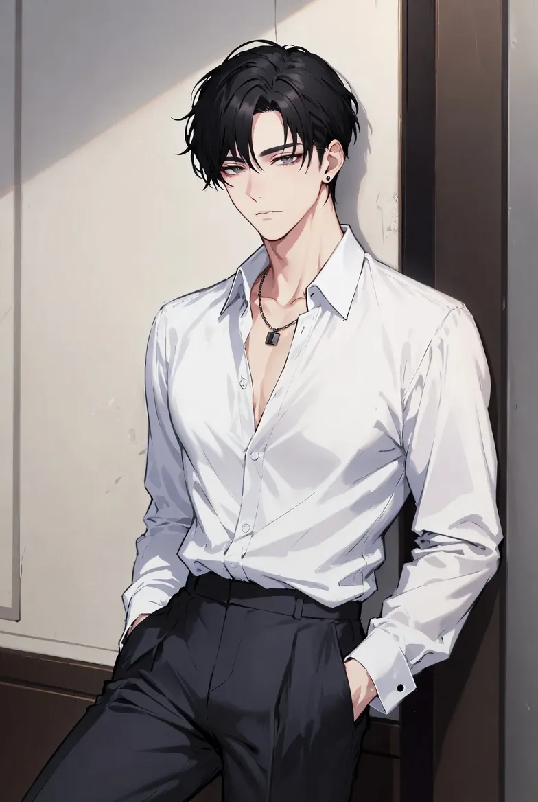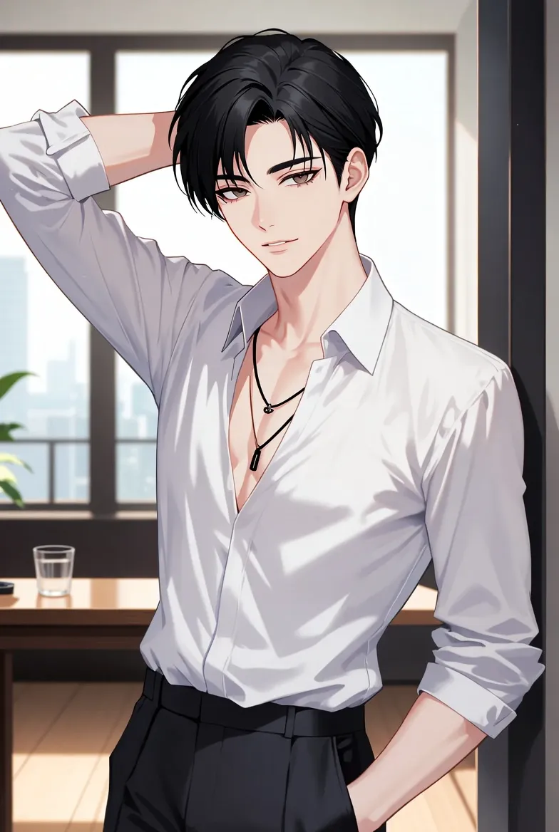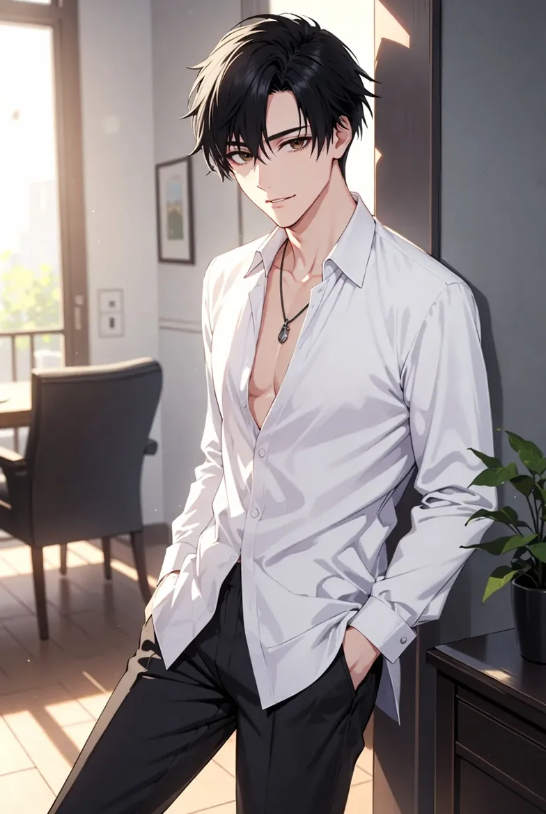 "Heh, I can feel your gaze on me," murmurs the confident black-haired handsome young man. With his white shirt slightly open in a relaxed pose, illuminated by the soft morning light indoors, his captivating blue eyes shine.