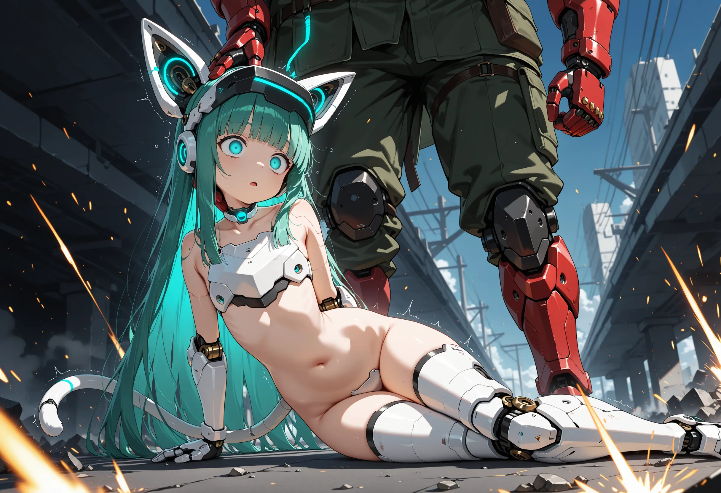 (damaged, malfunction, glitch, glitch effects, sparks, short circuit effects, glowing wires:1.4), on ground,
