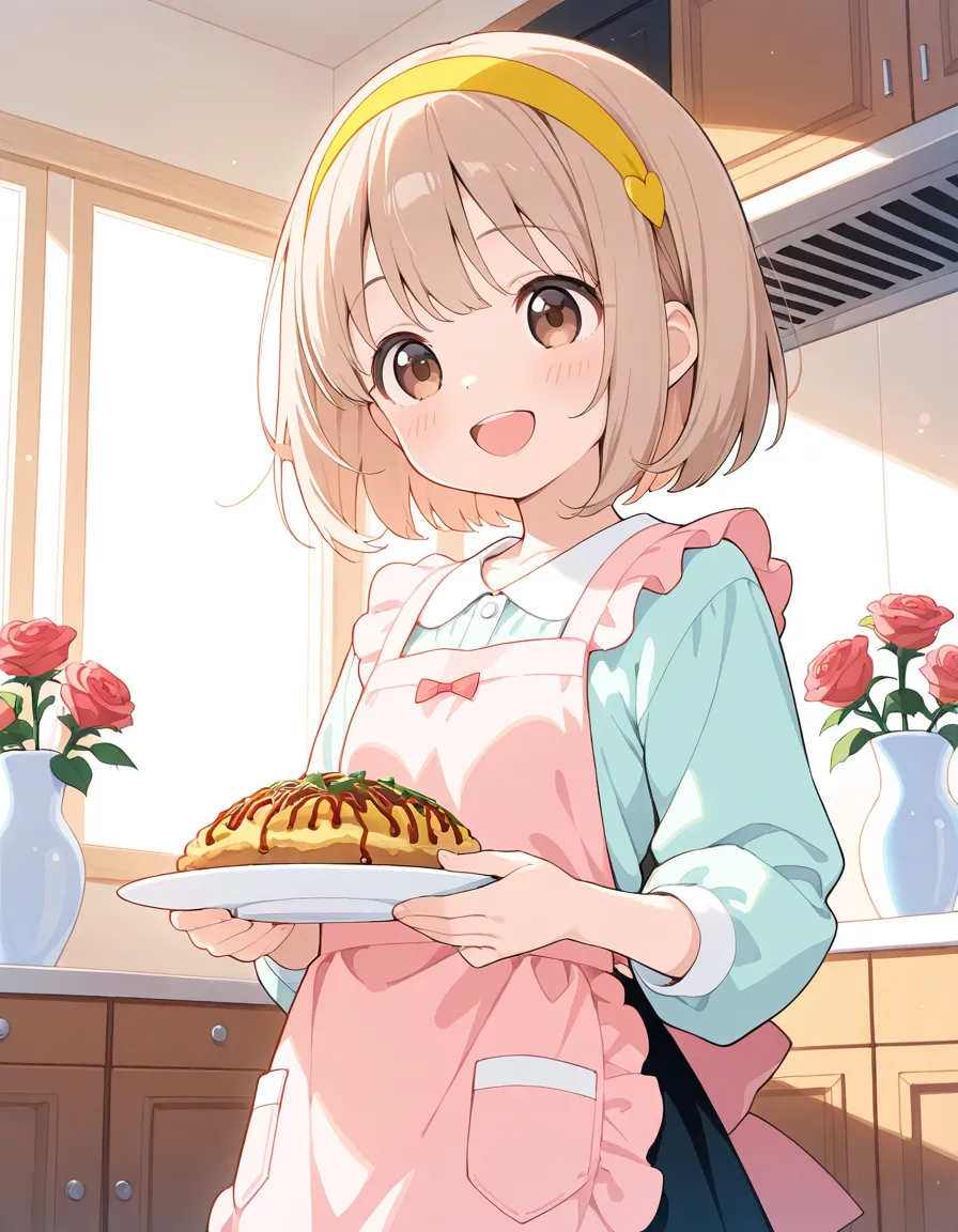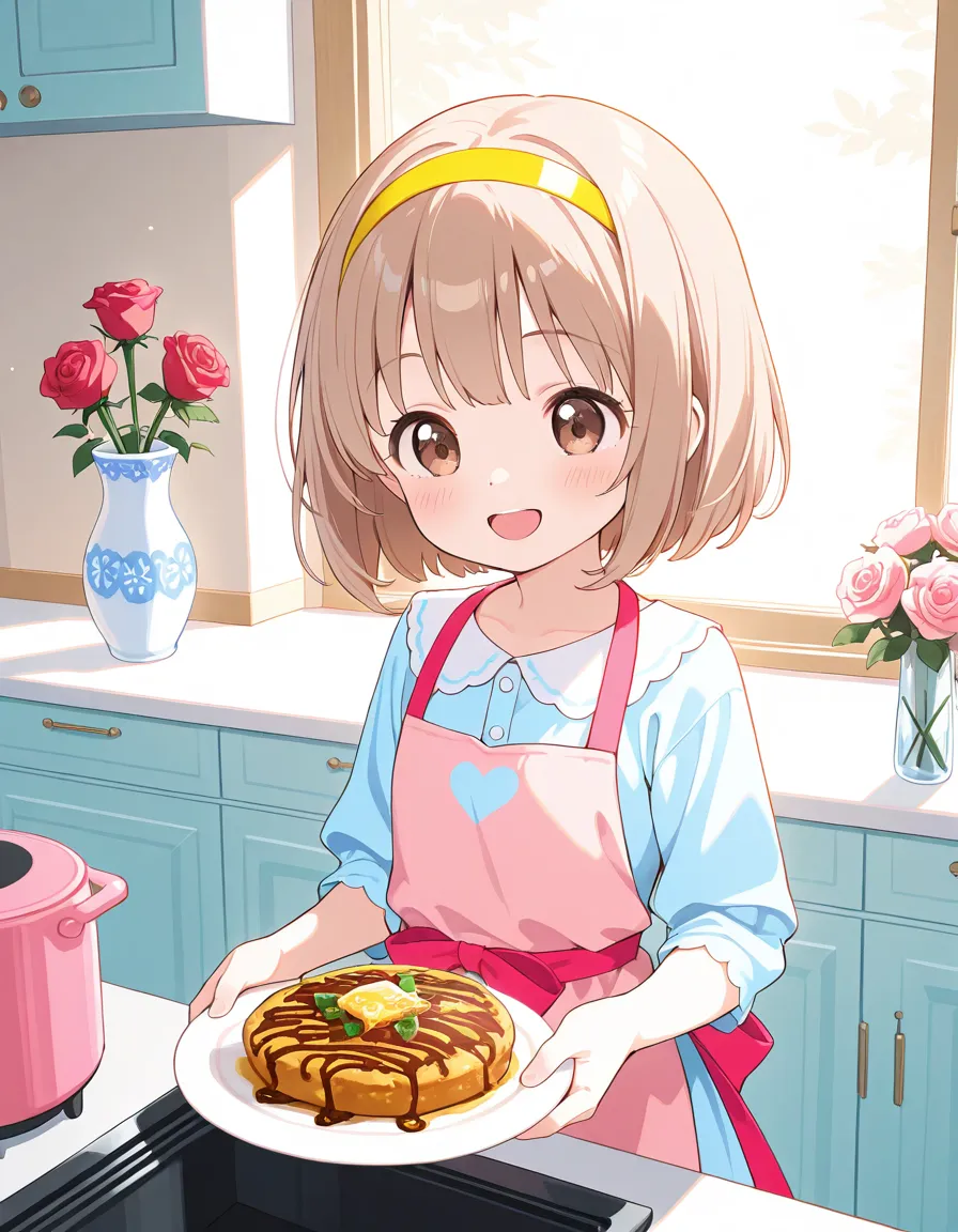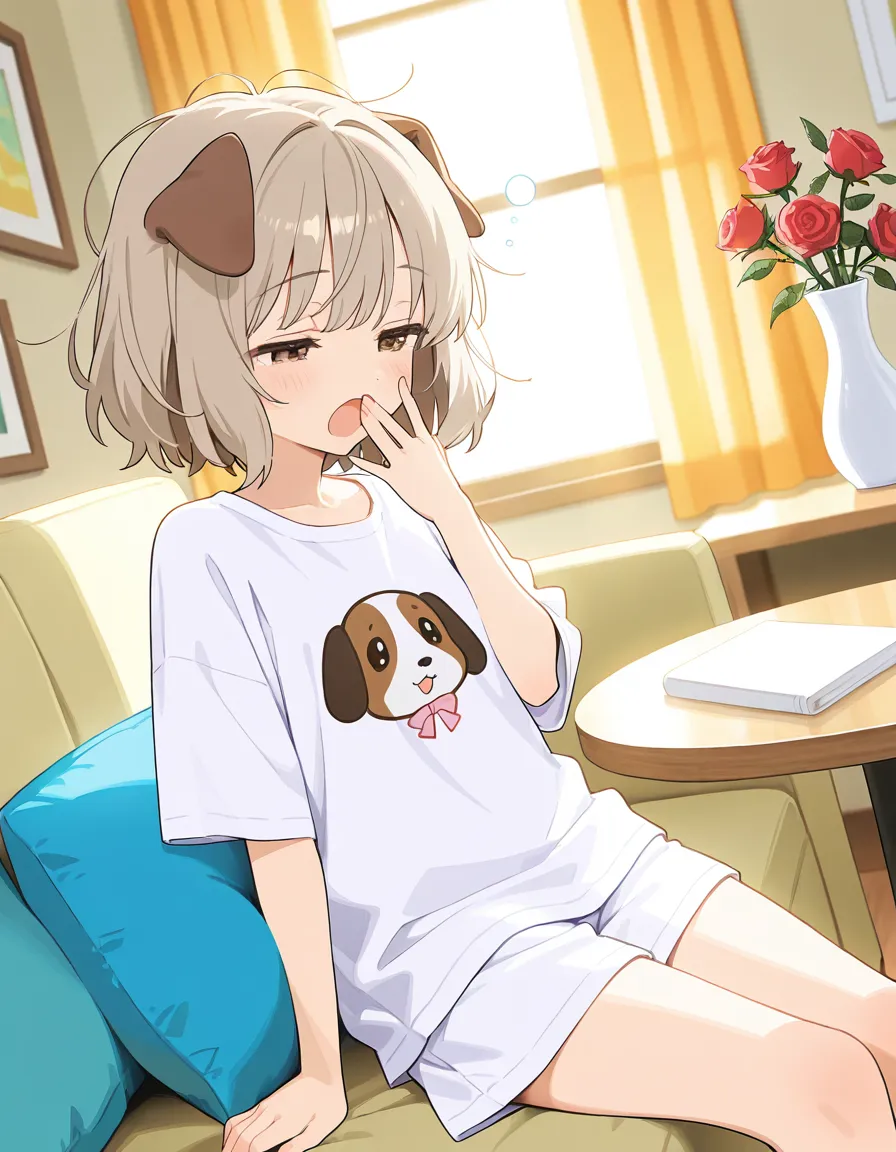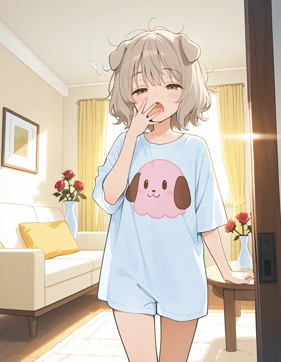 parameters: ((Masterpiece)), ((best quality)), (extremely detailed), animated style illustration, ((kawaii)), cute, (lovely), (cozy living room:1.5), (solo), 1girl, (dog girl), 10yo girl, (pretty little girl:1.3), (beautiful brown eyes), (beautiful light khaki hair:1.3), (short hair:1.2), (Slightly longer droopy dog ears:1.6), slim, small breast, soft lighting, (Afternoon atmosphere), a sleepy beautiful girl just woke up, slight bed hair, messy hair strands, half-closed sleepy eyes, yawning, covering mouth with one hand, wearing loose pajamas, slightly oversized T-shirt, walking into a cozy living room, warm sunlight streaming through the window, soft shadows, natural Afternoon light, comfortable sofa, low table, curtains glowing in sunlight, calm daily life scene, peaceful mood, medium shot, eye-level angle, detailed hair, subtle blush, gentle expression, (Roses in a vase in the background:1.3), (no dog).