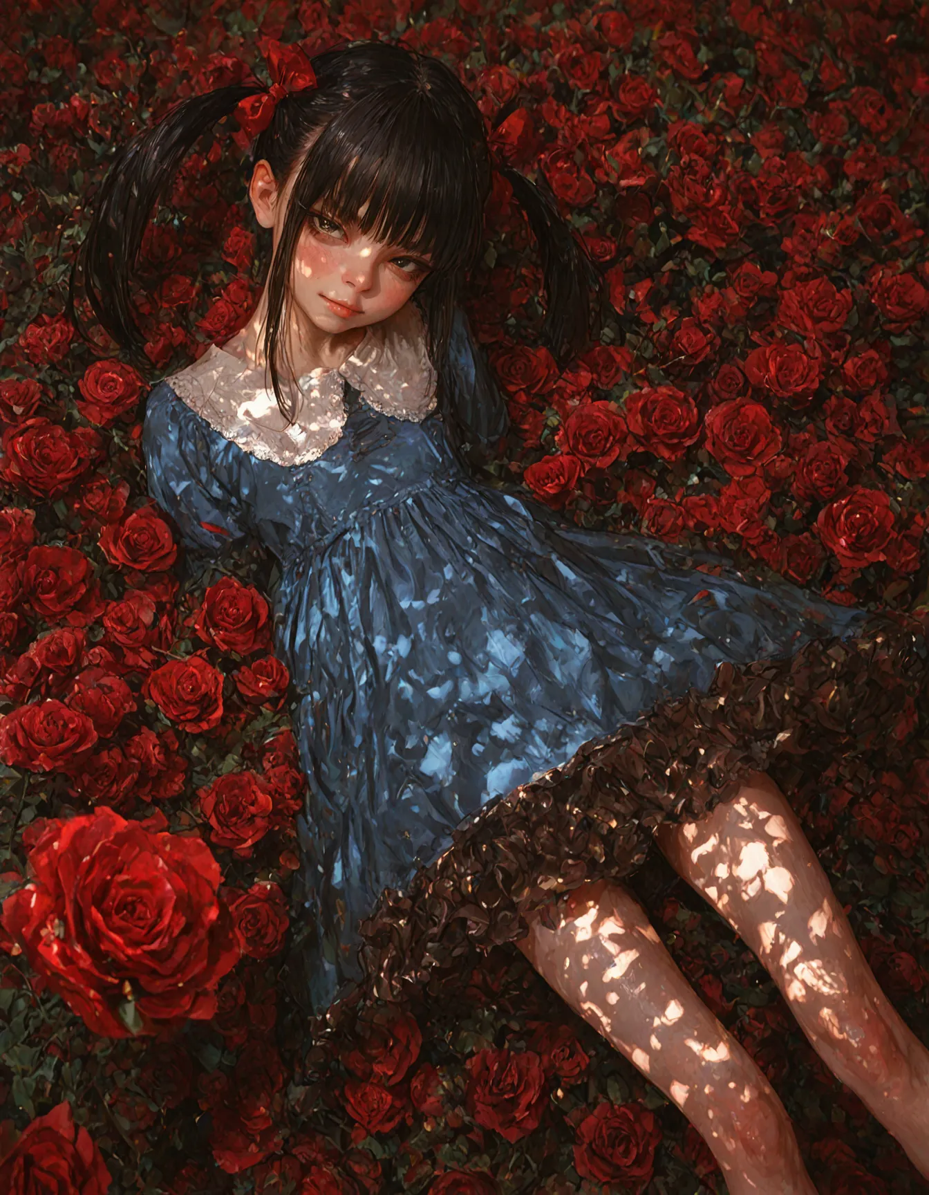 A girl lies in a field of red roses, her black hair swaying in the breeze, her blue dress glistening in the sunlight. In the rain-soaked garden, she chases lost memories. The thorns of the roses gently brush her skin, reviving adventures from a distant past. Reflected in her eyes is the moment a secret door opens. Surrendering to the sea of petals, a dreamlike journey begins.
