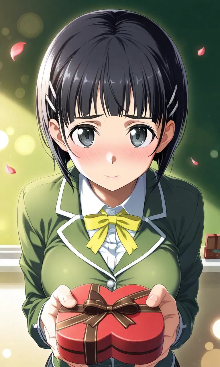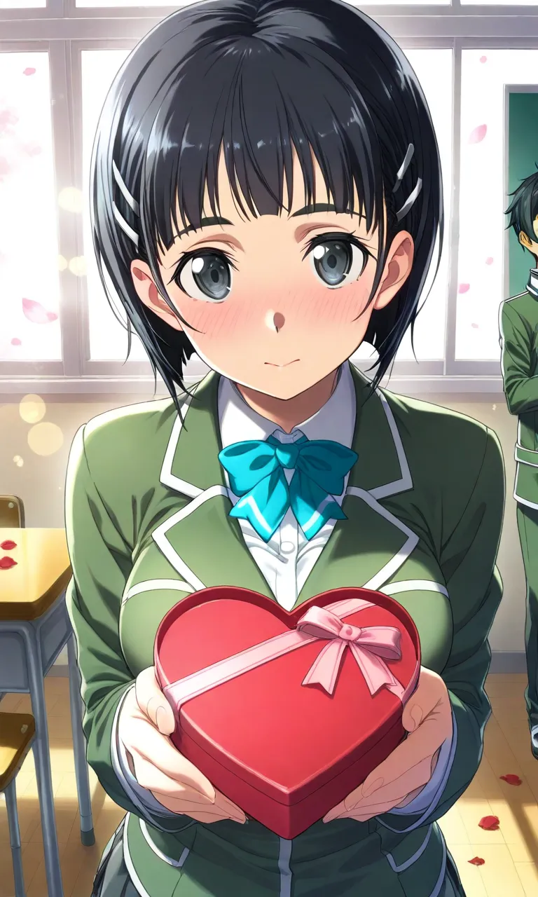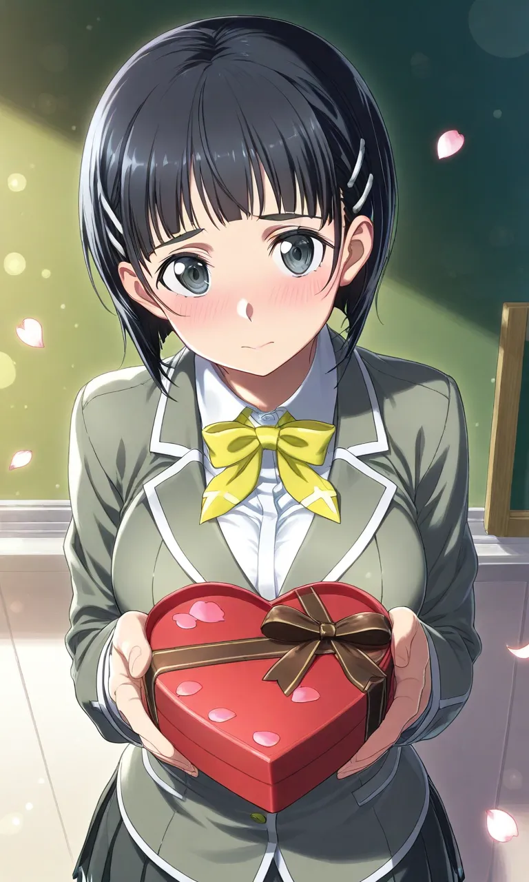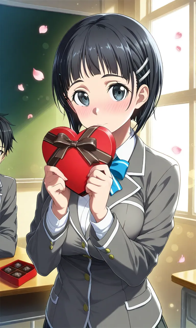 "Will you accept this...?" she murmurs with blushing cheeks, holding out a heart-shaped chocolate box. A shy girl in school uniform, in a scene of Valentine's confession with cherry blossoms floating around.