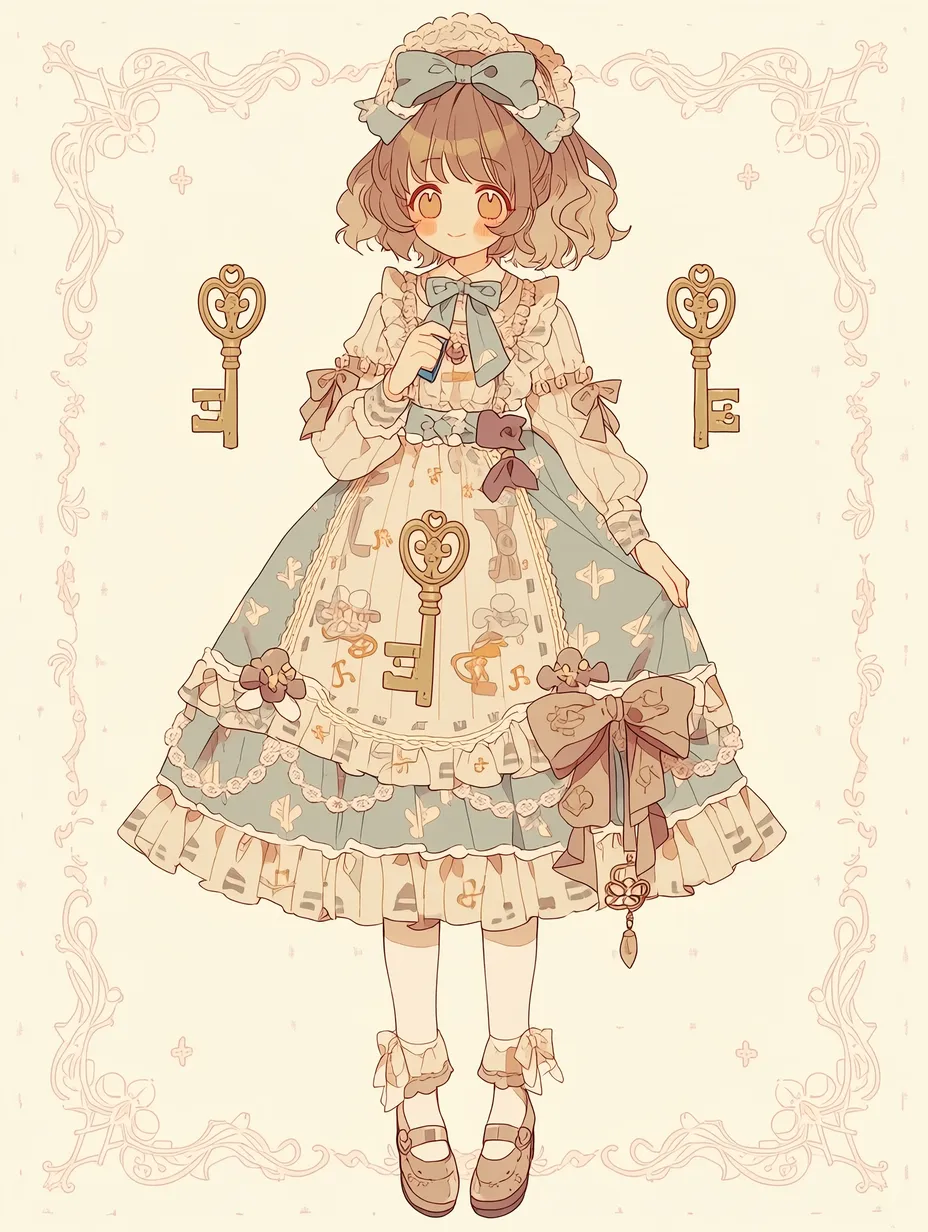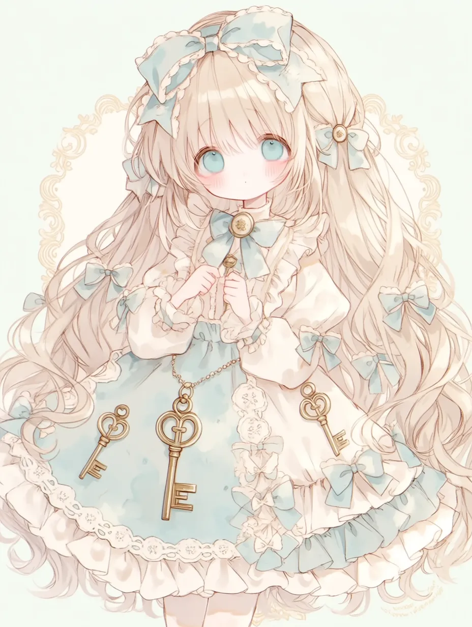The girl in a blue dress carries shining keys as the guardian of an old mansion. Her long blonde hair sways in the wind, and the key in her hand opens a forgotten door. One day, the curious girl embarks on an adventure guided by the key. A magical forest and hidden treasures await there. In the moment her blue eyes sparkle, the door to the story quietly opens. Won't you join her in exploring the secrets?