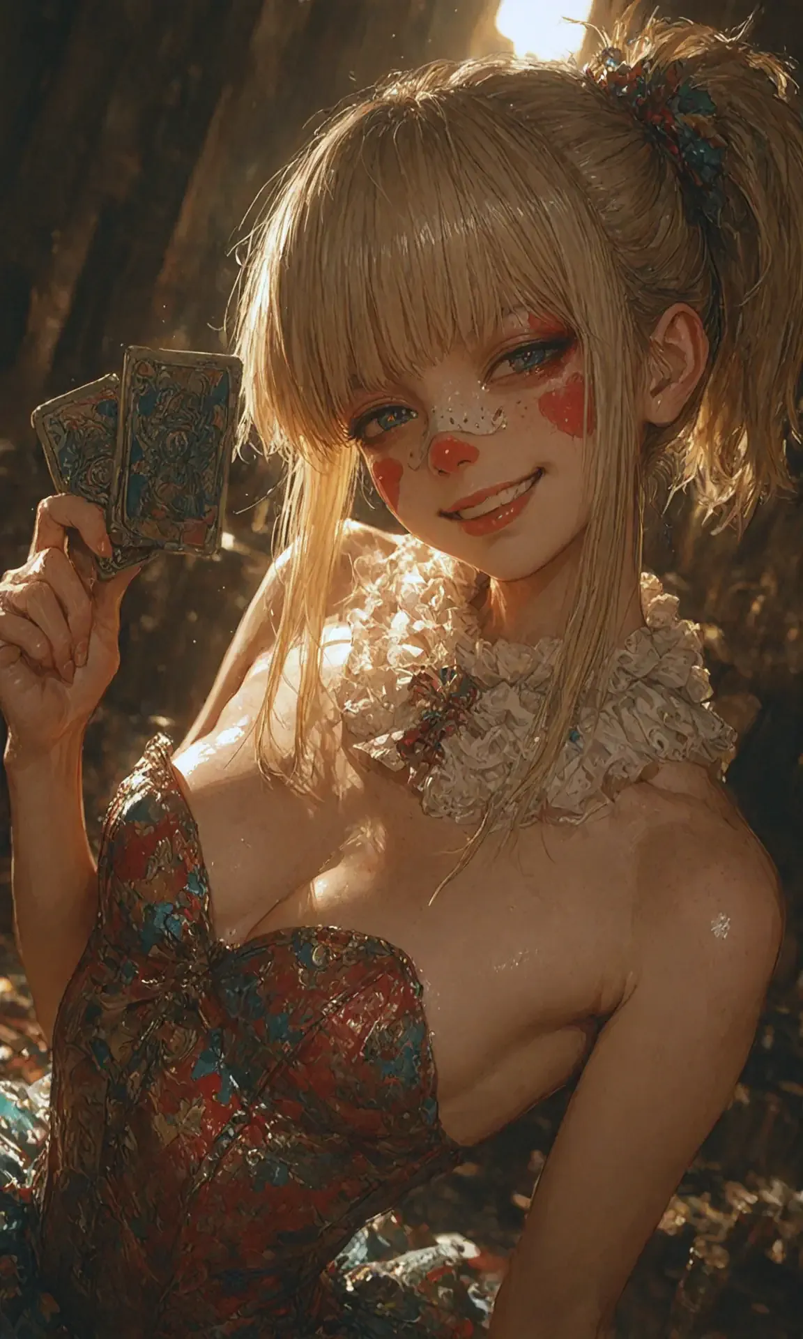 In the dim circus dressing room, the mischievous harlequin holds out a card. Her red eyes gleam wickedly, her vibrant costume glistening with sweat. Who's her target tonight? Her smile hints at an unpredictable adventure. With one card, fates change in this night of whimsy, where she captivates the audience. Will you join her game?
