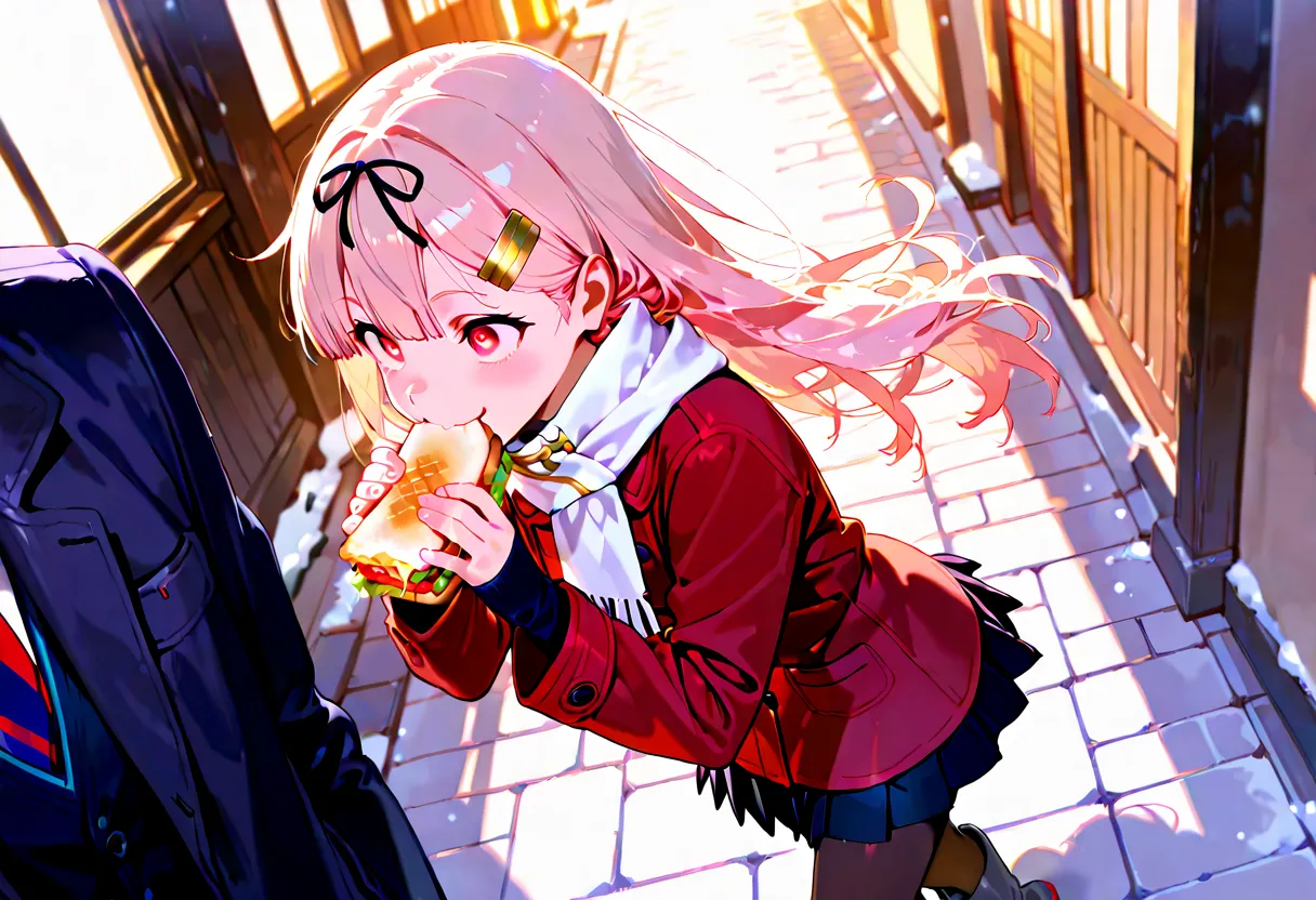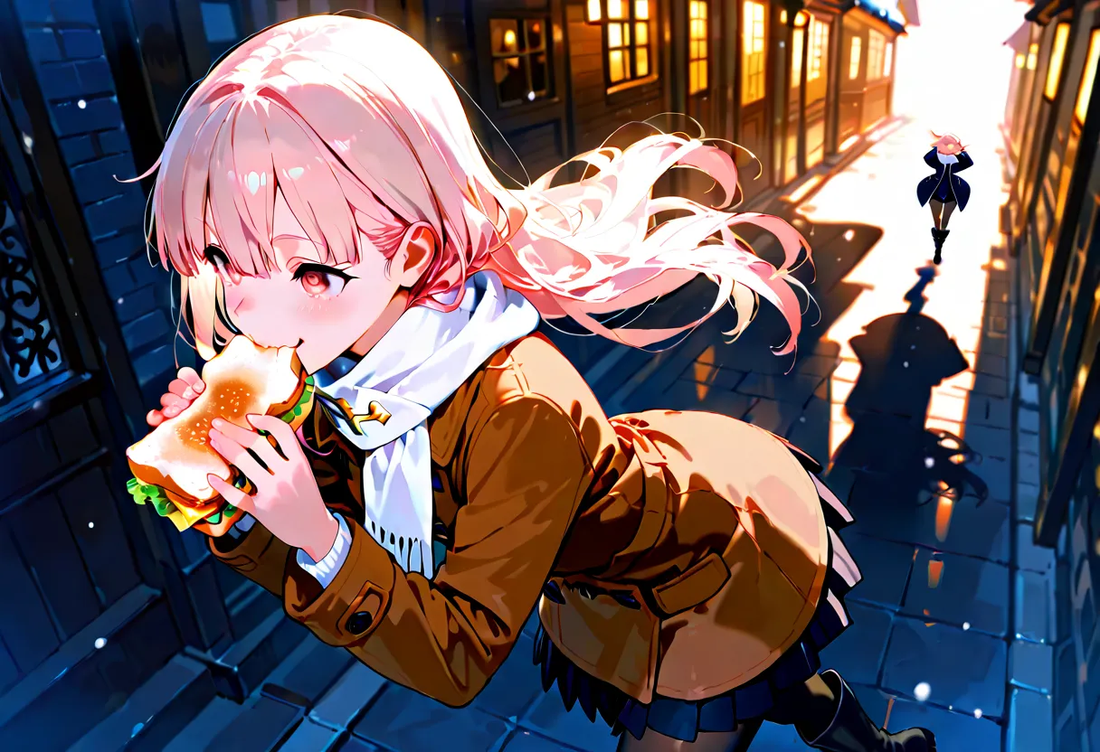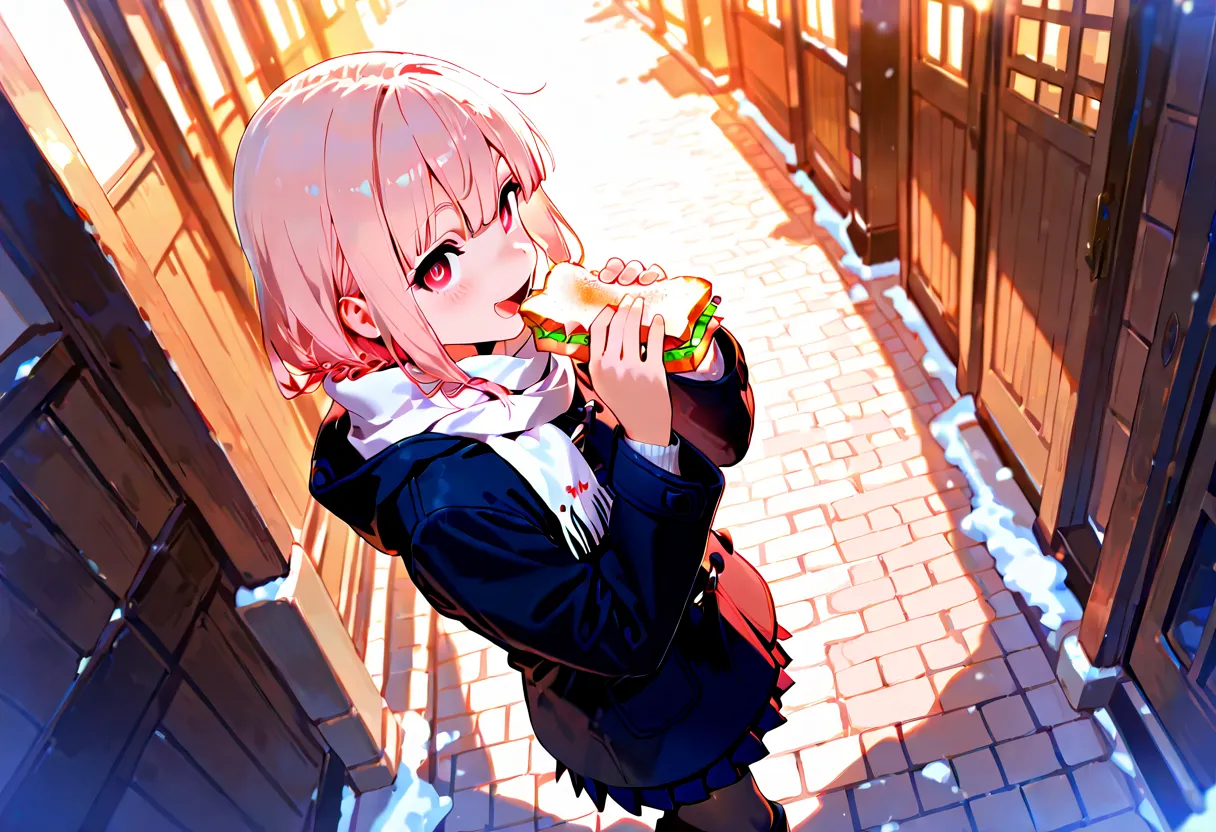 Girl's Winter Tale Munching in Snowy Alley