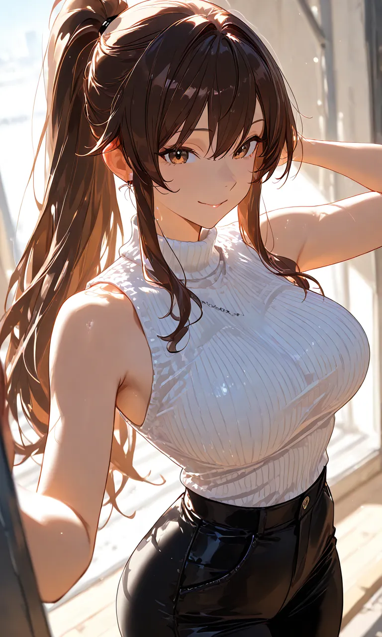 体のラインがわかる服装と爆乳ポニテ…たまらん!