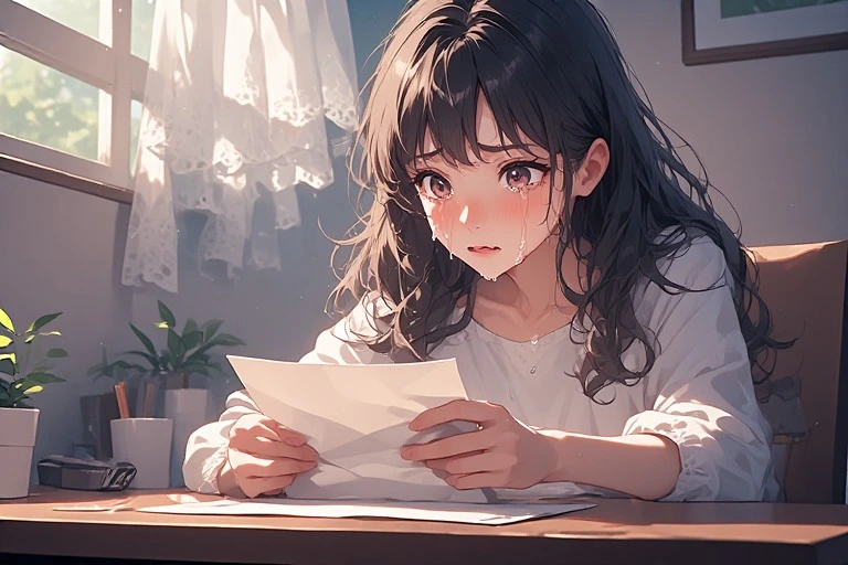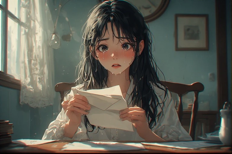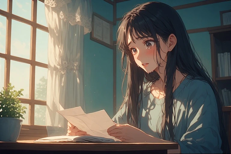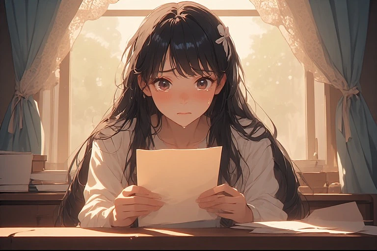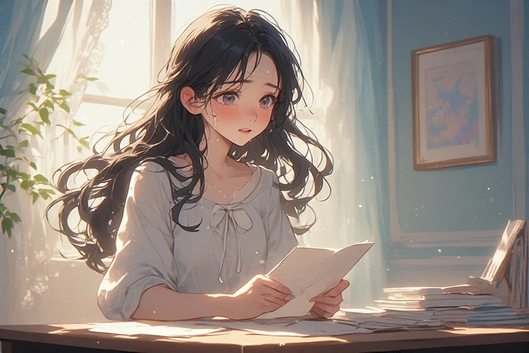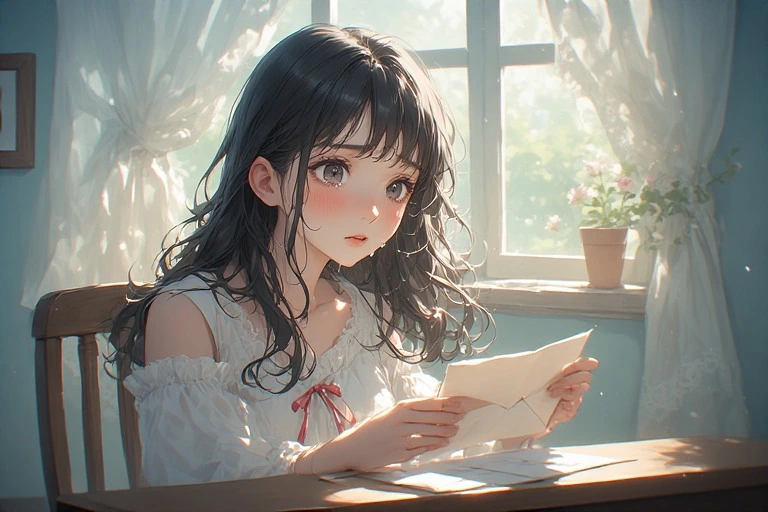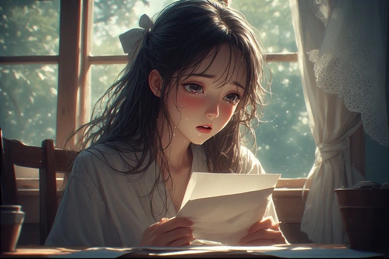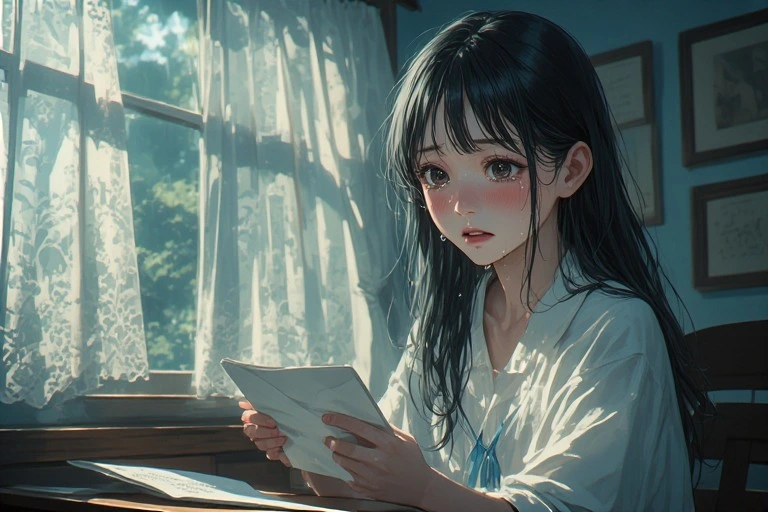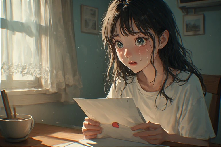 In a serene morning room, a black-haired girl holds a letter, her eyes brimming with tears under the soft light from the window. Is it a message from a distant lover, or a fragment of lost memories? The words on the paper gently stir her everyday life, hinting at the start of a new adventure. The viewer can't help but imagine the reason behind her tears, weaving their own poignant tale.
