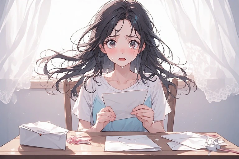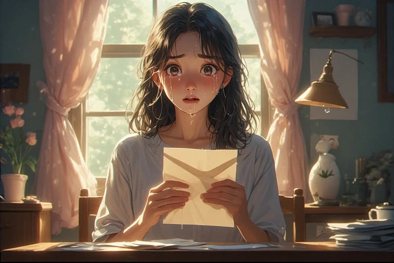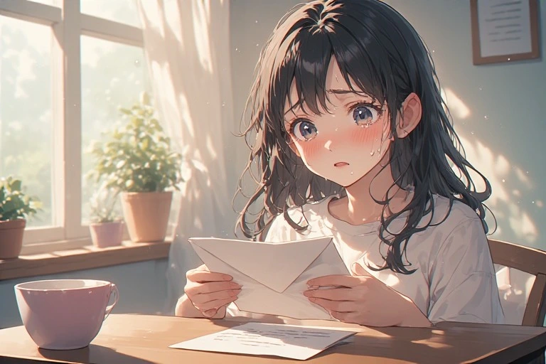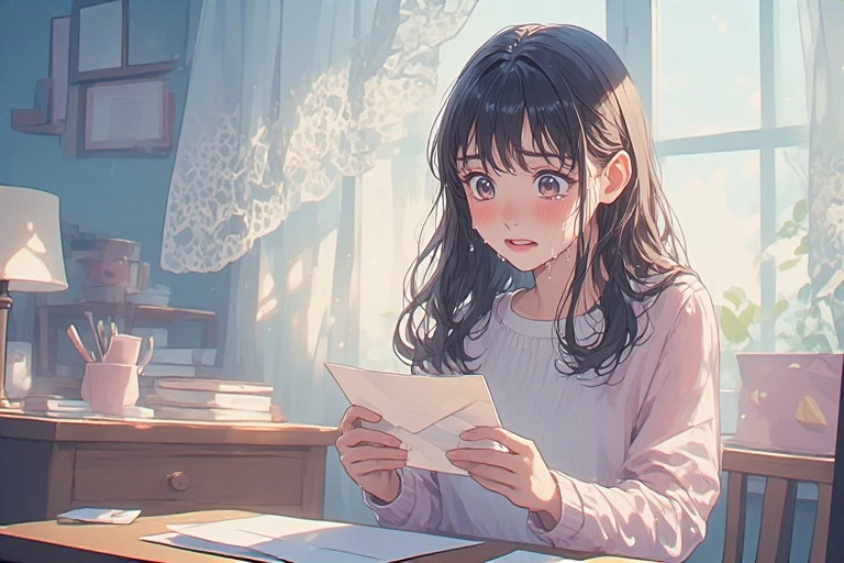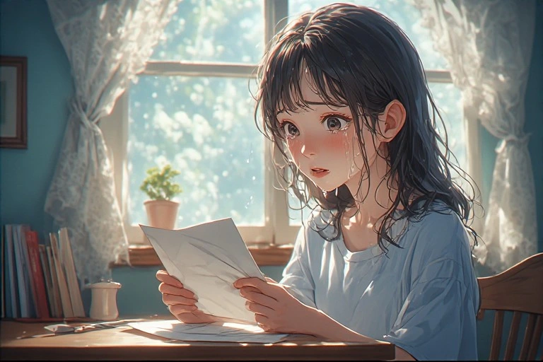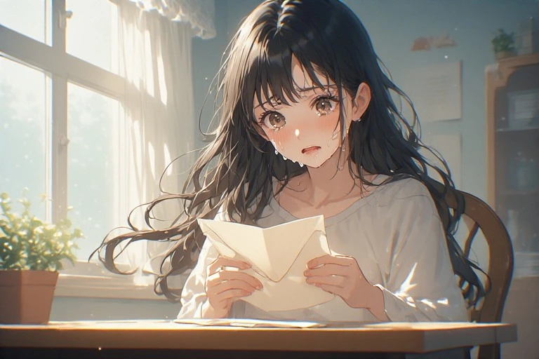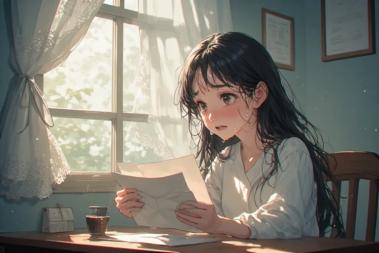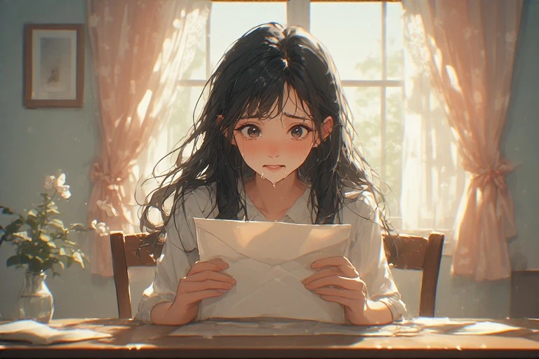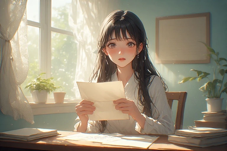 In a serene morning room, a black-haired girl holds a letter, her eyes brimming with tears under the soft light from the window. Is it a message from a distant lover, or a fragment of lost memories? The words on the paper gently stir her everyday life, hinting at the start of a new adventure. The viewer can't help but imagine the reason behind her tears, weaving their own poignant tale.