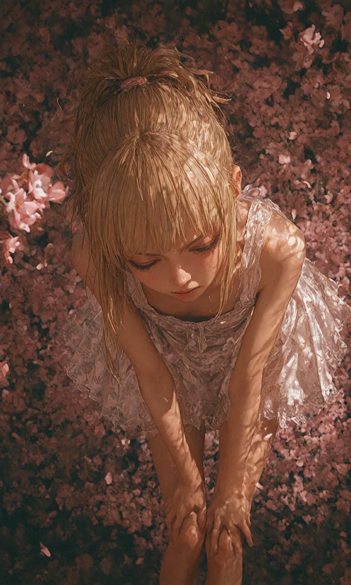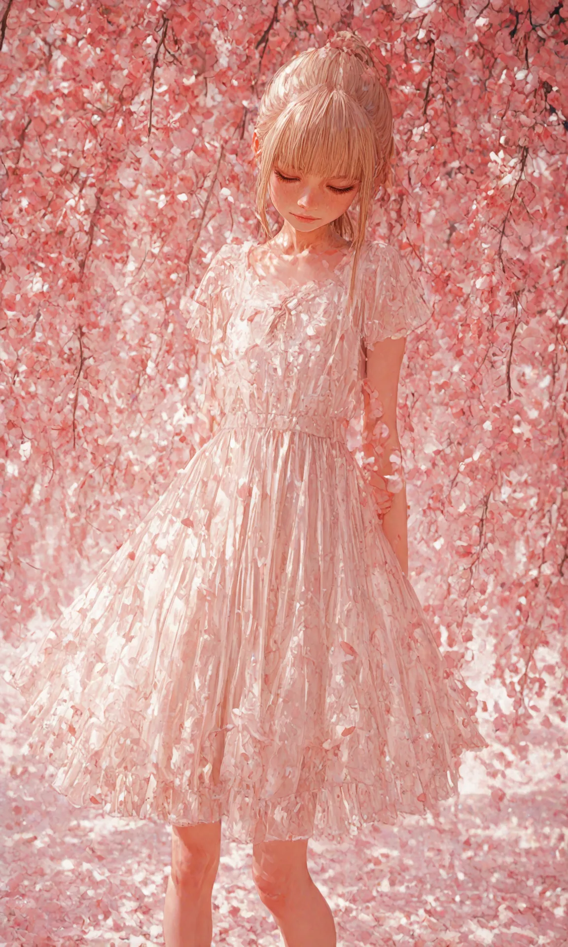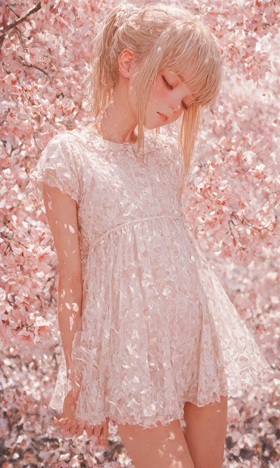 Under the blooming cherry trees, a blonde-haired girl sways gently in her white lace dress, blending with the falling petals. With eyes cast down, she harbors a precious memory, as the wind caresses her heart with dancing flowers. In this cherry blossom season, a small adventure unfolds—she recalls a lost promise and prepares to take a new step. The viewer can't help but imagine the story hidden in her gaze.
