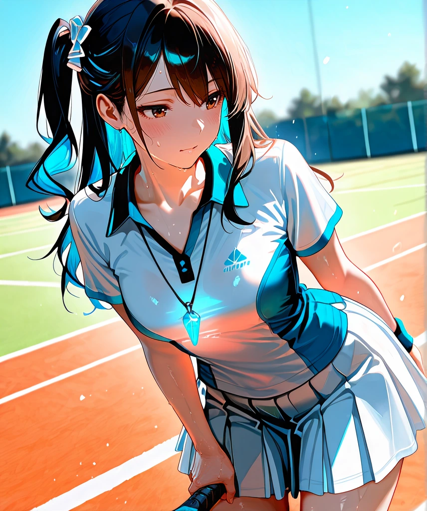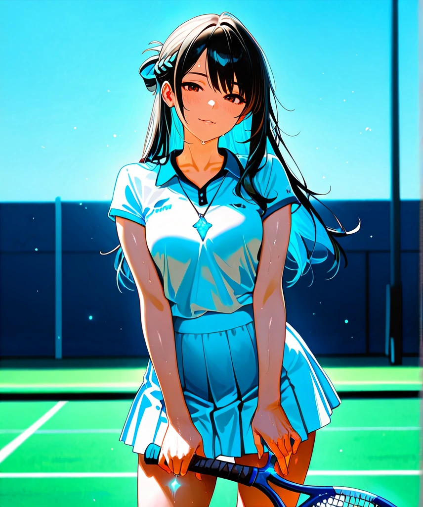 An illustration of a cute girl holding a racket on a tennis court under a blue sky, in anime style.