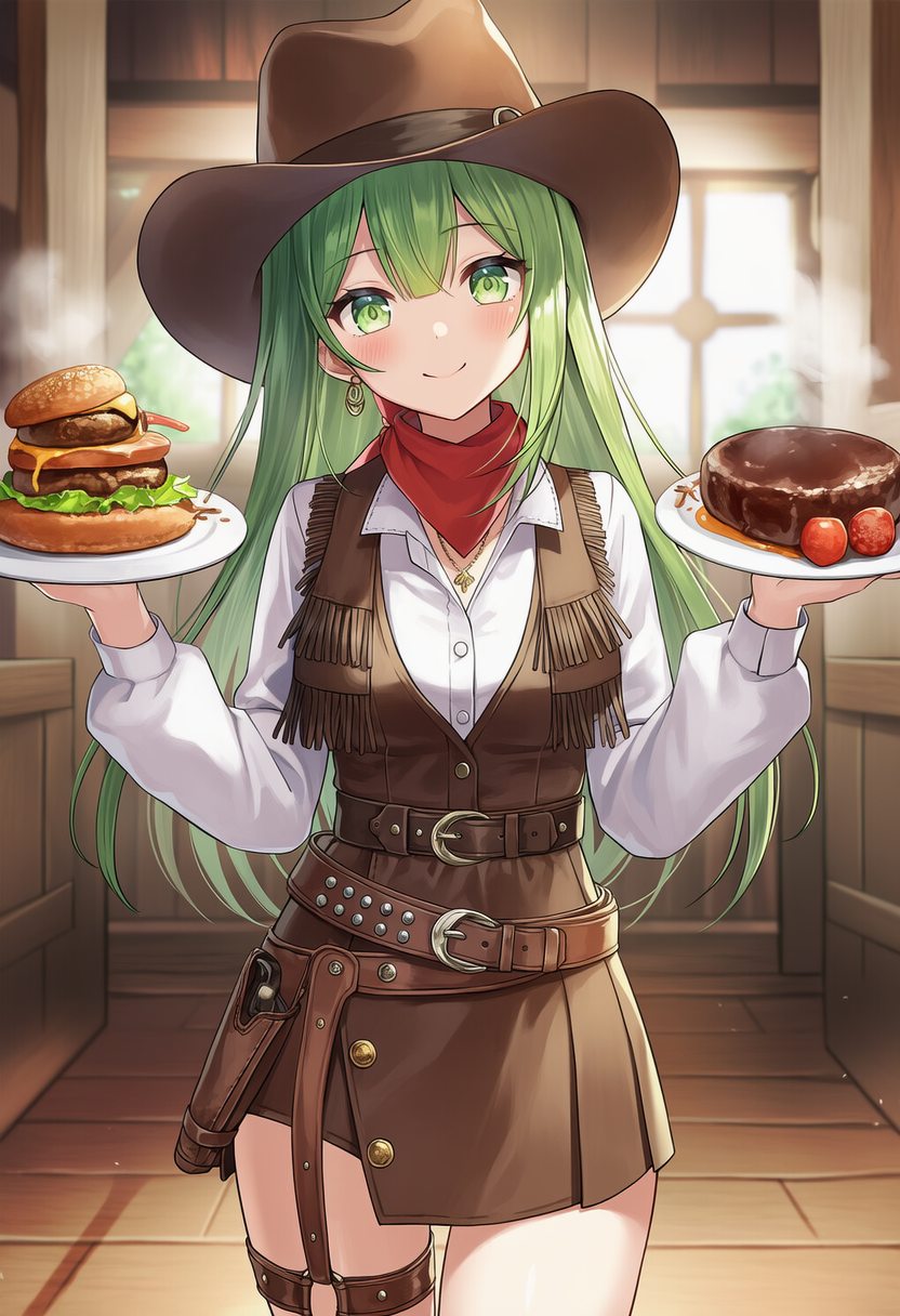 A green-haired cowboy girl holds a burger and chocolate cake. Warm light envelops the wooden room, her gentle smile captivating. Enticing steam rises from the treats.