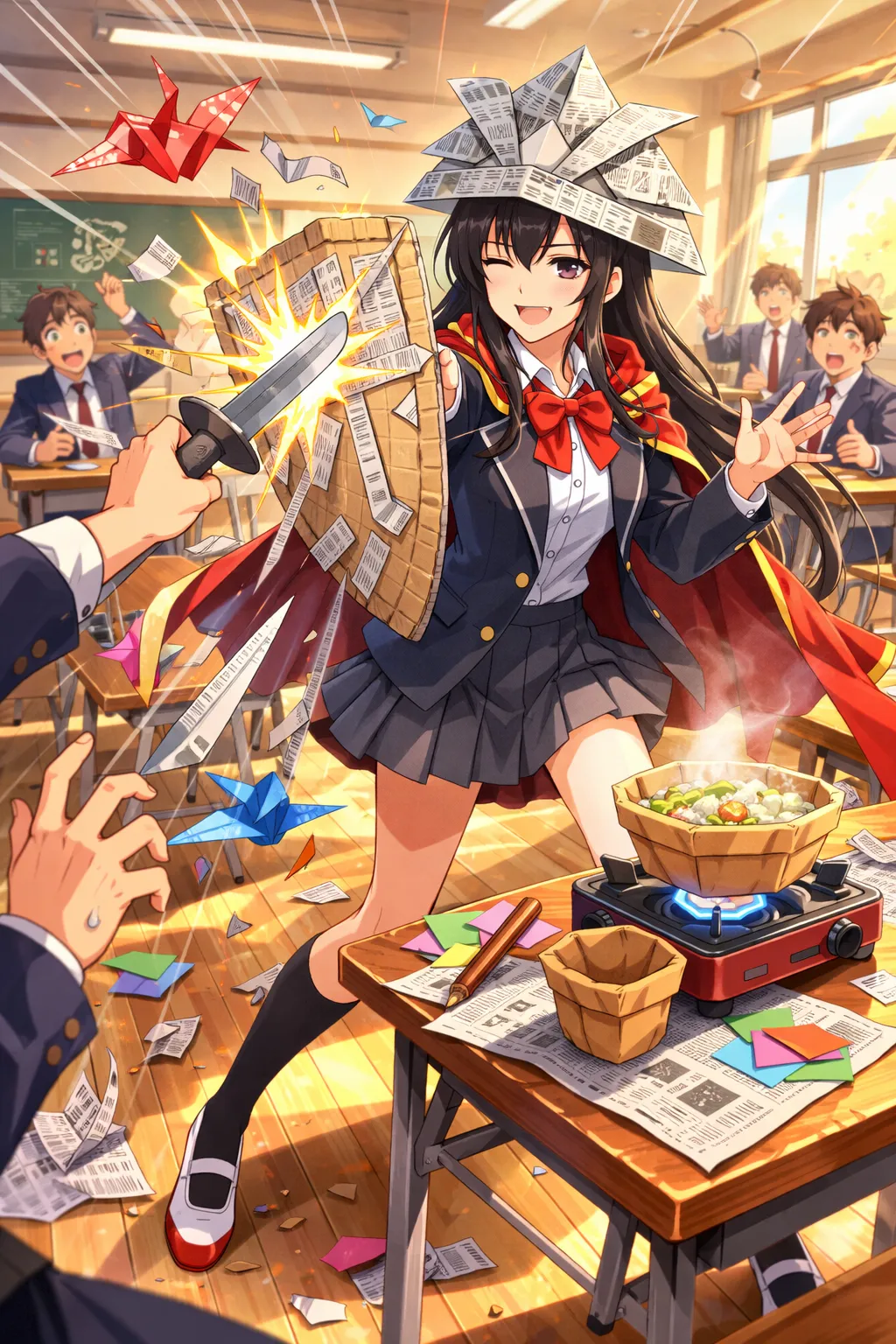 現実でも何枚も糊で重ねて貼っていけば紙の盾は作れますね。分厚い紙はそうそう簡単には切り裂けないし、摩擦が強いので矢や銃弾も食い止められます