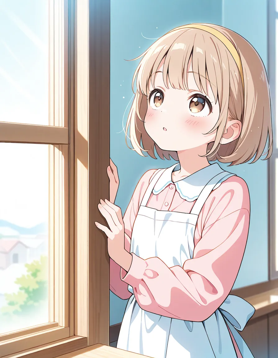 parameters: ((masterpiece)), ((best quality)), (ultra-detailed), ((kawaii)), cute, (lovely), animated style illustration, (kitchen), indoor, (solo), 1girl, loli, (10yo girl), (pretty little girl:1.4), (beautiful brown eyes), (beautiful light brown hair:1.3), (short hair:1.2), (yellow hairband:1.2), slim, small breast, (anxious expression:1.3), (apron:1.3), (wearing a cute pastel-colored ensemble:1.2), (Looking out the window at the sky with concern:1.5), (looking up), (soft lighting), Warm sunshine, pastel color tones, (Happy atmosphere).