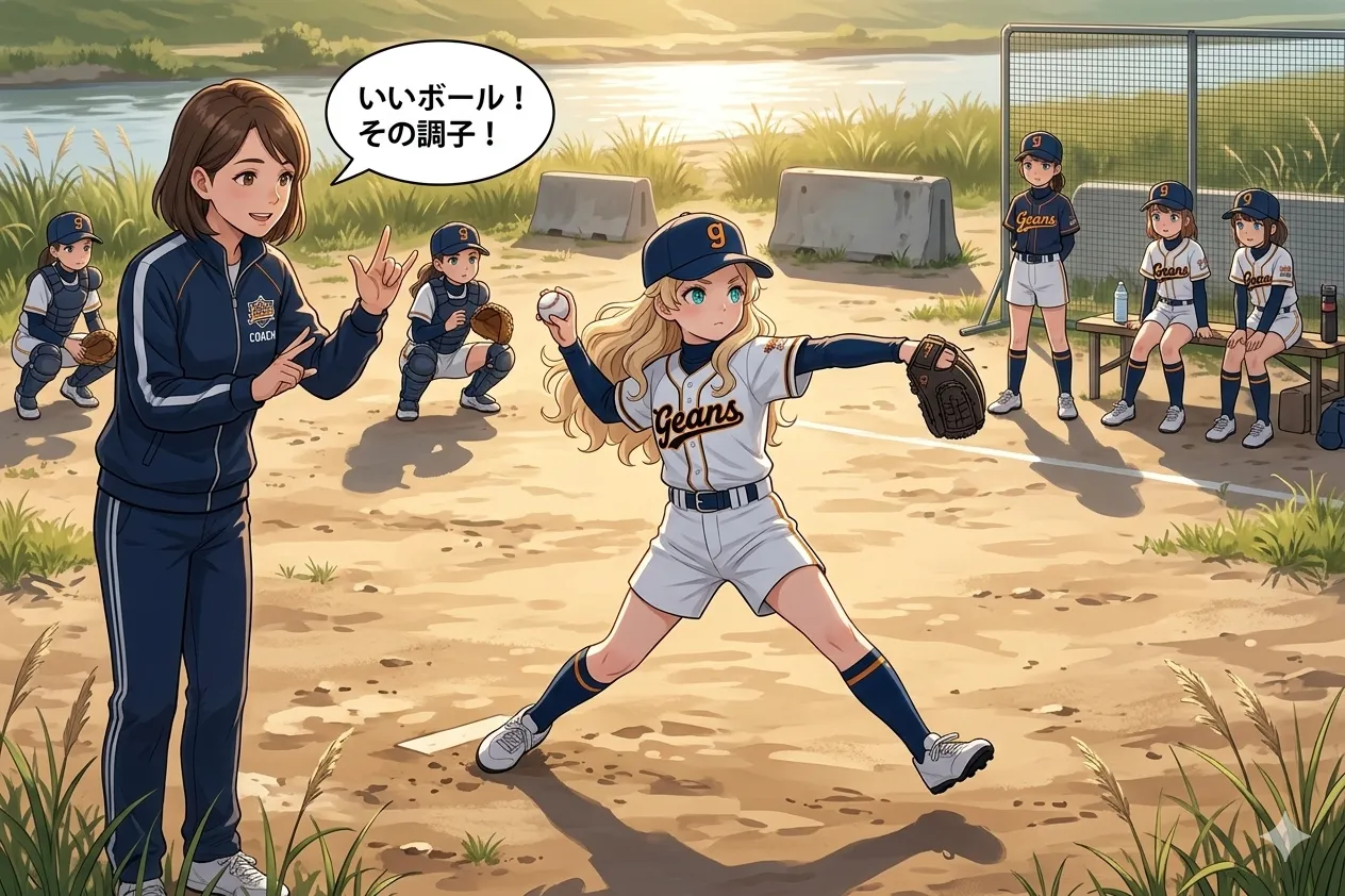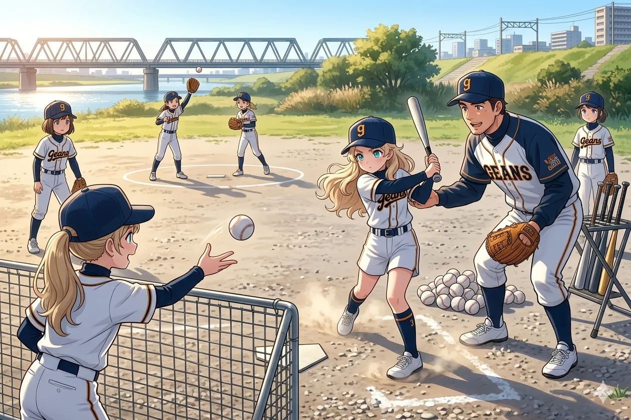 女子野球チームに入っているおでこちゃん?今日は練習日のようですね。練習後は皆で食事をしたようです