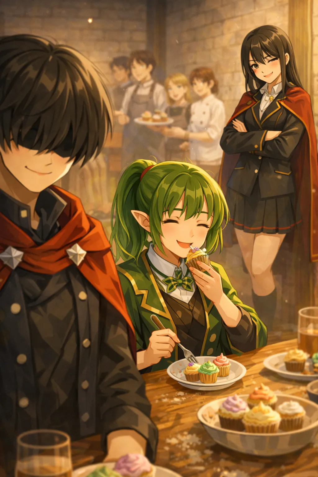 手前の学生は、提出したカップケーキを眺め、口元だけがわずかに動く。皮肉っぽくも、少し楽しんでいる――そんな含みのある笑みだ。前髪で目元は隠れ、視線は自然に周囲を観察しているように見える。