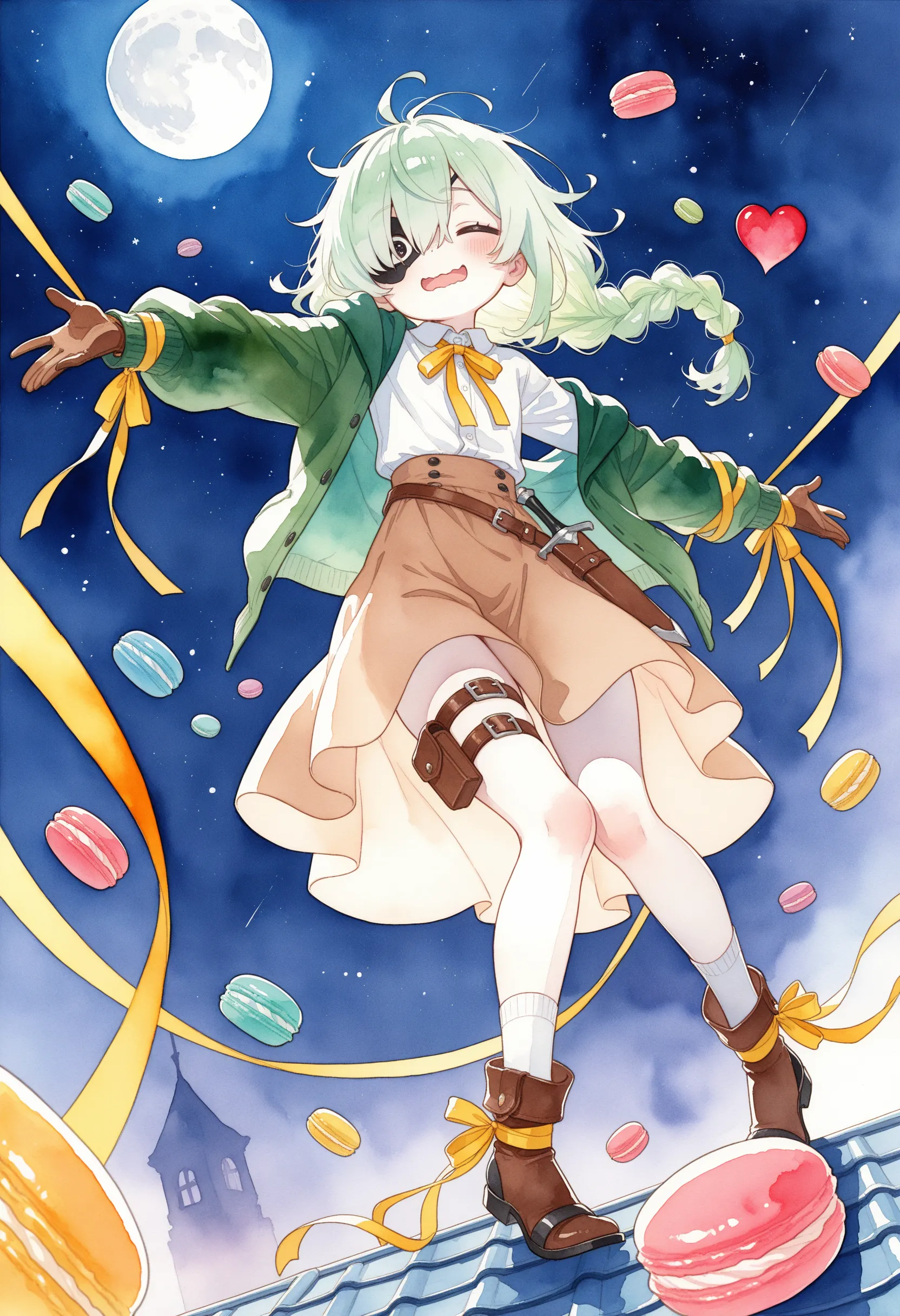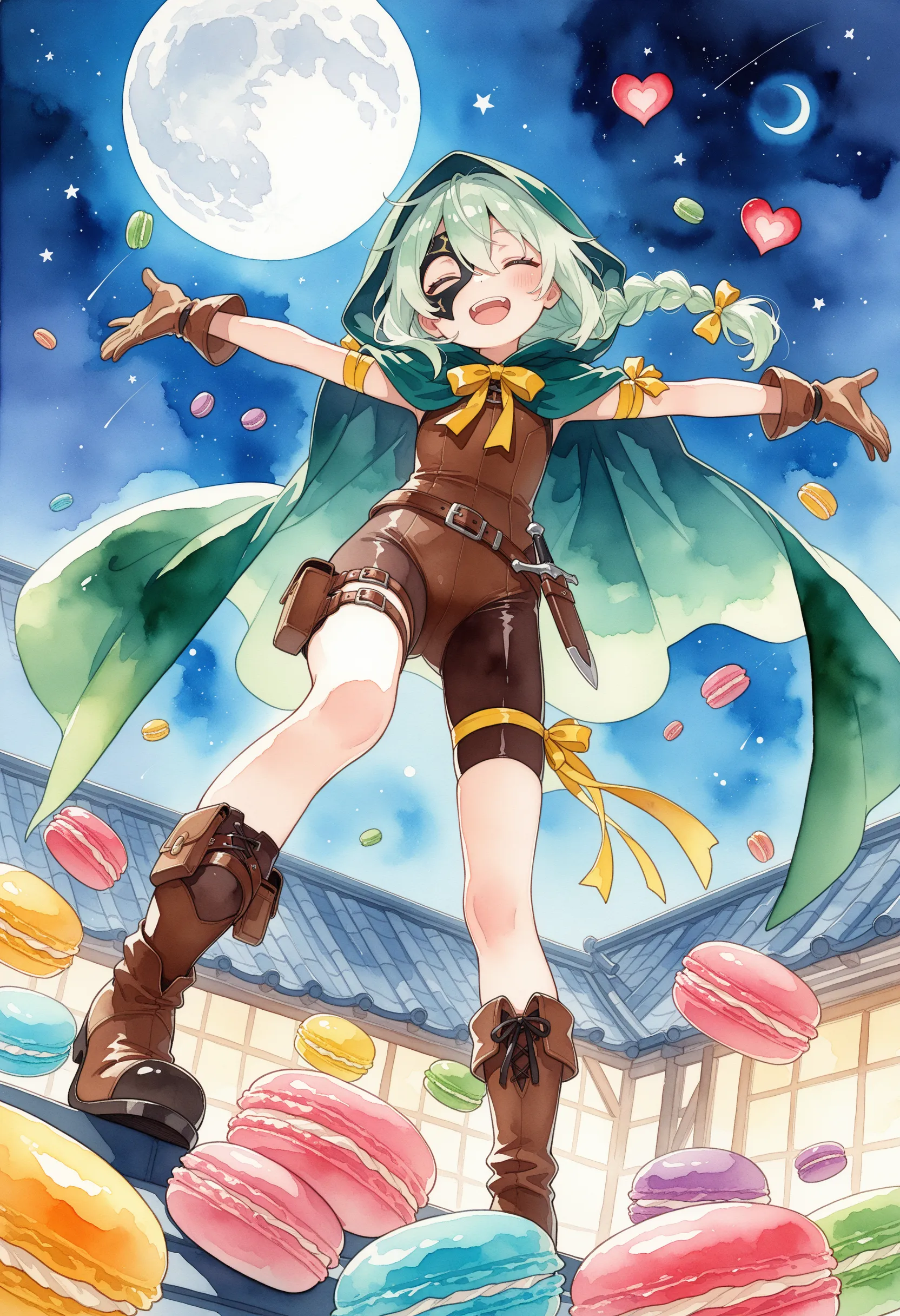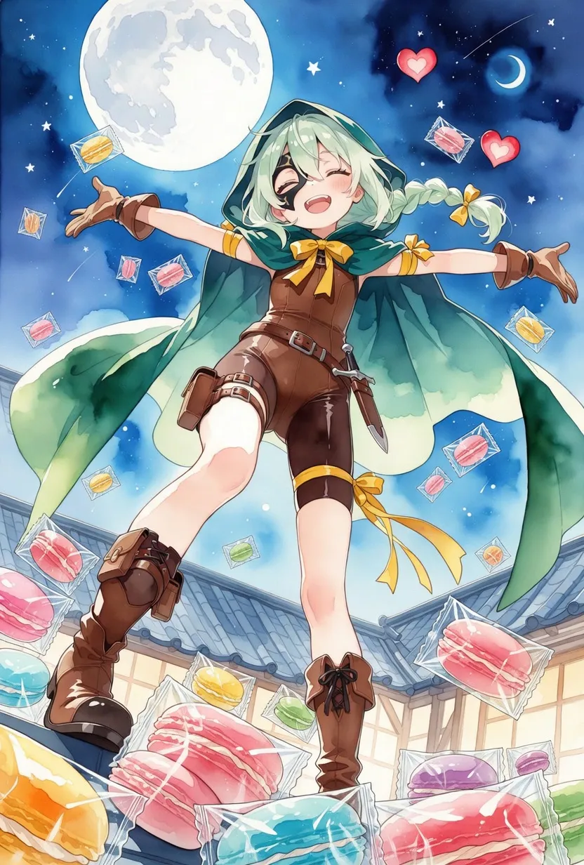night, on roof, glitche, double exposure, star, moon, throwing heart-shaped macaron, wrapped macaron, arms up, spread arms,
