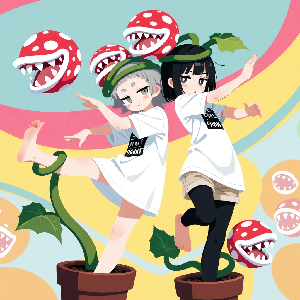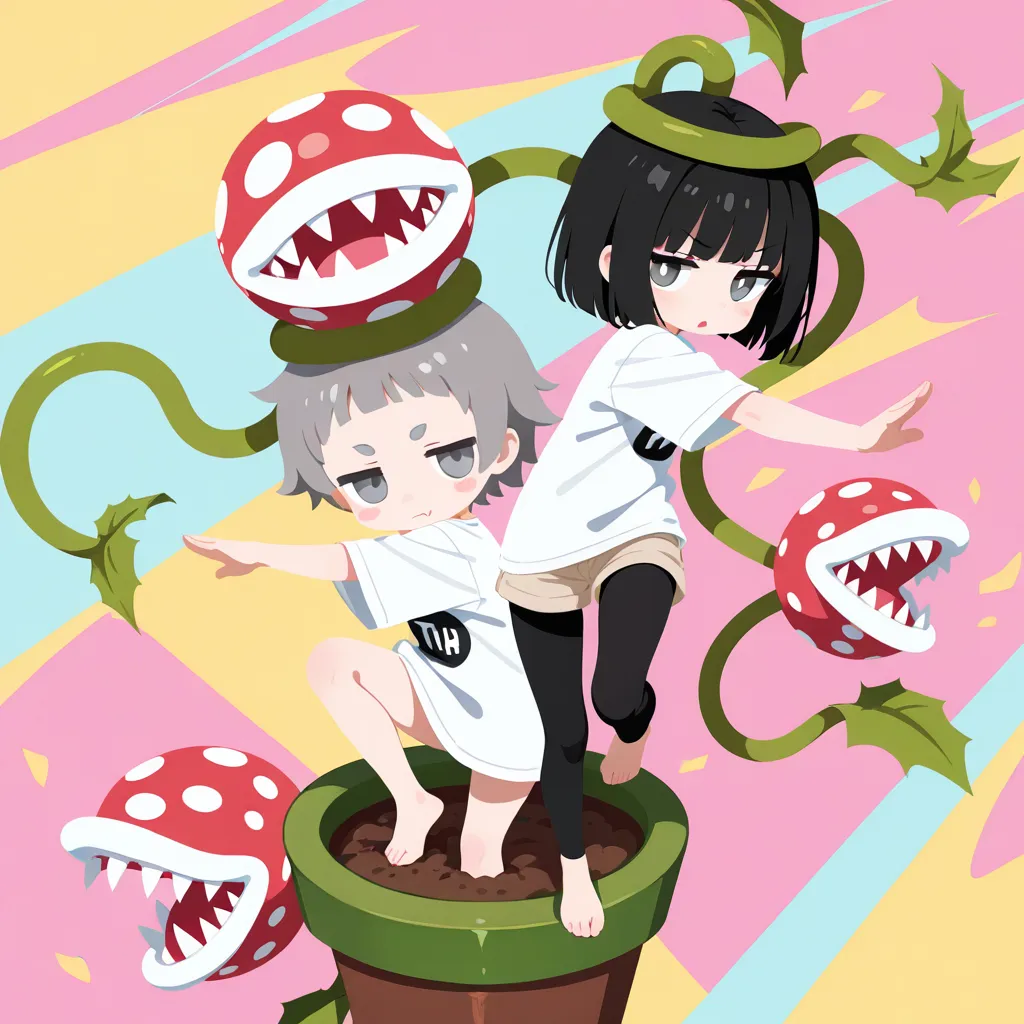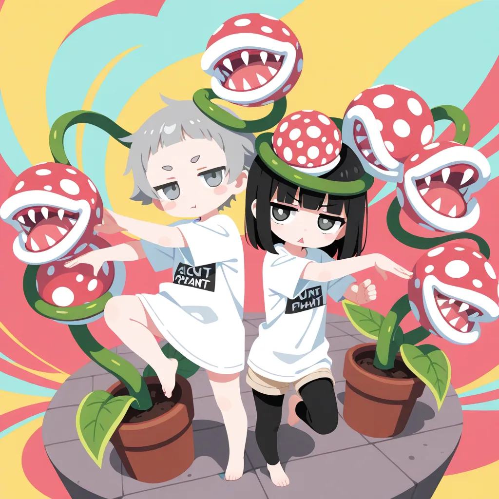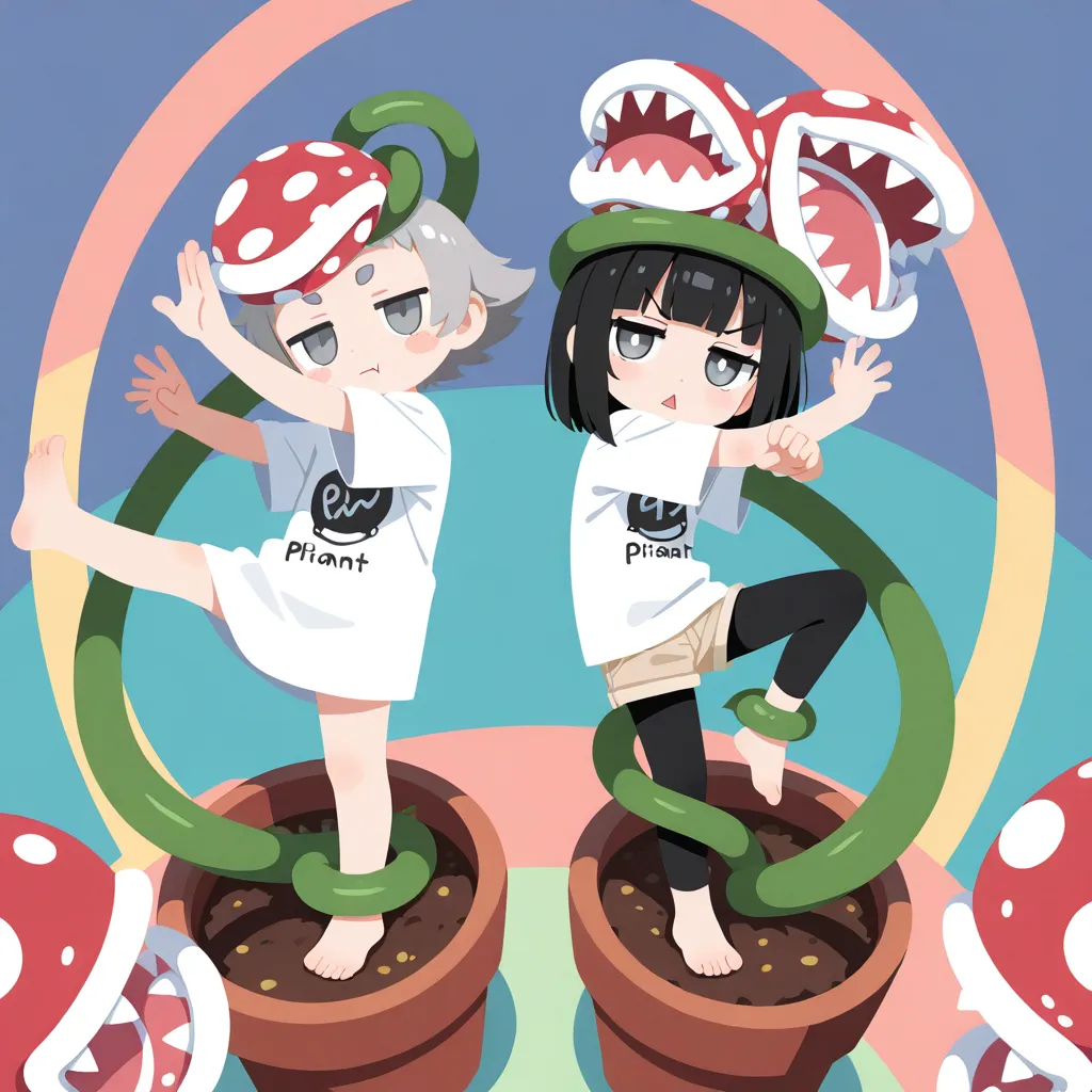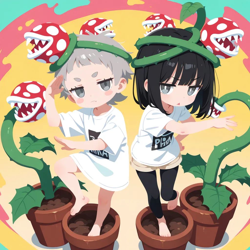 head wreath, (many piranha plant around head:1.5), foot in flower pot, foot under dirt ,