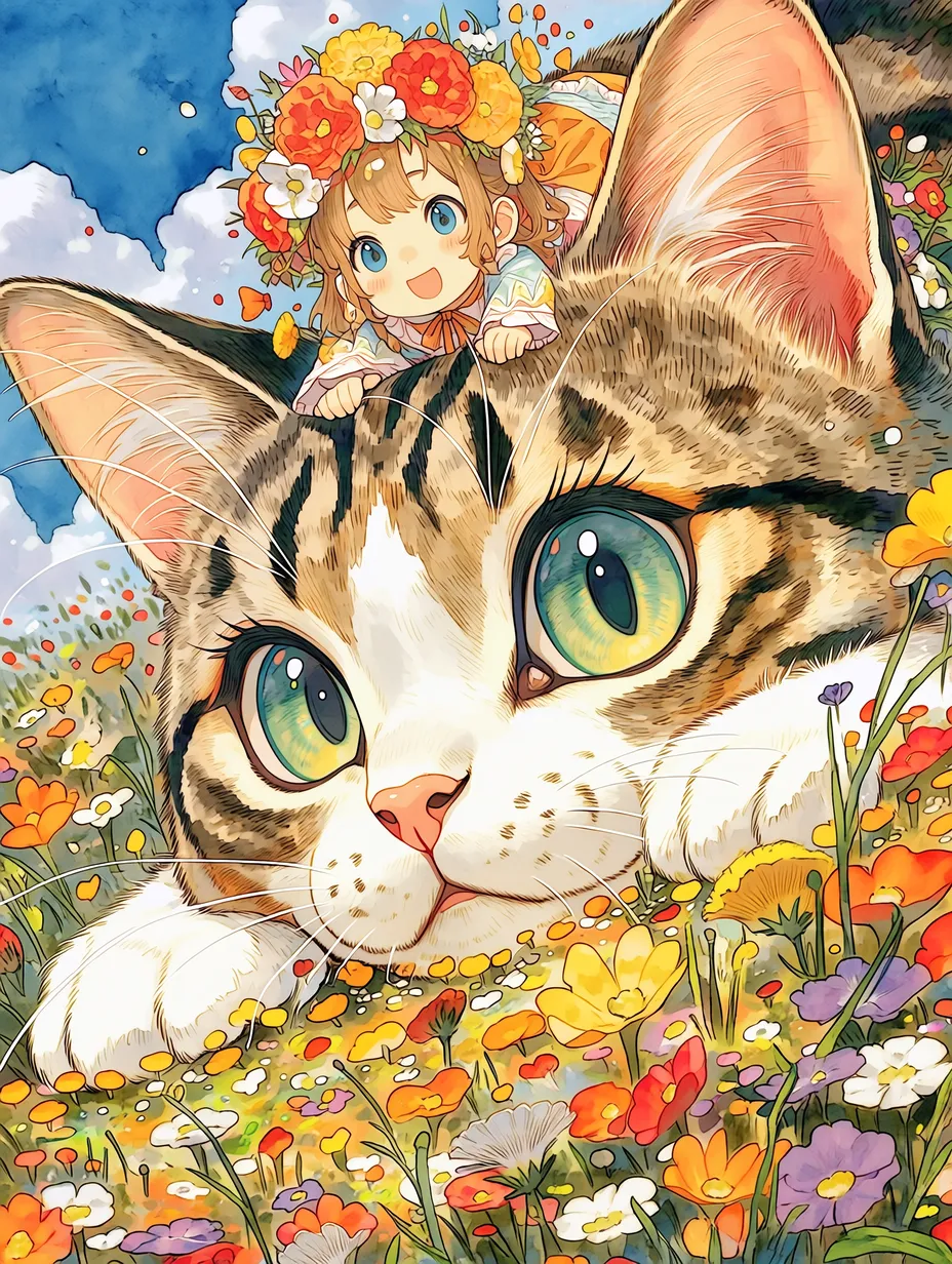 Secret Kiss with the Giant Cat in the Flower Field