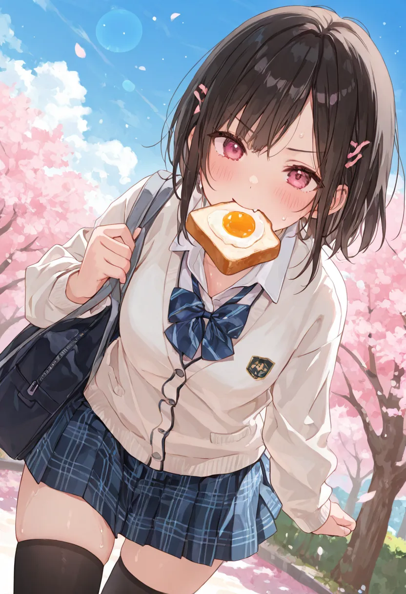 Under the cherry blossom trees bathed in spring sunlight, a girl hurries to school while munching on her fried egg toast. Pink petals dance around her, her cheeks slightly flushed, marking the start of a small daily adventure. With her bag slung over her shoulder and her uniform skirt swaying in the breeze, this moment hints at a special encounter ahead. Her red eyes sparkle, as if telling the story of the day to come.