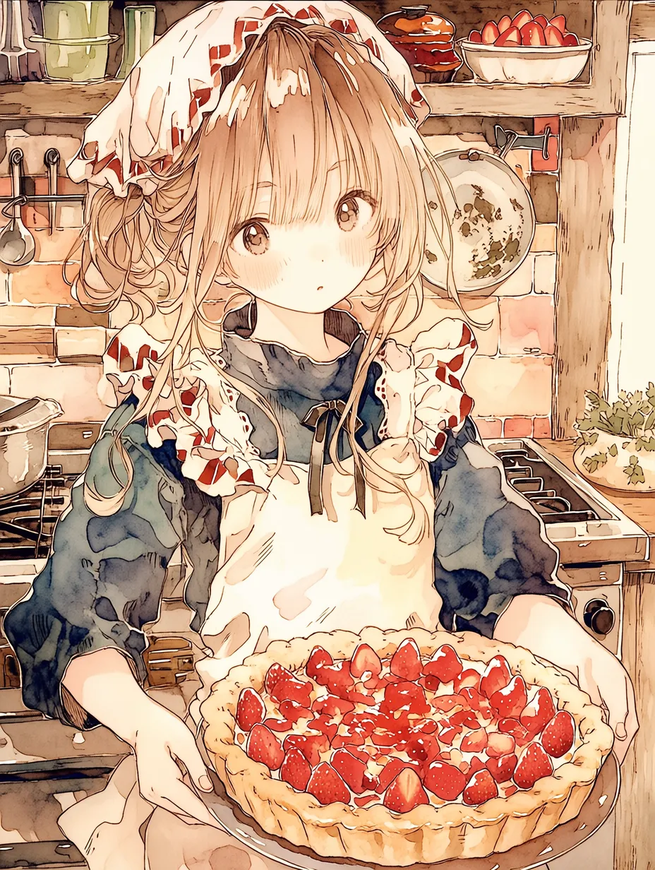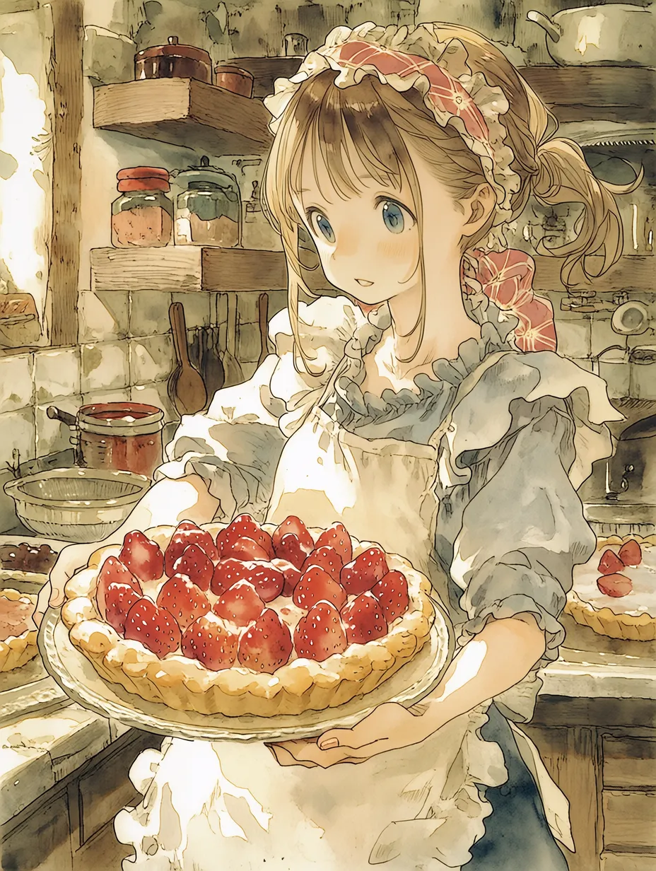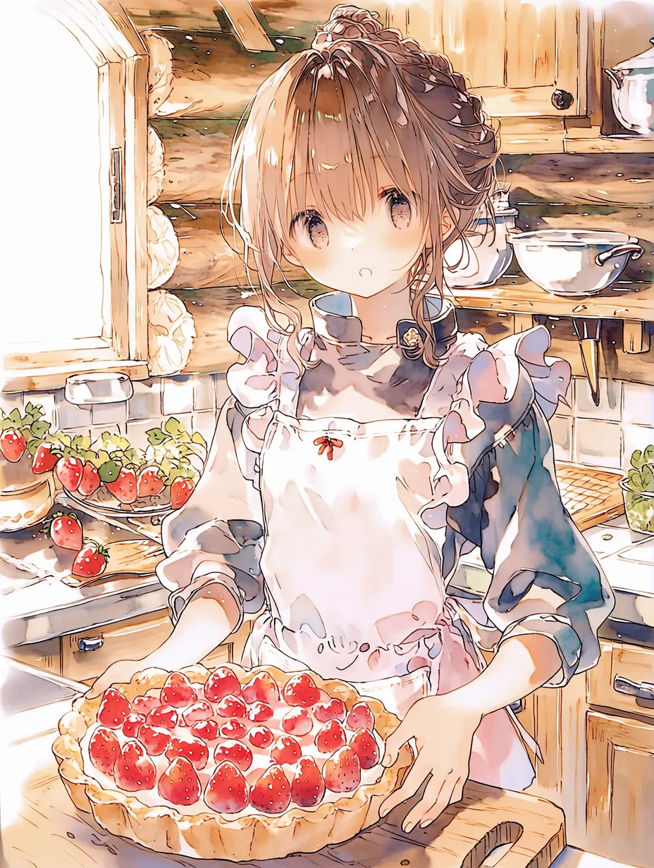 In a cozy kitchen, a young girl immerses herself in baking. Wearing an apron and with her hair tied back, she carefully tops a vibrant strawberry tart. The sweet aroma fills the room, carrying her heartfelt thoughts for someone special. Outside it's rainy, but this moment is a warm magical time. What story will this tart create?