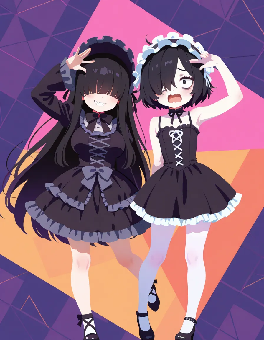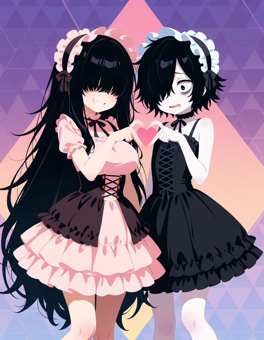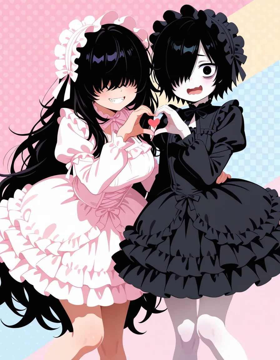 (black hair, messy hair, gothic lolita, frilled dress, black dress, frilled headwear:1.2), heart hands duo, arm up, leg up, looking at viewer,